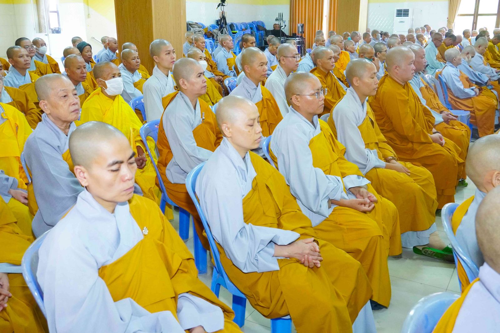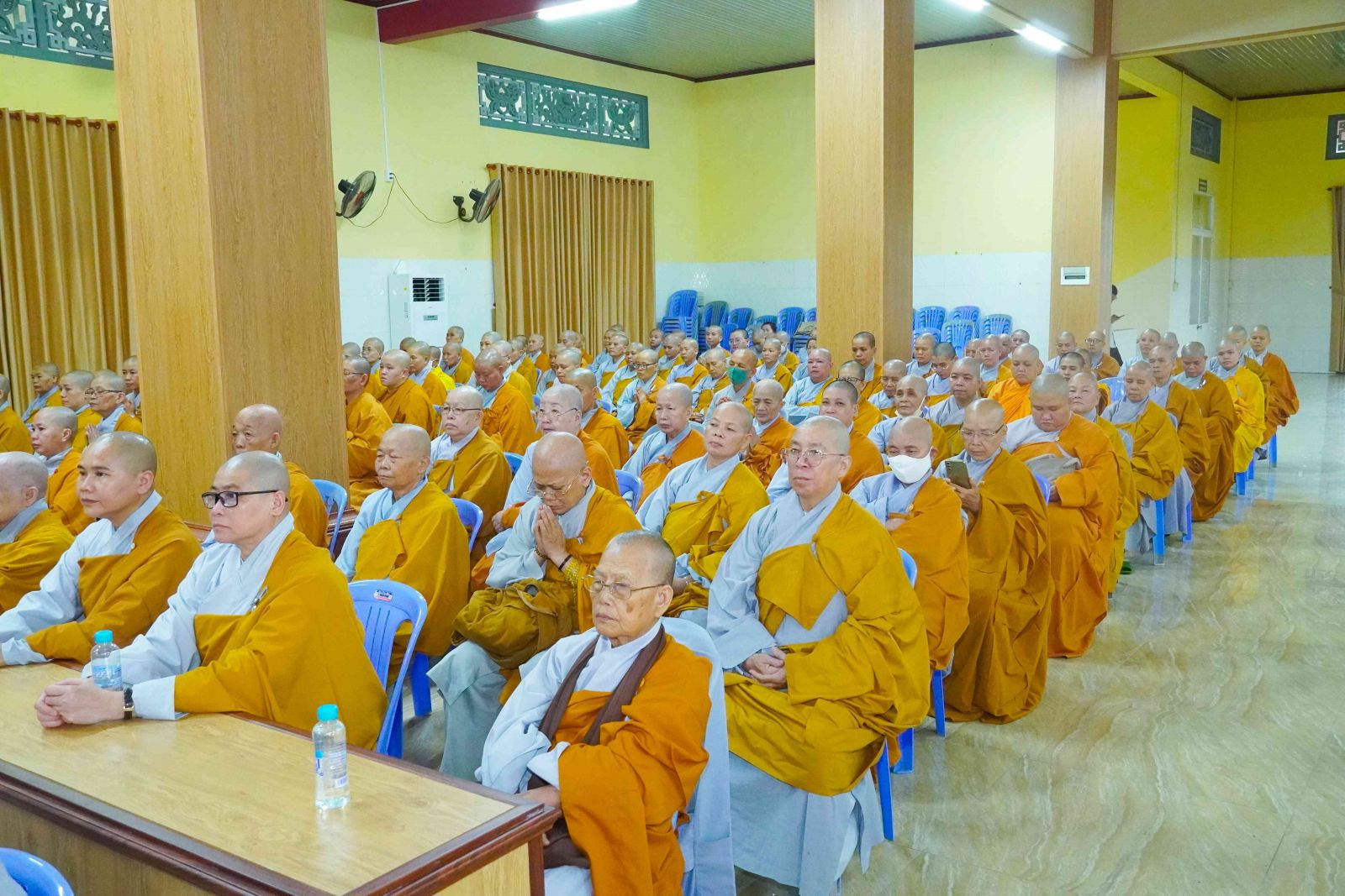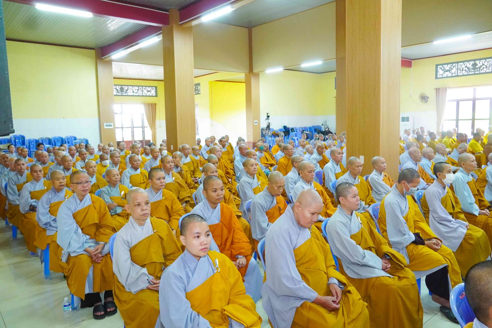 Cuối cùng, buổi lễ trang nghiêm lắng nghe lời sách tấn của HT. Thích Thiện Đạo – Thành viên HĐCM, Chứng minh Ban Trị sự GHPGVN tỉnh. Hòa thượng chỉ dạy rằng: Ba tháng an cư kiết hạ có ý nghĩa rất lớn đối với hàng xuất gia lẫn tại gia. Đó là thời điểm chư Tăng Ni dành trọn thời gian cho việc tu học, thúc liễm thân tâm, trau giồi Giới-Định-Tuệ, đồng thời đây cũng là cơ hội cho hàng Phật tử tại gia phát tâm gieo trồng ruộng phước thông qua việc cúng dường, ngoại hộ, tạo điều kiện thuận lợi cho chư Tăng Ni an cư tu học. An cư kiết hạ cũng là hoạt động củng cố và duy trì nguồn nội lực sau những ngày tháng dấn thân phụng sự đạo pháp, phụng sự chúng sinh. Trong những tháng ngày cấm túc an cư, chư Tăng Ni chẳng những được bồi dưỡng, phát triển trình độ tu học Phật pháp, tăng trưởng công đức, giới hạnh, đạo lực, mà còn có dịp thực hành đời sống tập thể theo tinh thần lục hòa, có cơ hội trao đổi sẻ chia những kiến giải, kinh nghiệm tu hành, đồng thời thể hiện tình huynh đệ, tinh thần hòa hợp như nước với sữa.