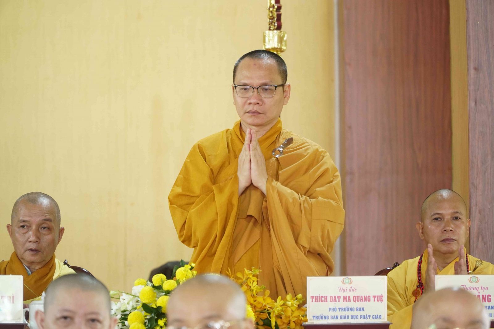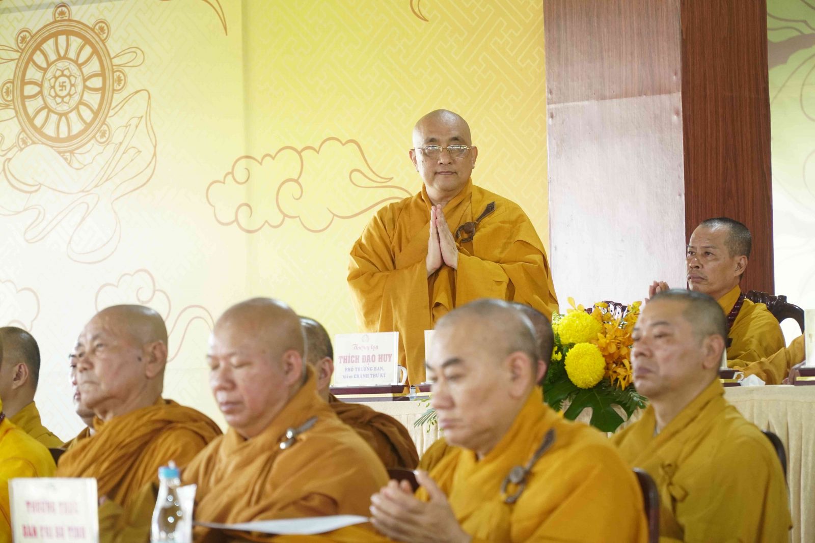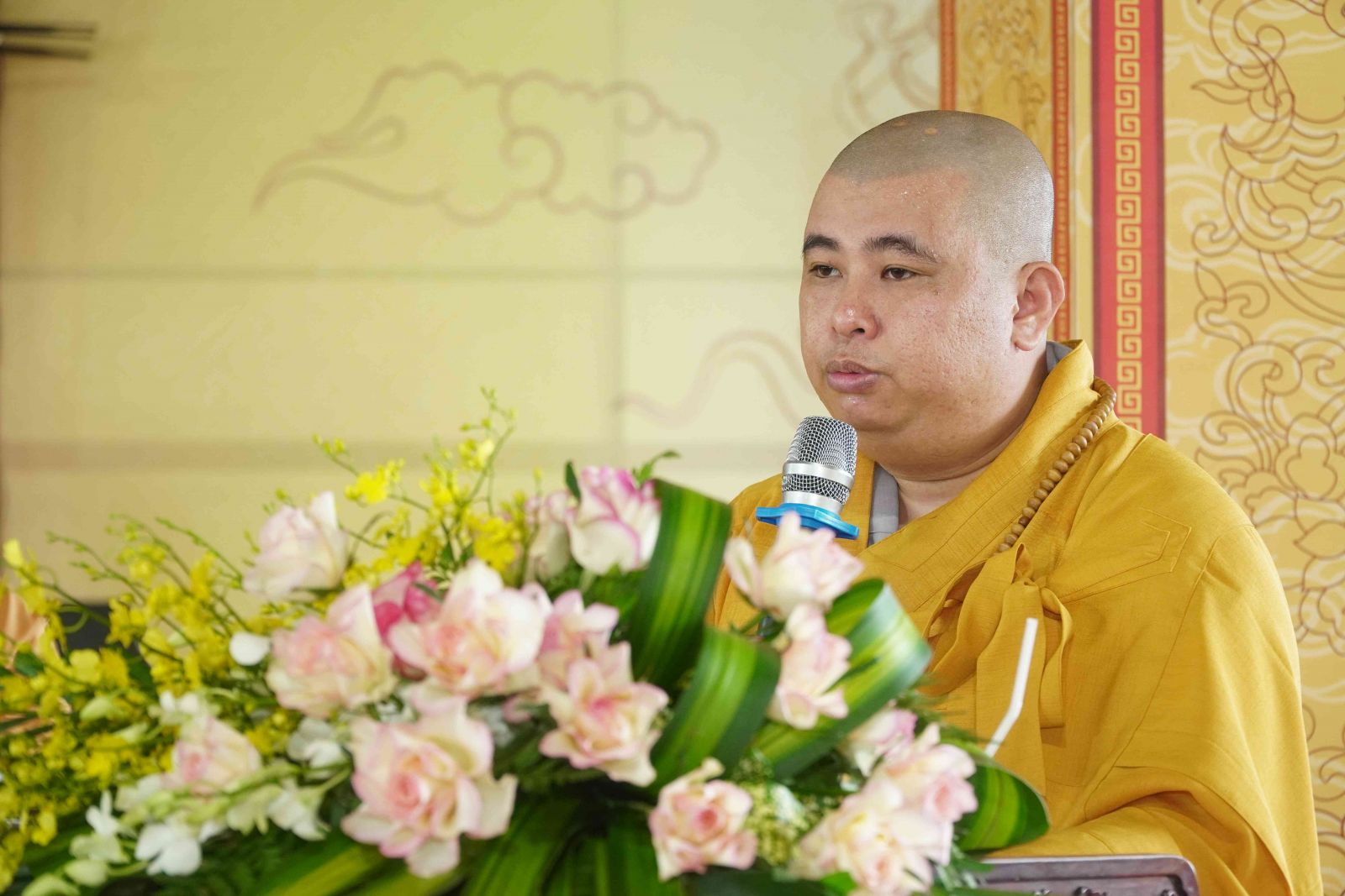sau phần phát biểu khai mạc của Thượng tọa Trưởng Ban Trị sự, ĐĐ. Thích Đạt ma Đức Long đã thay mặt cho Ban Thư ký báo cáo công tác Tổ chức An cư Kiết hạ đối với các Hạ trường trong toàn tỉnh.