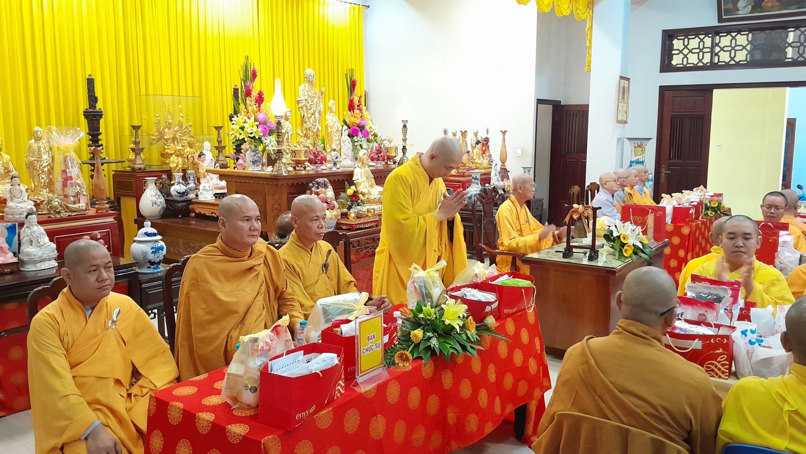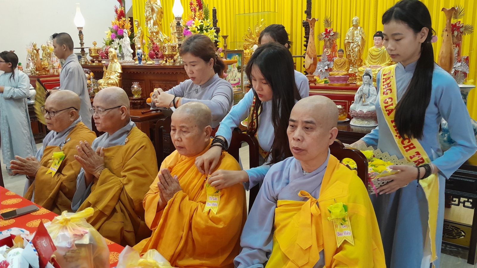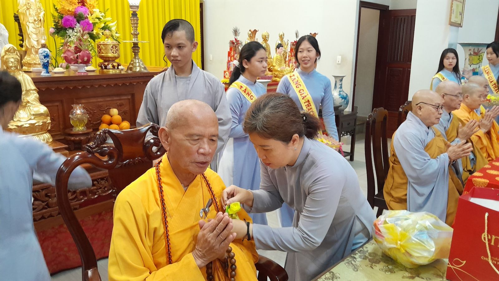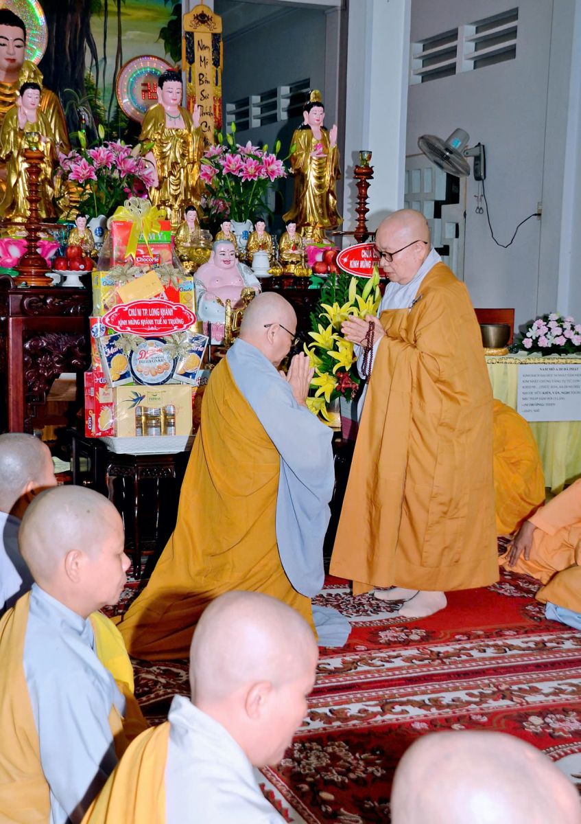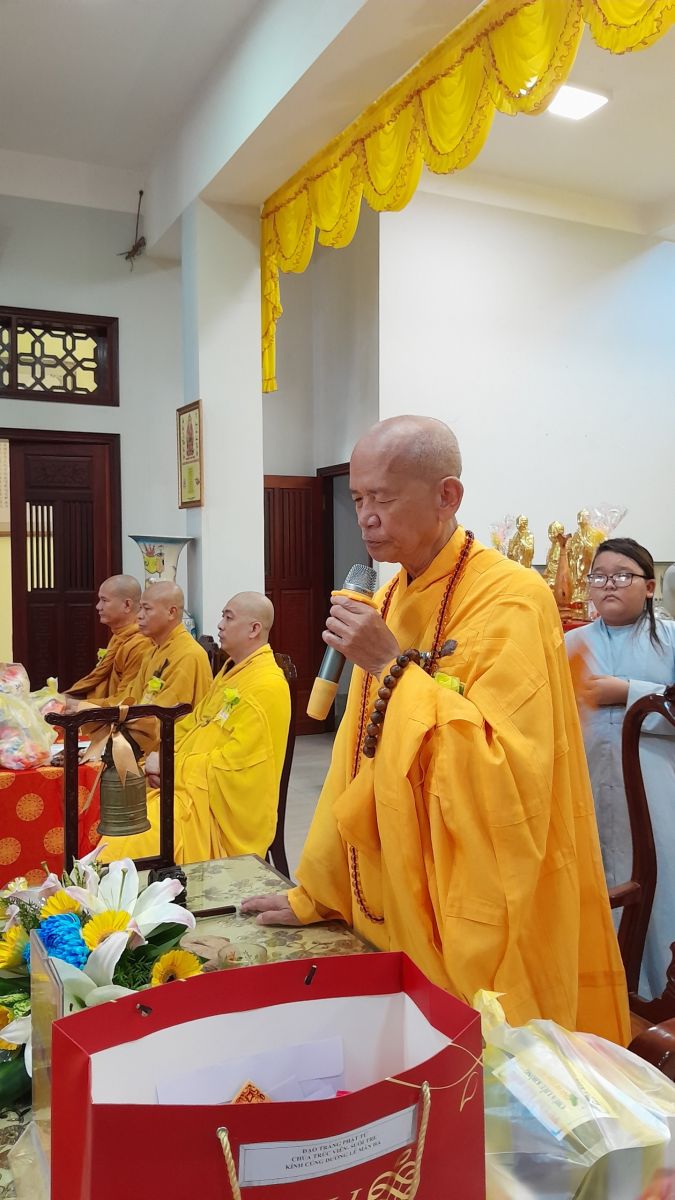 Sau đó, đại diện các đạo tràng, các chúng, Ban Hướng Dẫn GĐPTĐN đã có lời tác bạch kính mừng khánh tuế đến Chư Tôn Đức thêm một tuổi đạo, là chỗ dựa tinh thần cho hàng Phật tử nương tựa tu tập và chuyển hóa. Những hoa vàng cài lên những chiếc y vàng giải thoát. Và theo thứ tự đãnh lễ, dâng tịnh tài tịnh vật lên Chư Tôn Đức.