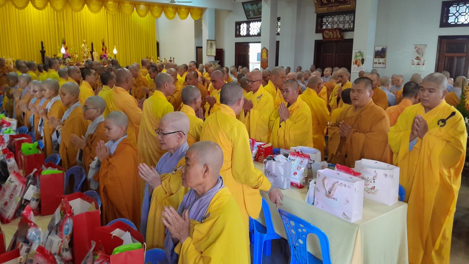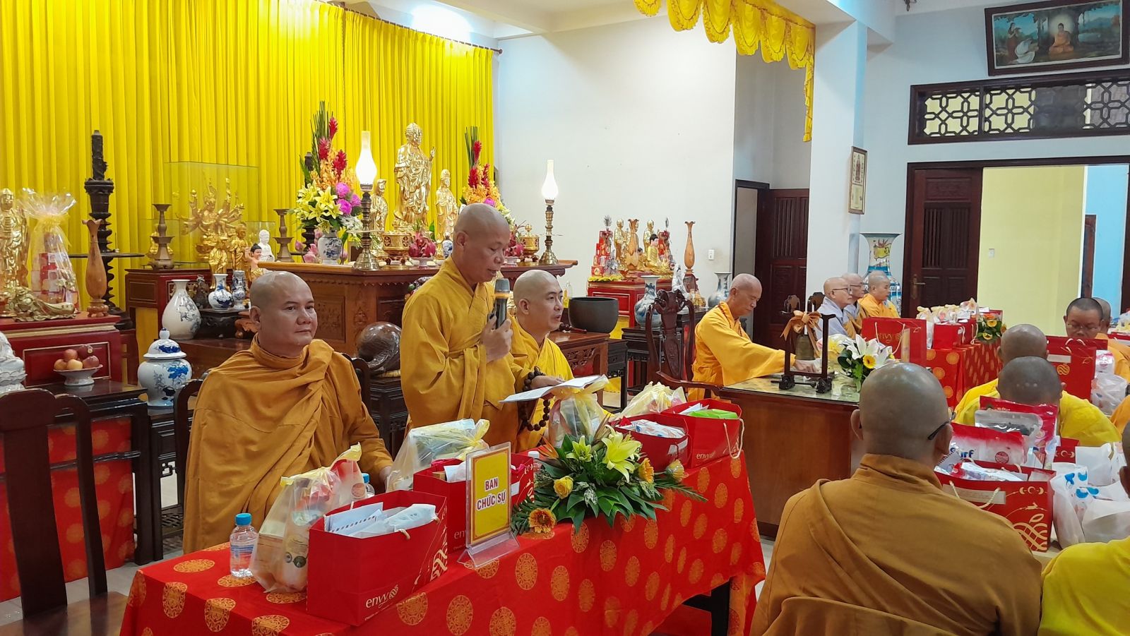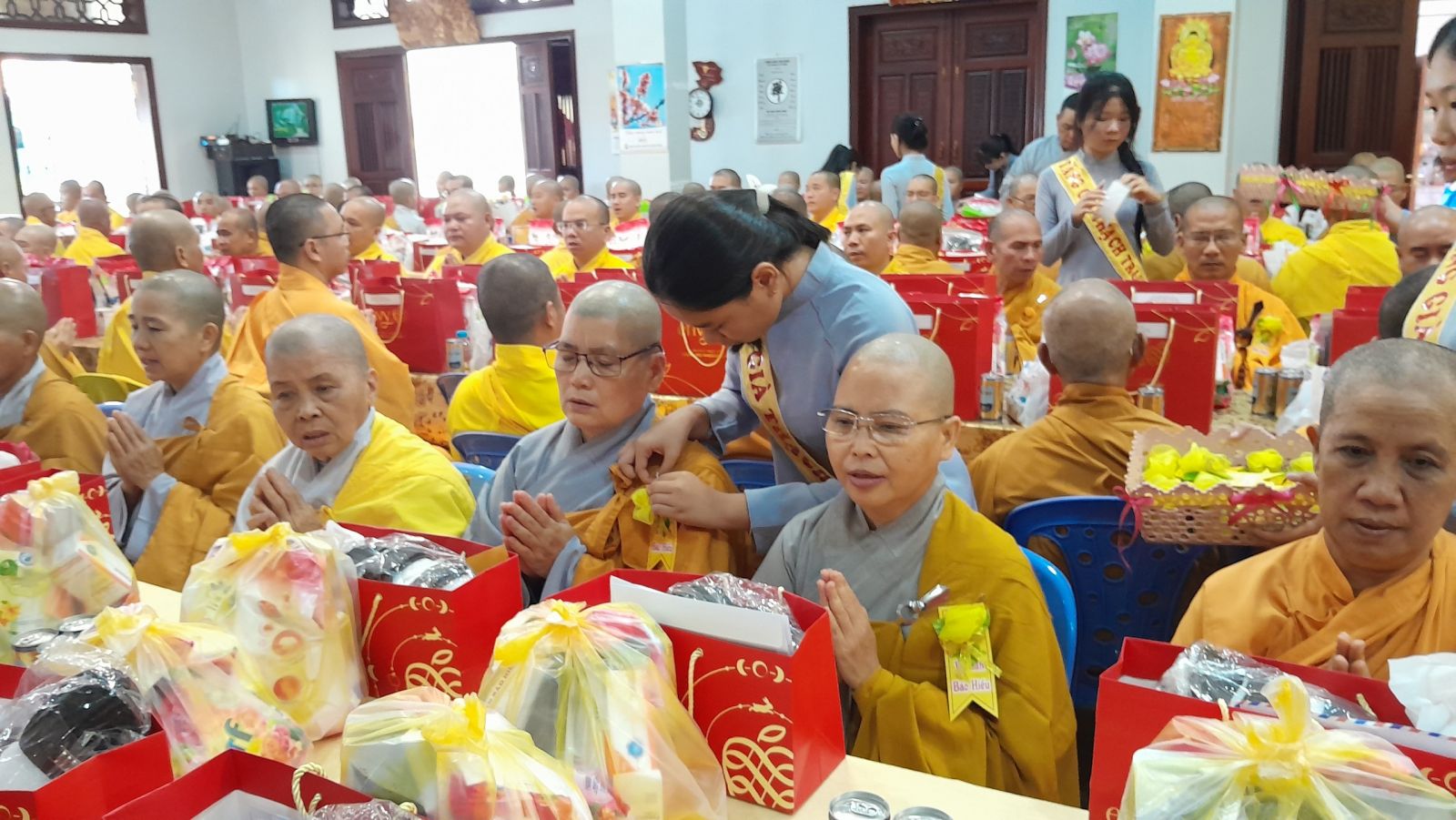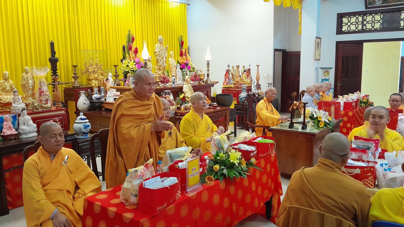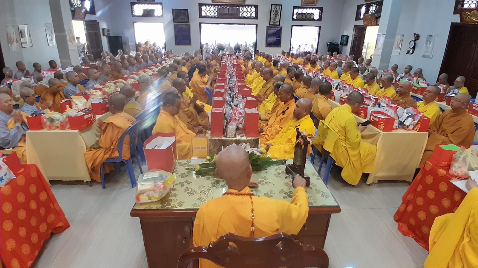 Sau đó, đại diện các đạo tràng, các chúng, Ban Hướng Dẫn GĐPTĐN đã có lời tác bạch kính mừng khánh tuế đến Chư Tôn Đức thêm một tuổi đạo, là chỗ dựa tinh thần cho hàng Phật tử nương tựa tu tập và chuyển hóa. Những hoa vàng cài lên những chiếc y vàng giải thoát. Và theo thứ tự đãnh lễ, dâng tịnh tài tịnh vật lên Chư Tôn Đức.