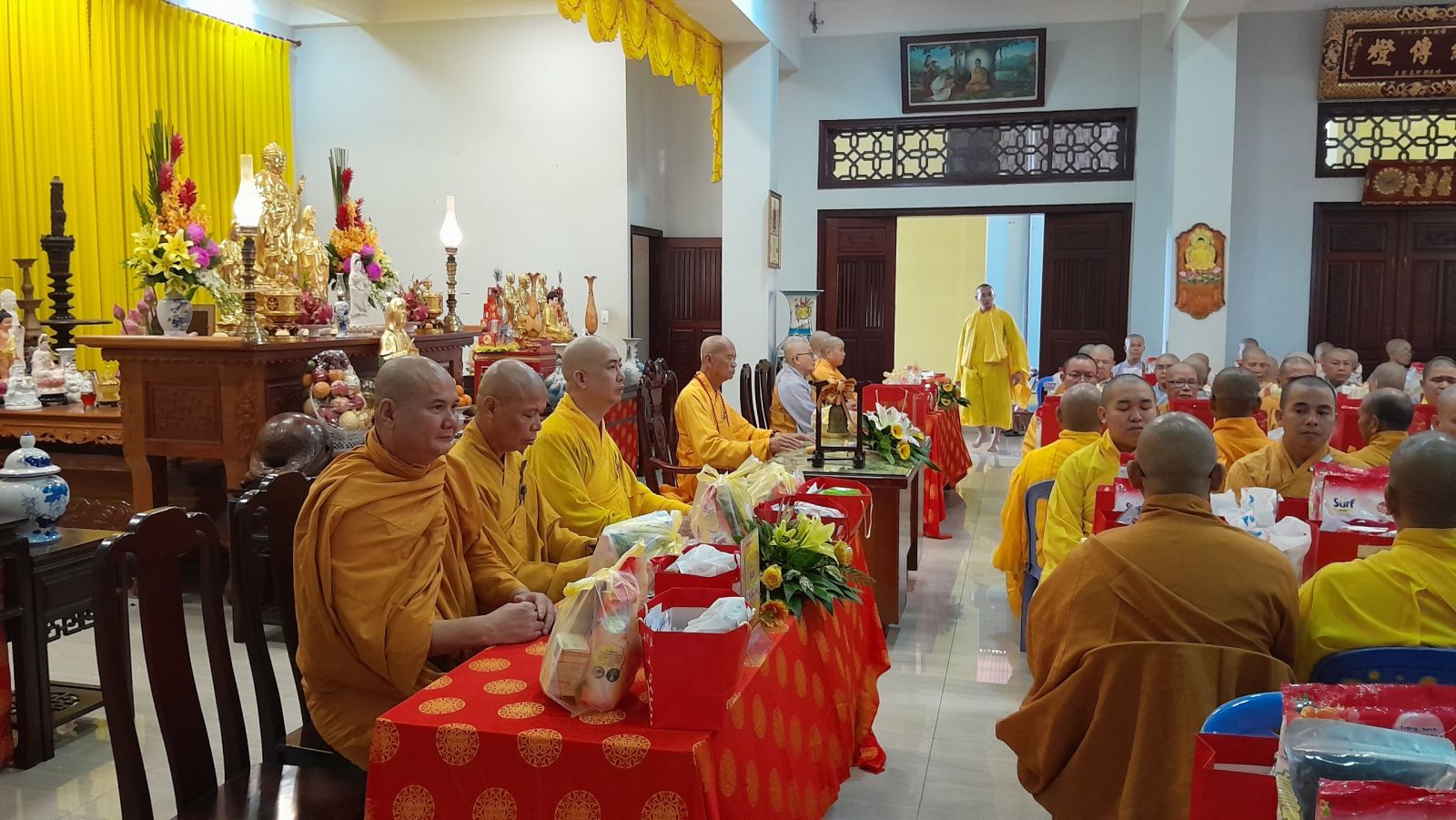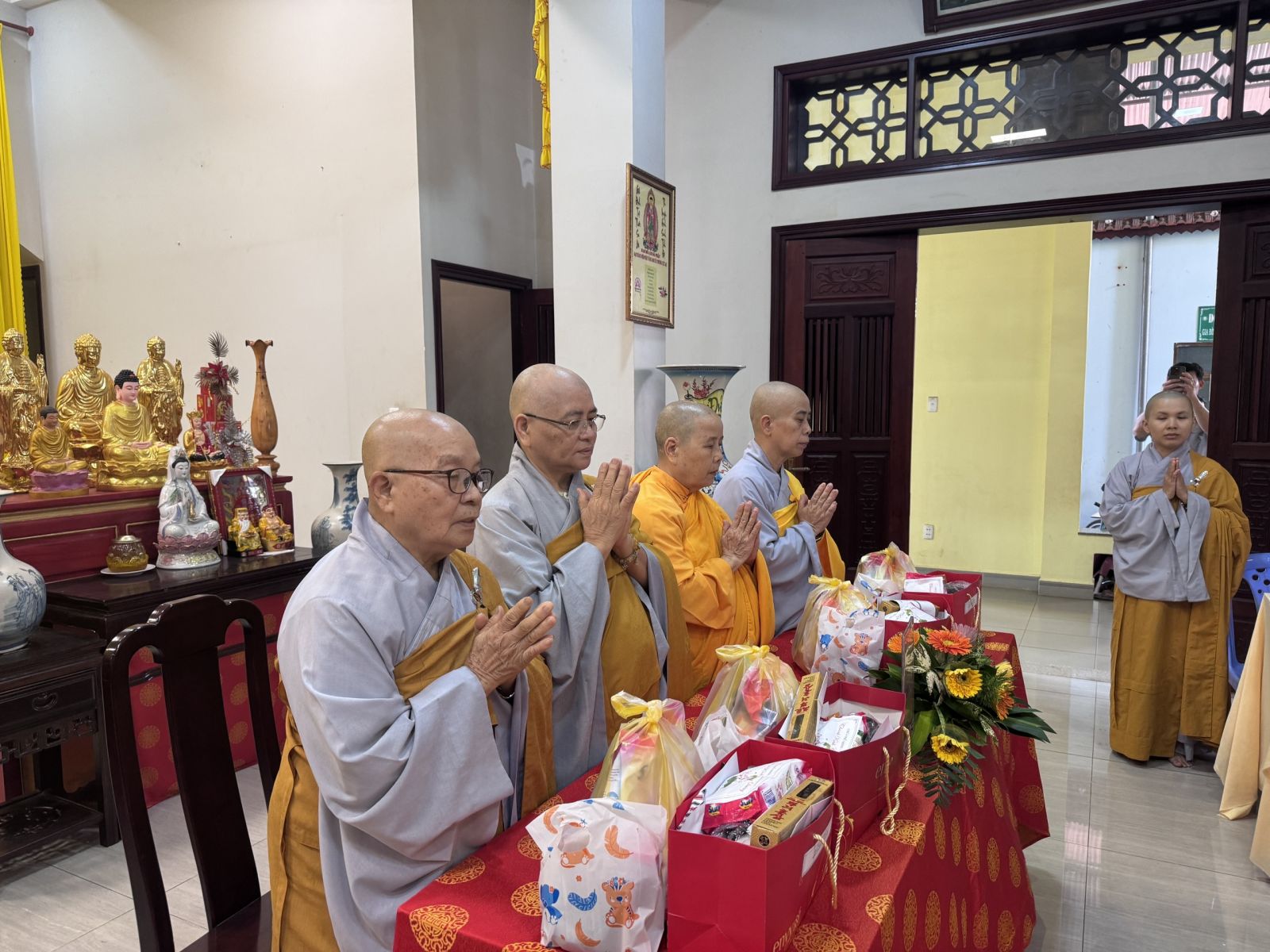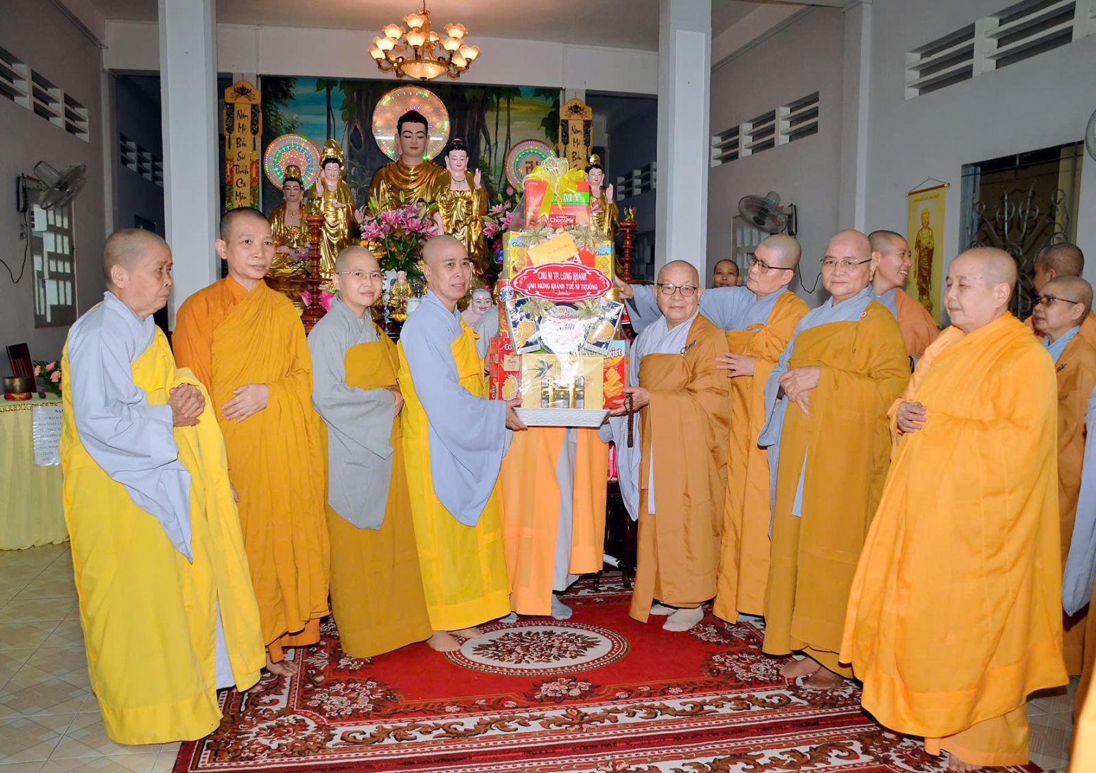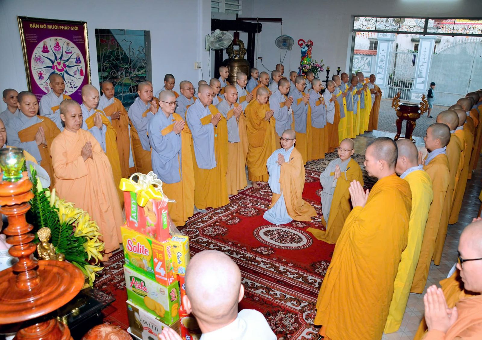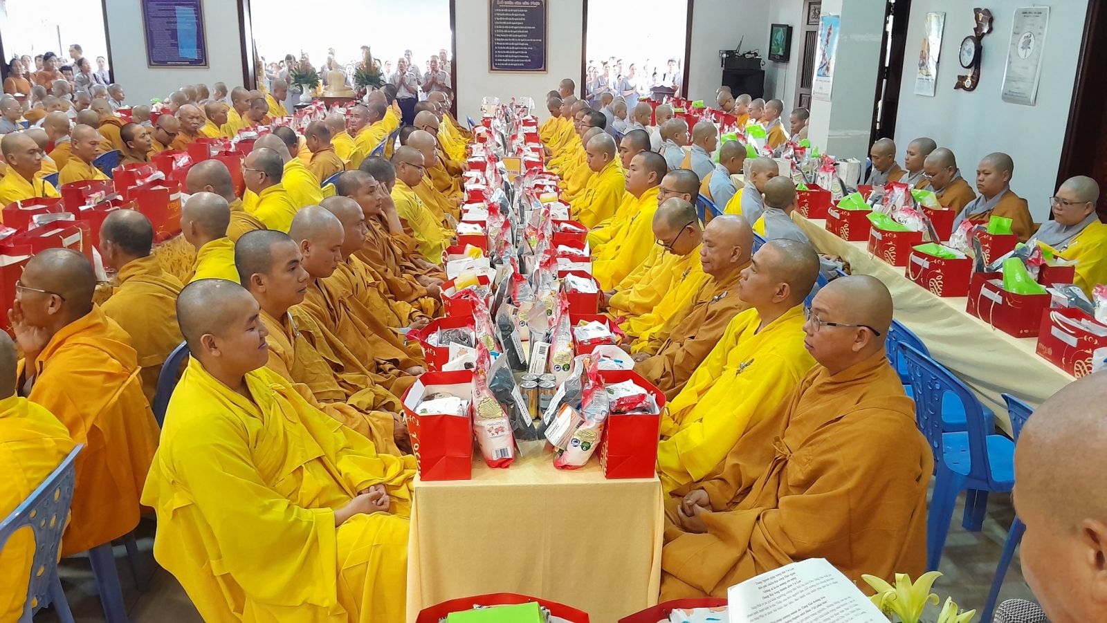 Sau đó, đại diện các đạo tràng, các chúng, Ban Hướng Dẫn GĐPTĐN đã có lời tác bạch kính mừng khánh tuế đến Chư Tôn Đức thêm một tuổi đạo, là chỗ dựa tinh thần cho hàng Phật tử nương tựa tu tập và chuyển hóa. Những hoa vàng cài lên những chiếc y vàng giải thoát. Và theo thứ tự đãnh lễ, dâng tịnh tài tịnh vật lên Chư Tôn Đức.