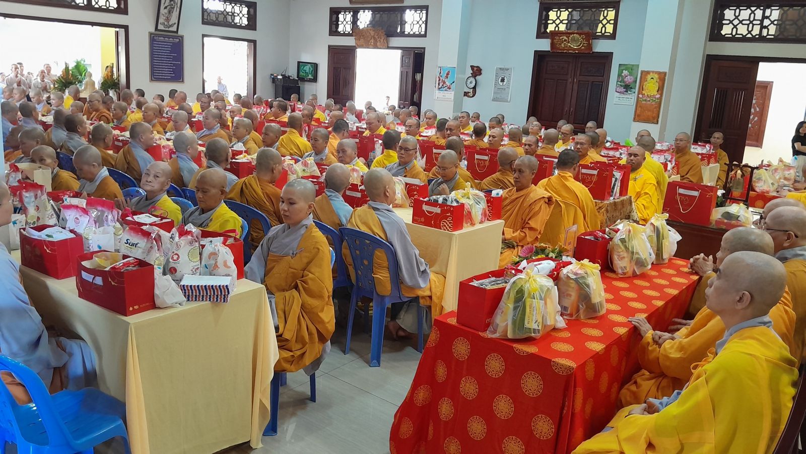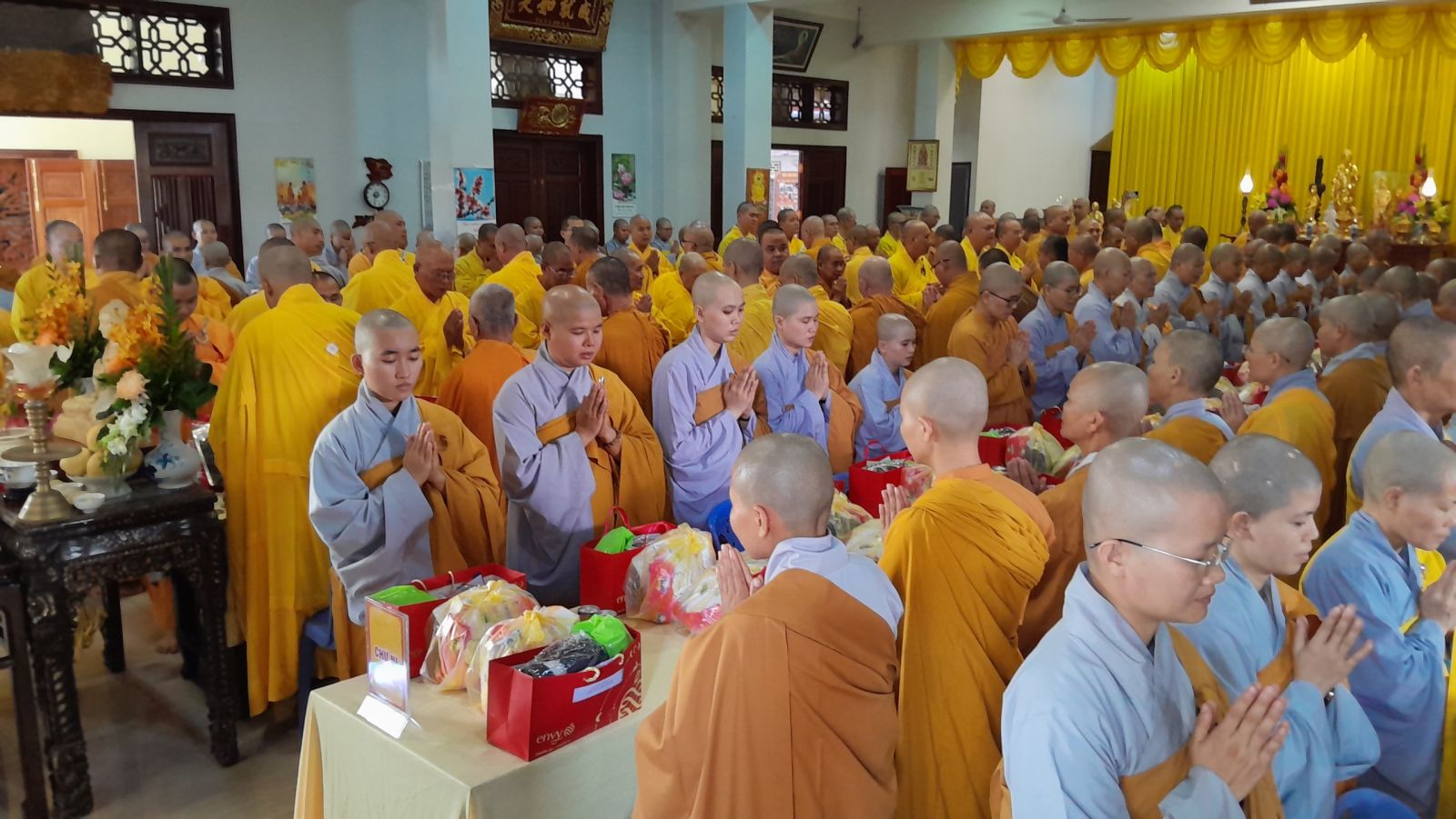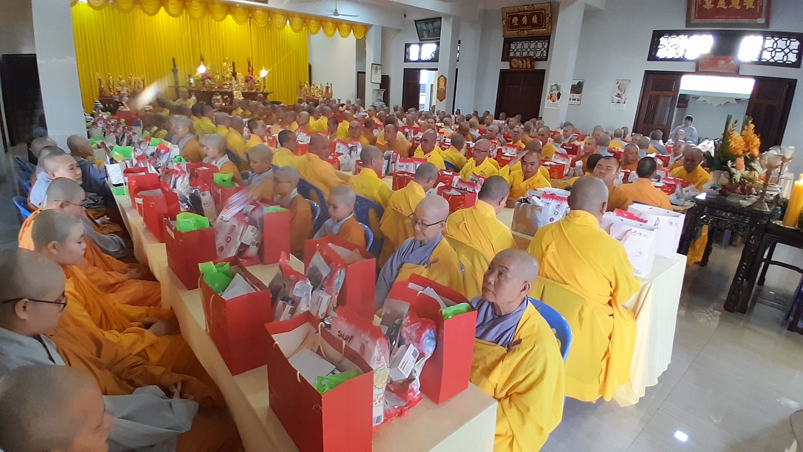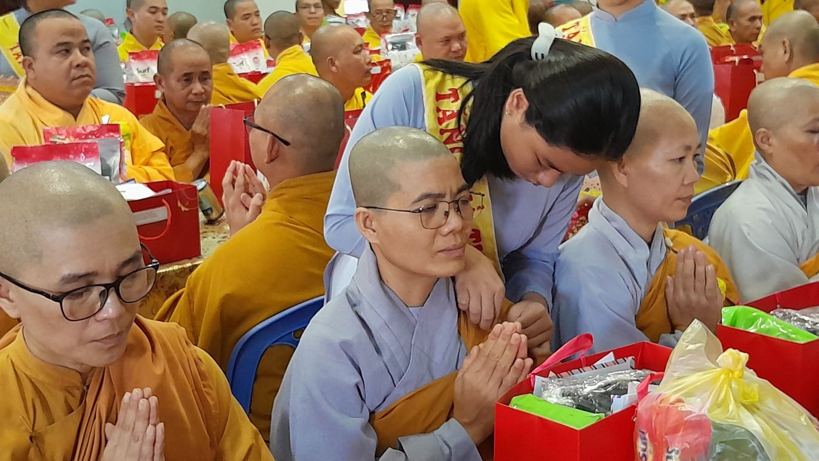 Sau đó, đại diện các đạo tràng, các chúng, Ban Hướng Dẫn GĐPTĐN đã có lời tác bạch kính mừng khánh tuế đến Chư Tôn Đức thêm một tuổi đạo, là chỗ dựa tinh thần cho hàng Phật tử nương tựa tu tập và chuyển hóa. Những hoa vàng cài lên những chiếc y vàng giải thoát. Và theo thứ tự đãnh lễ, dâng tịnh tài tịnh vật lên Chư Tôn Đức.