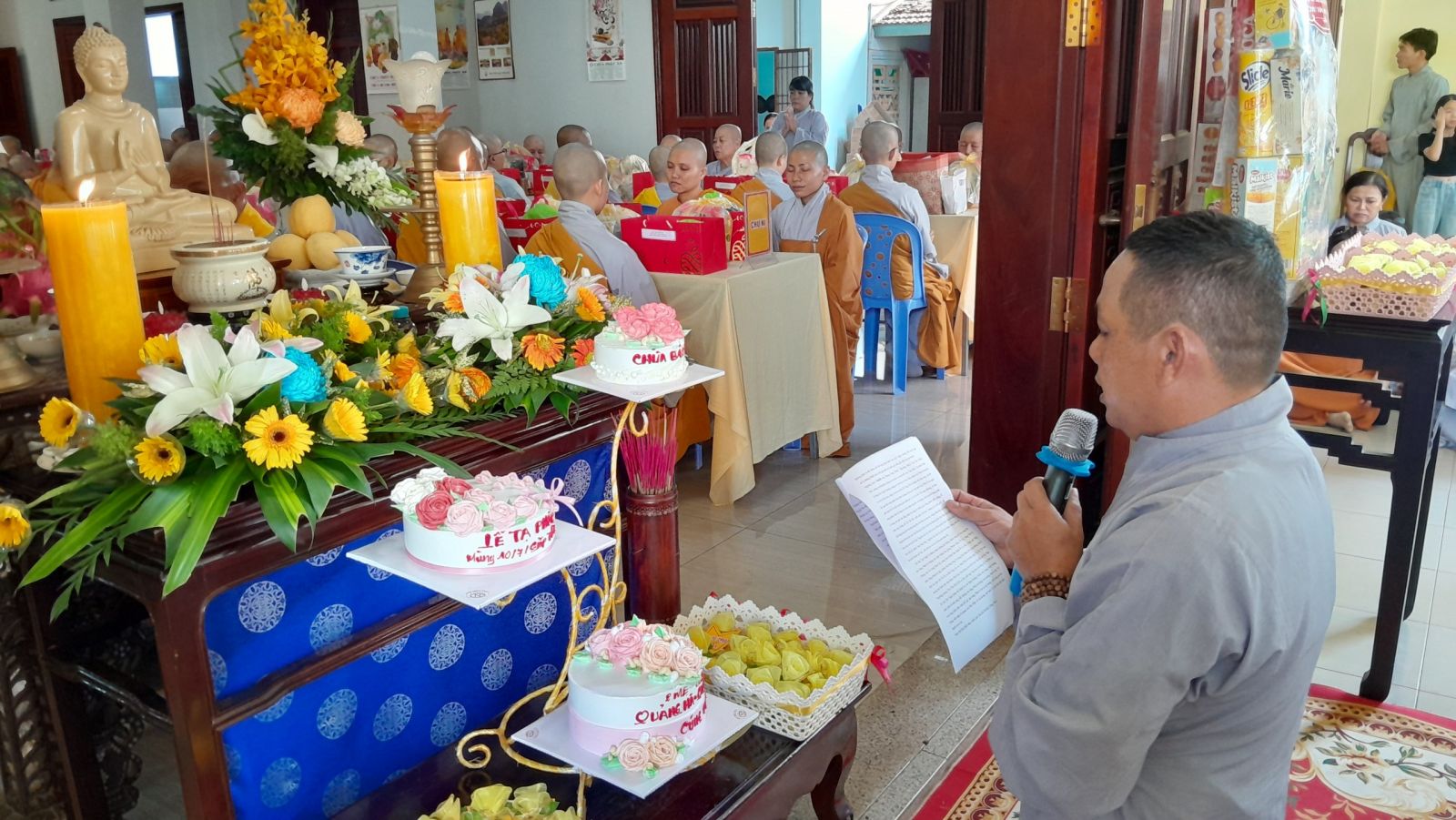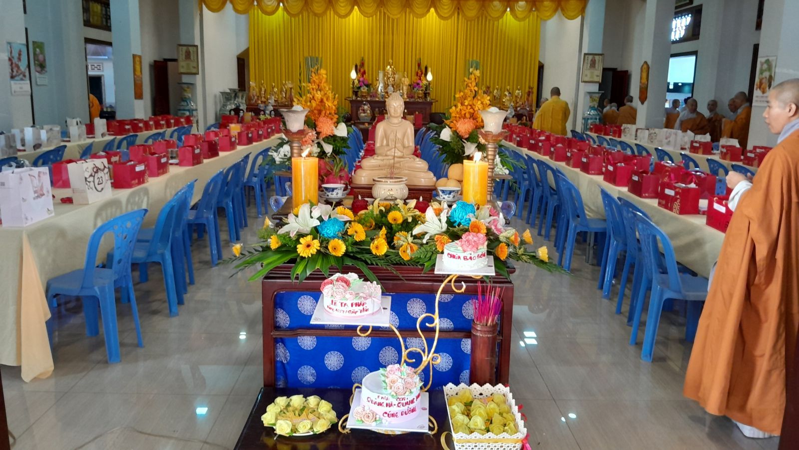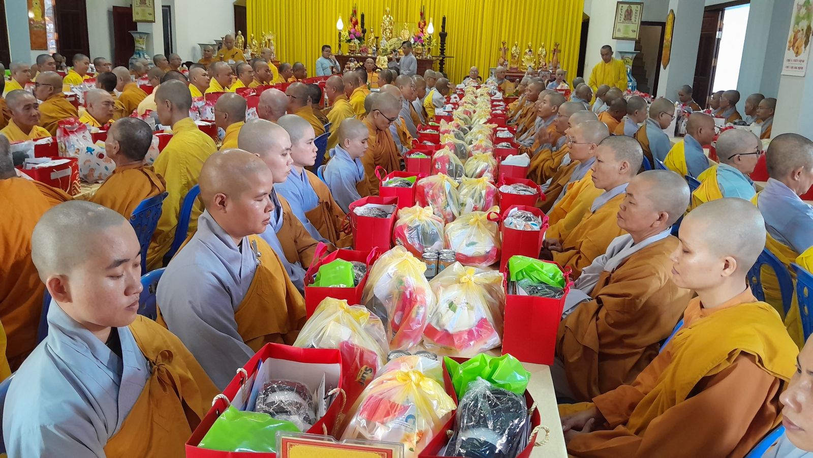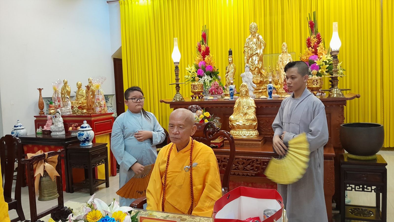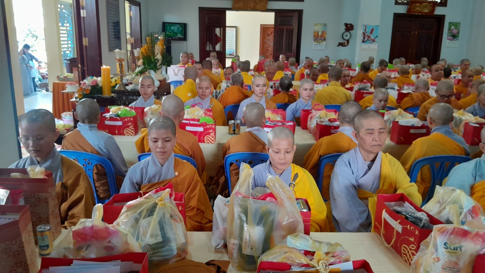 Sau đó, đại diện các đạo tràng, các chúng, Ban Hướng Dẫn GĐPTĐN đã có lời tác bạch kính mừng khánh tuế đến Chư Tôn Đức thêm một tuổi đạo, là chỗ dựa tinh thần cho hàng Phật tử nương tựa tu tập và chuyển hóa. Những hoa vàng cài lên những chiếc y vàng giải thoát. Và theo thứ tự đãnh lễ, dâng tịnh tài tịnh vật lên Chư Tôn Đức.