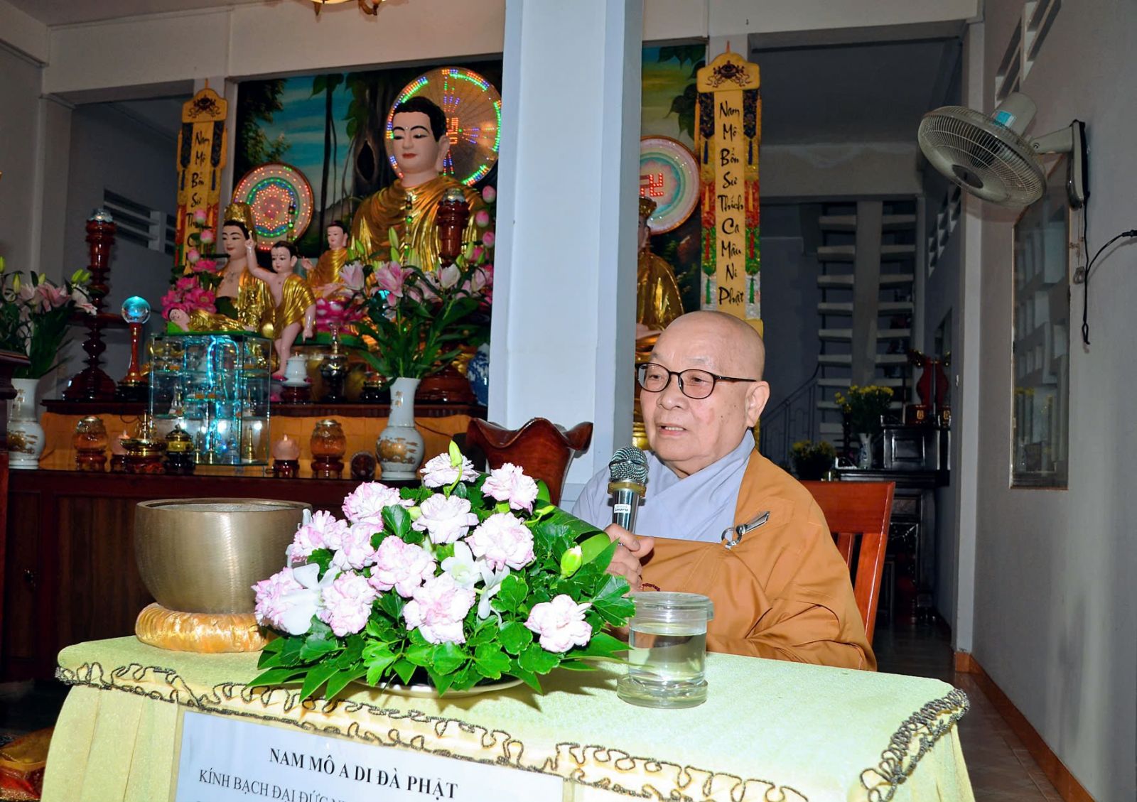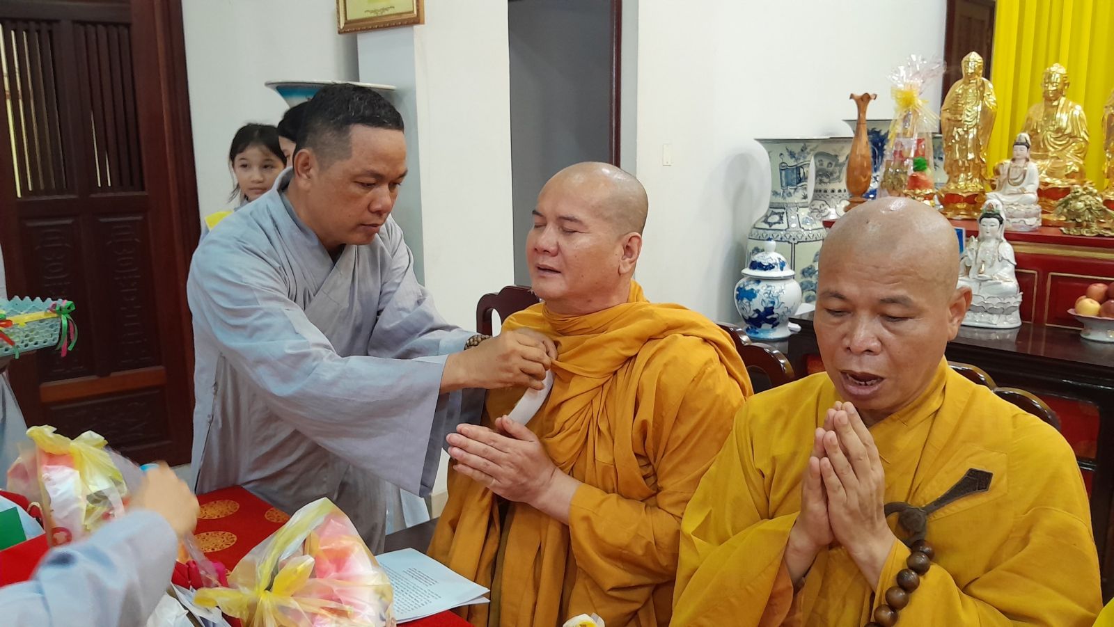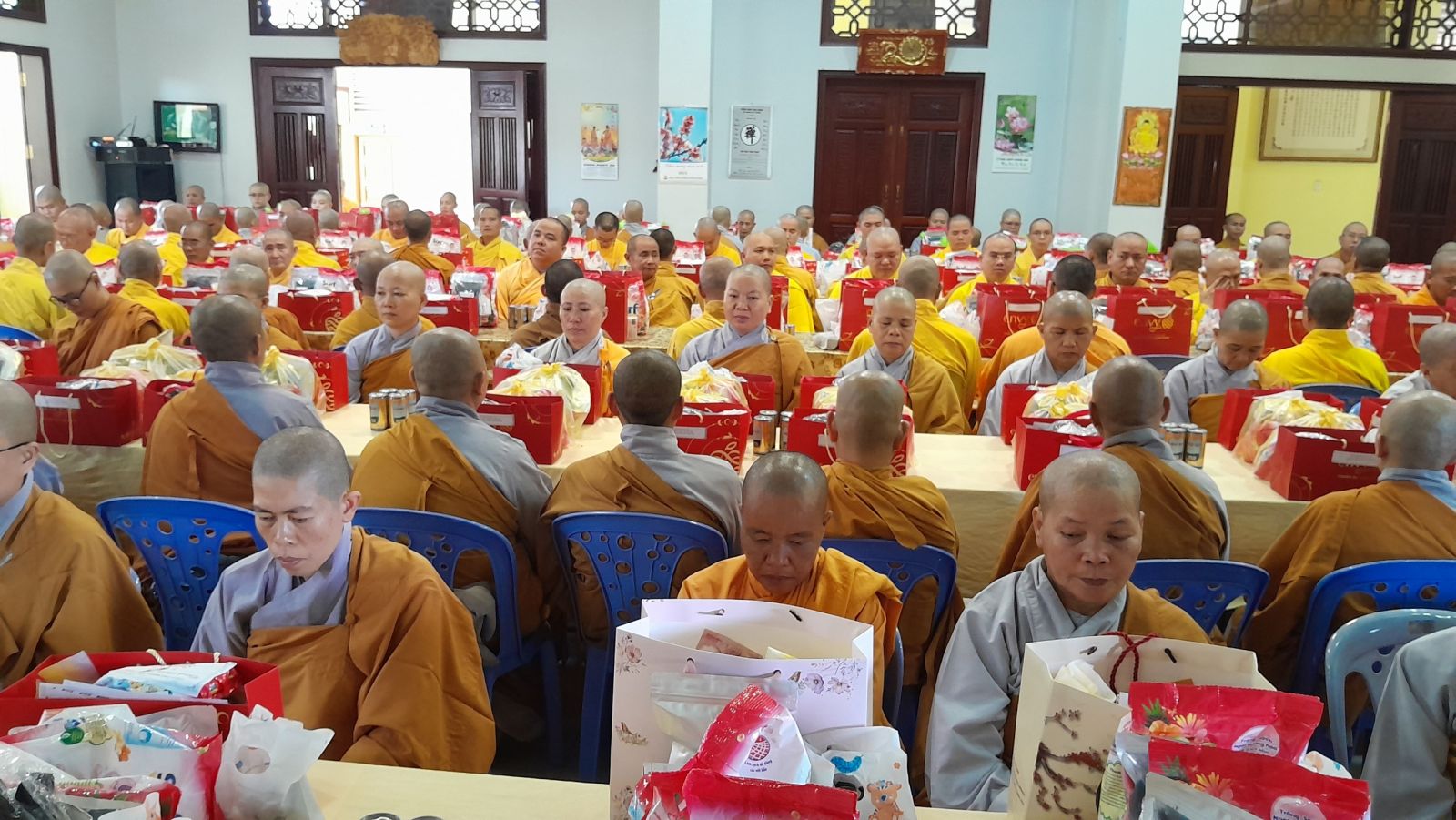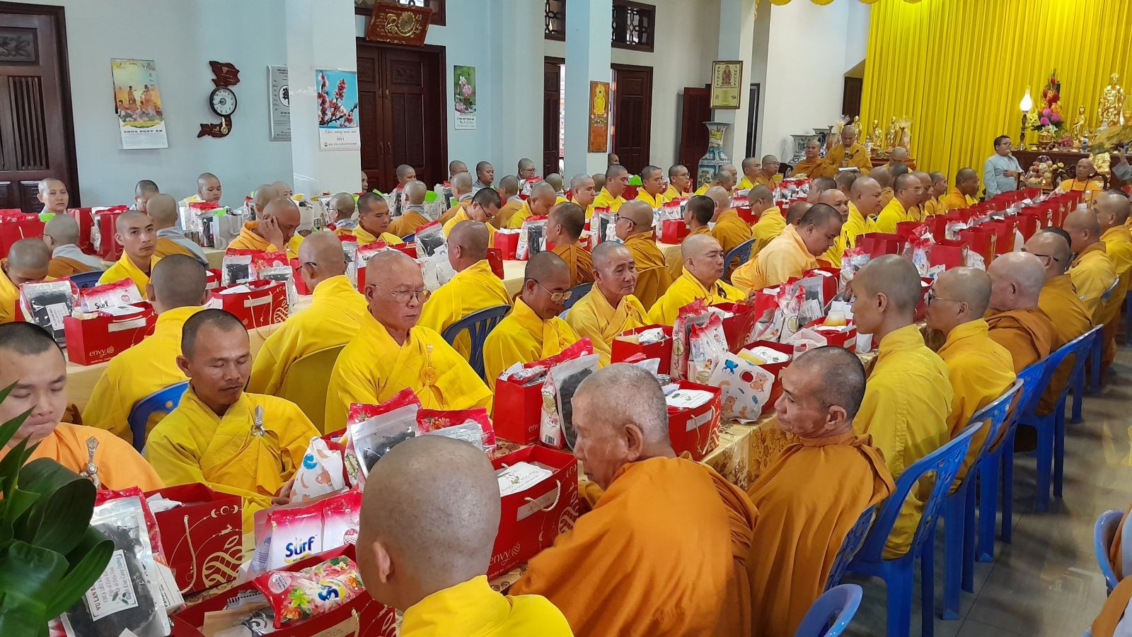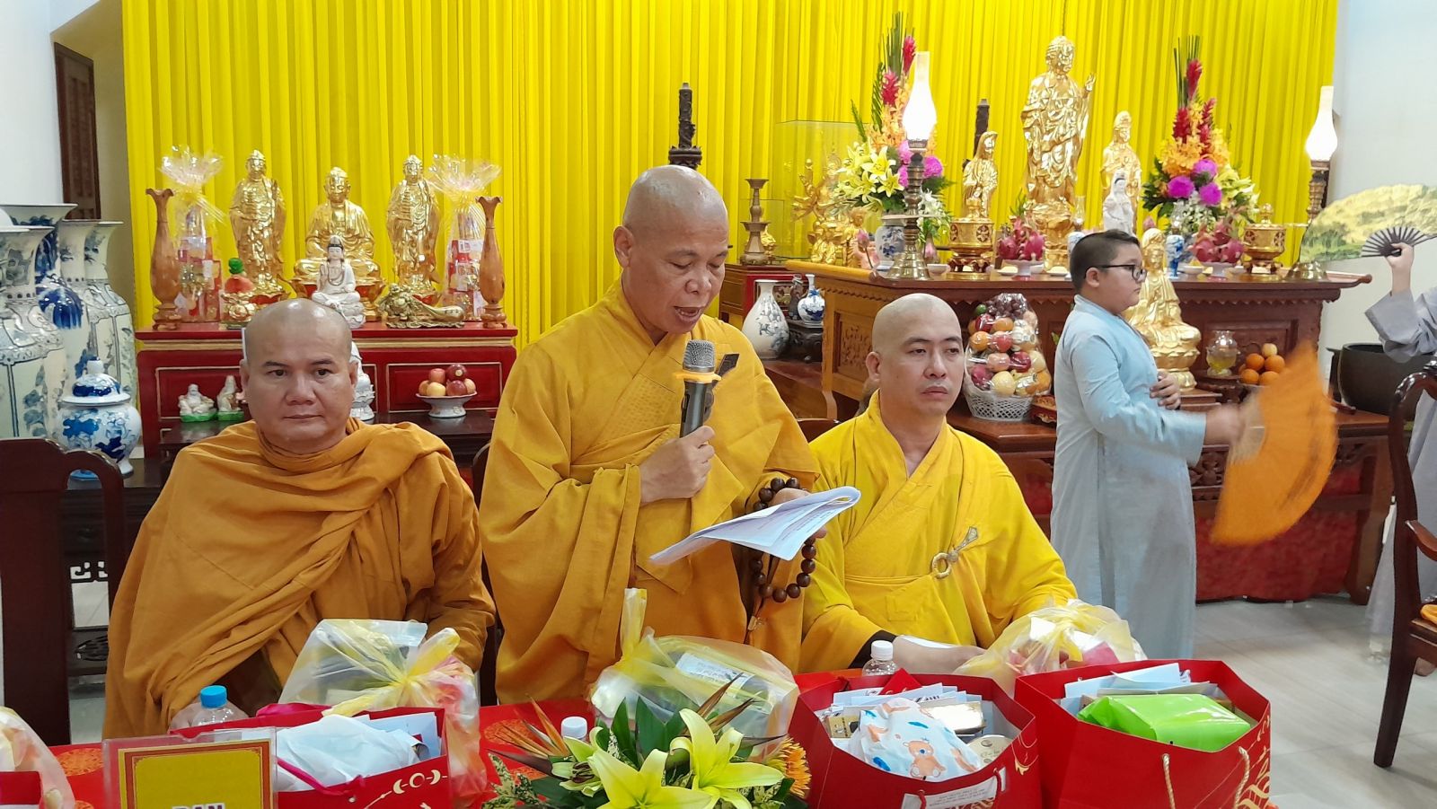 Sau đó, đại diện các đạo tràng, các chúng, Ban Hướng Dẫn GĐPTĐN đã có lời tác bạch kính mừng khánh tuế đến Chư Tôn Đức thêm một tuổi đạo, là chỗ dựa tinh thần cho hàng Phật tử nương tựa tu tập và chuyển hóa. Những hoa vàng cài lên những chiếc y vàng giải thoát. Và theo thứ tự đãnh lễ, dâng tịnh tài tịnh vật lên Chư Tôn Đức.