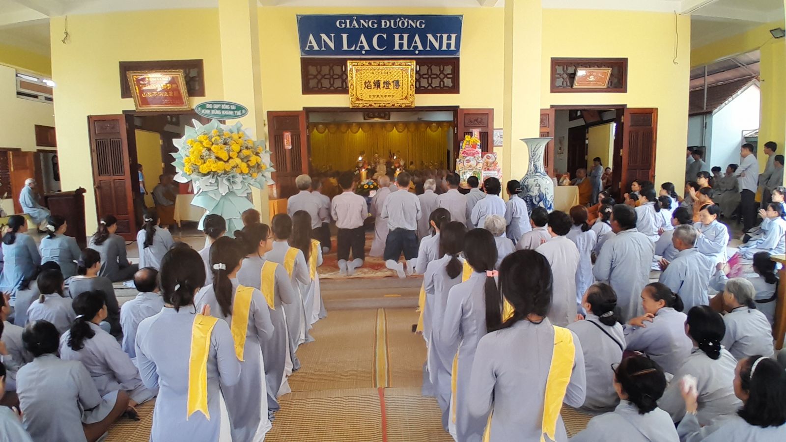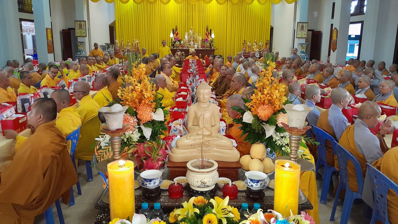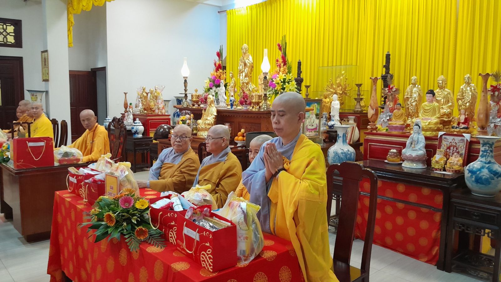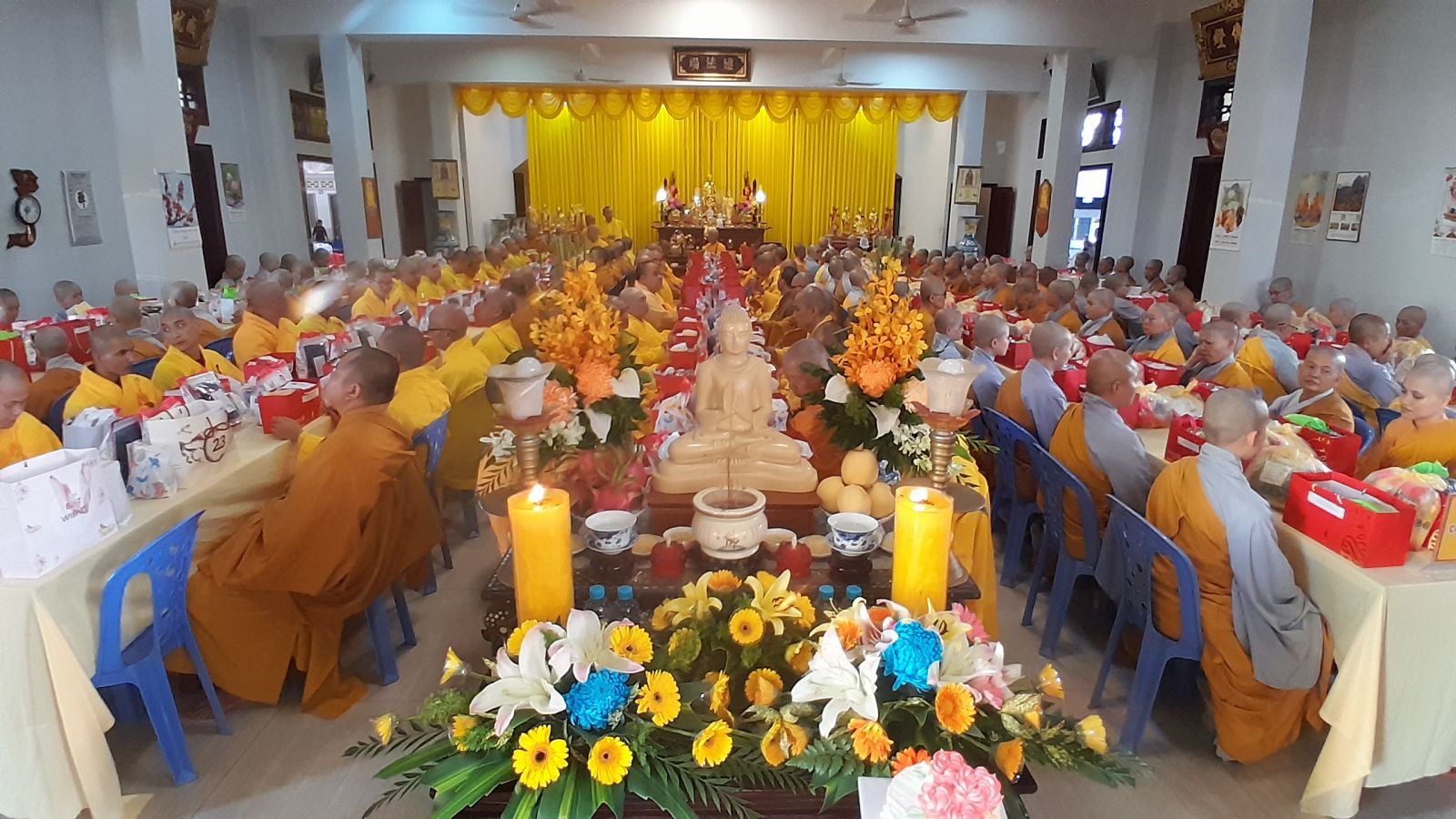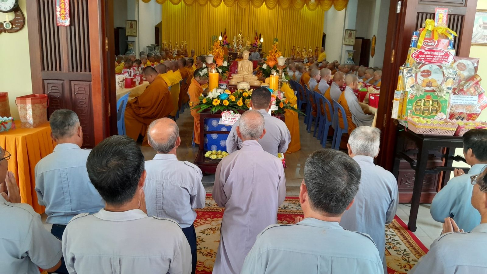 Sau đó, đại diện các đạo tràng, các chúng, Ban Hướng Dẫn GĐPTĐN đã có lời tác bạch kính mừng khánh tuế đến Chư Tôn Đức thêm một tuổi đạo, là chỗ dựa tinh thần cho hàng Phật tử nương tựa tu tập và chuyển hóa. Những hoa vàng cài lên những chiếc y vàng giải thoát. Và theo thứ tự đãnh lễ, dâng tịnh tài tịnh vật.