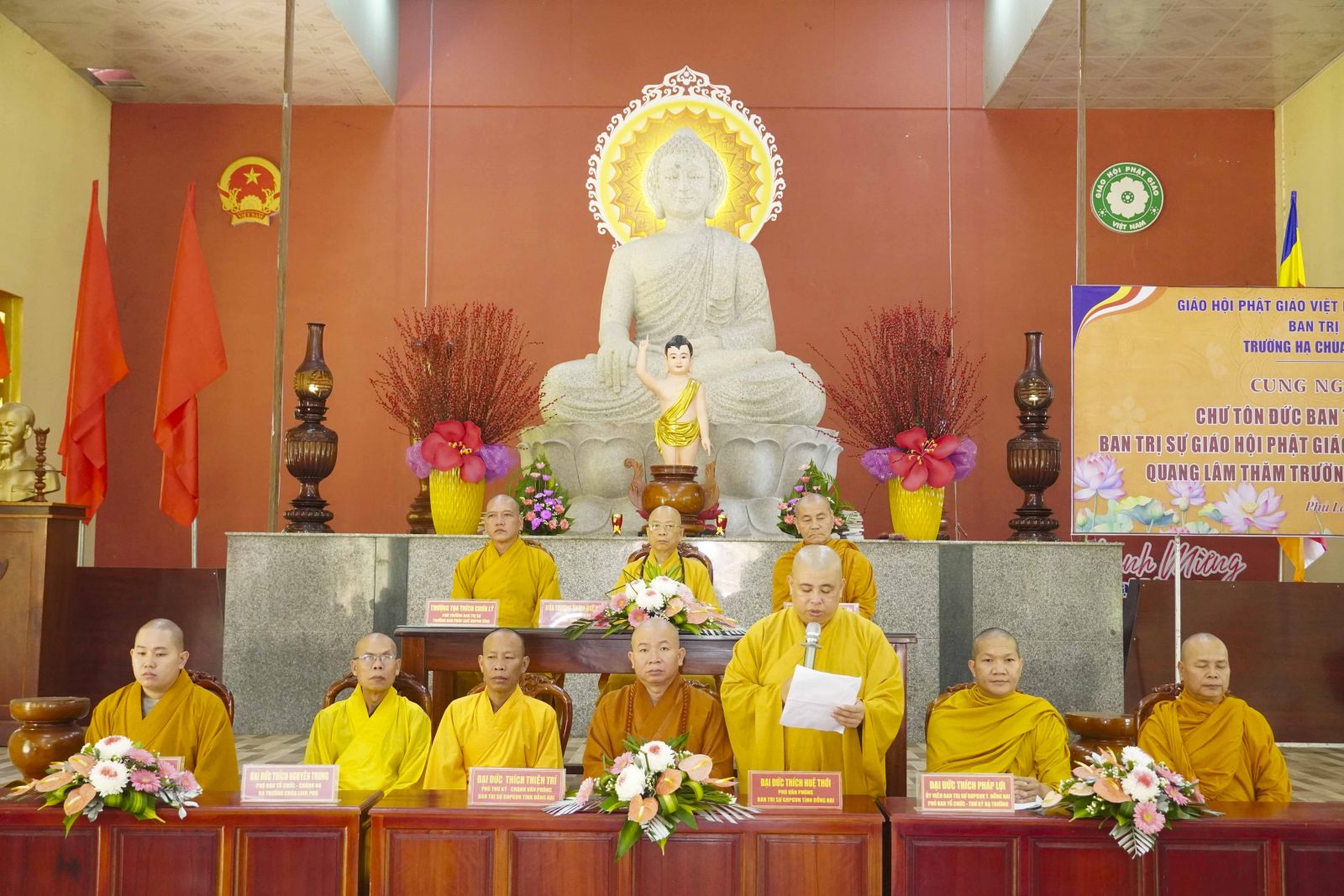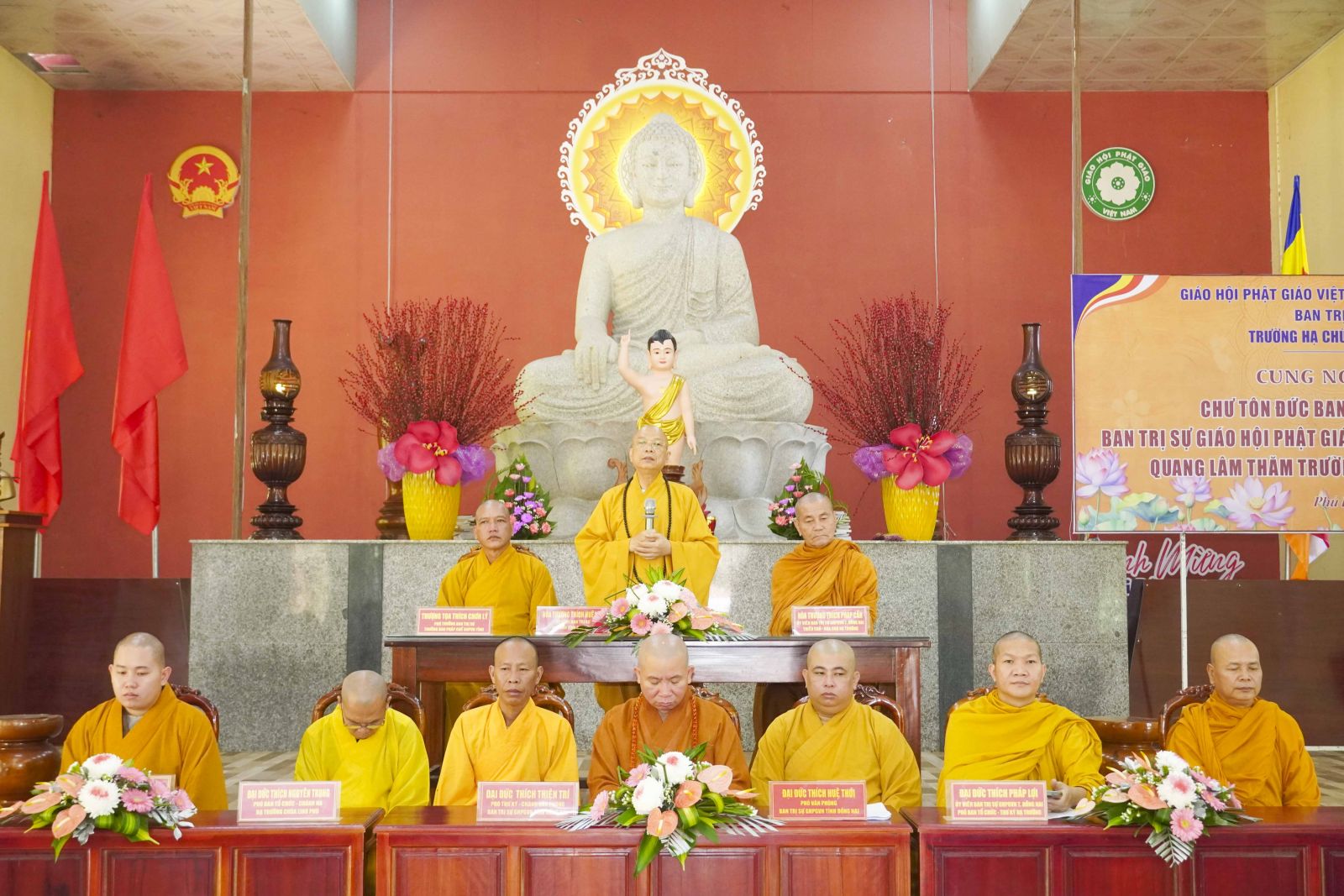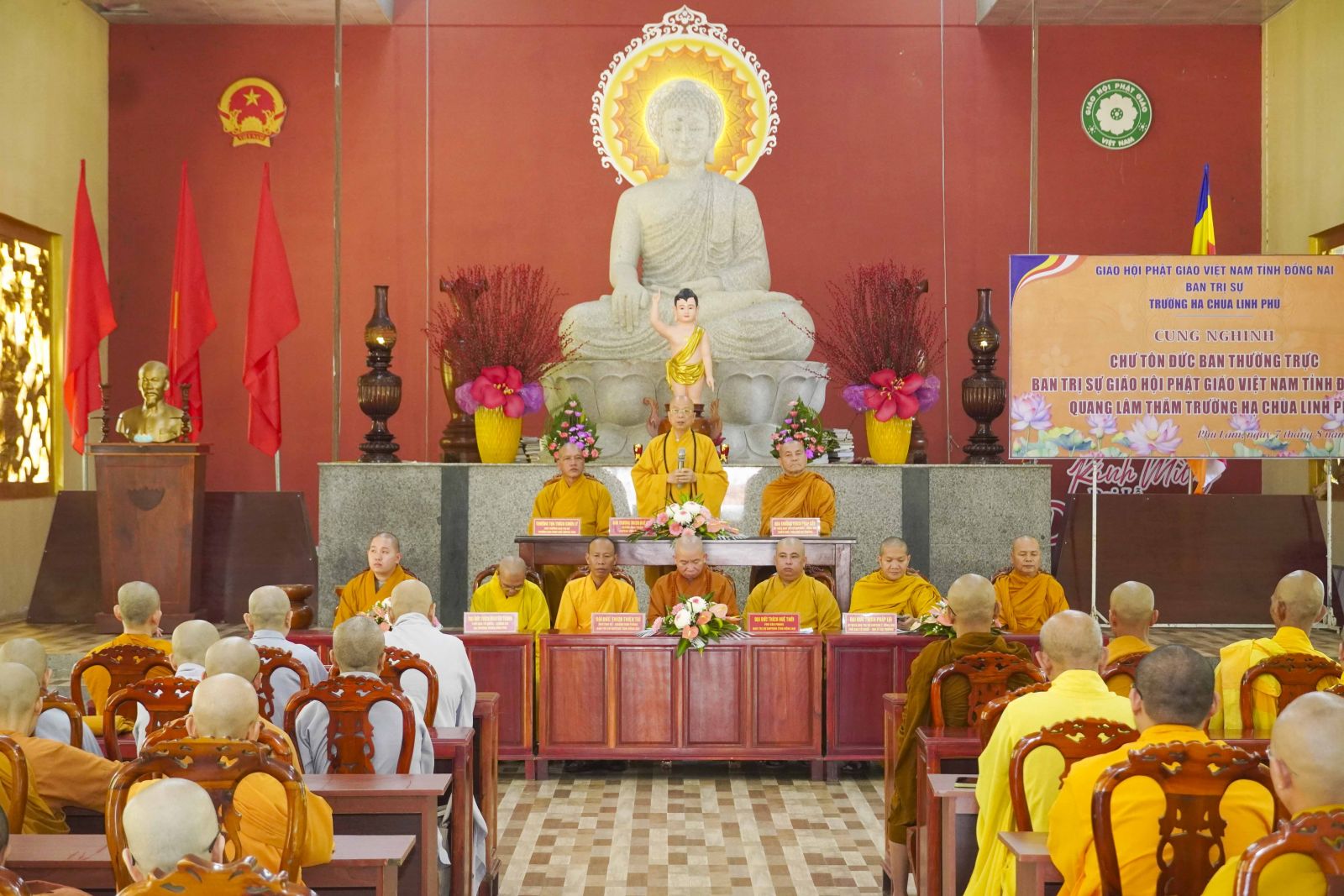 Tiếp đoàn đến thăm có HT. Thích Pháp Cần - Ủy viên Ban Trị sự GHPGVN tỉnh, Trưởng Ban Tổ chức, Thiền chủ kiêm Hóa chủ Hạ trường; ĐĐ. Thích Nguyên Trung – Phó Ban Tổ chức, Chánh na Hạ trường; NS. Thích nữ Hạnh Liên - Ủy viên Ban Trị sự GHPGVN tỉnh, Ủy viên Ban Tổ chức, Giáo thọ Hạ trường Ni; NS. Thích nữ Như Phương – Đặc trách Ni giới Hạ trường; cùng chư Tôn đức Ban Tổ chức, Tăng Ni hành giả An cư tại Hạ trường Chùa Linh Phú.