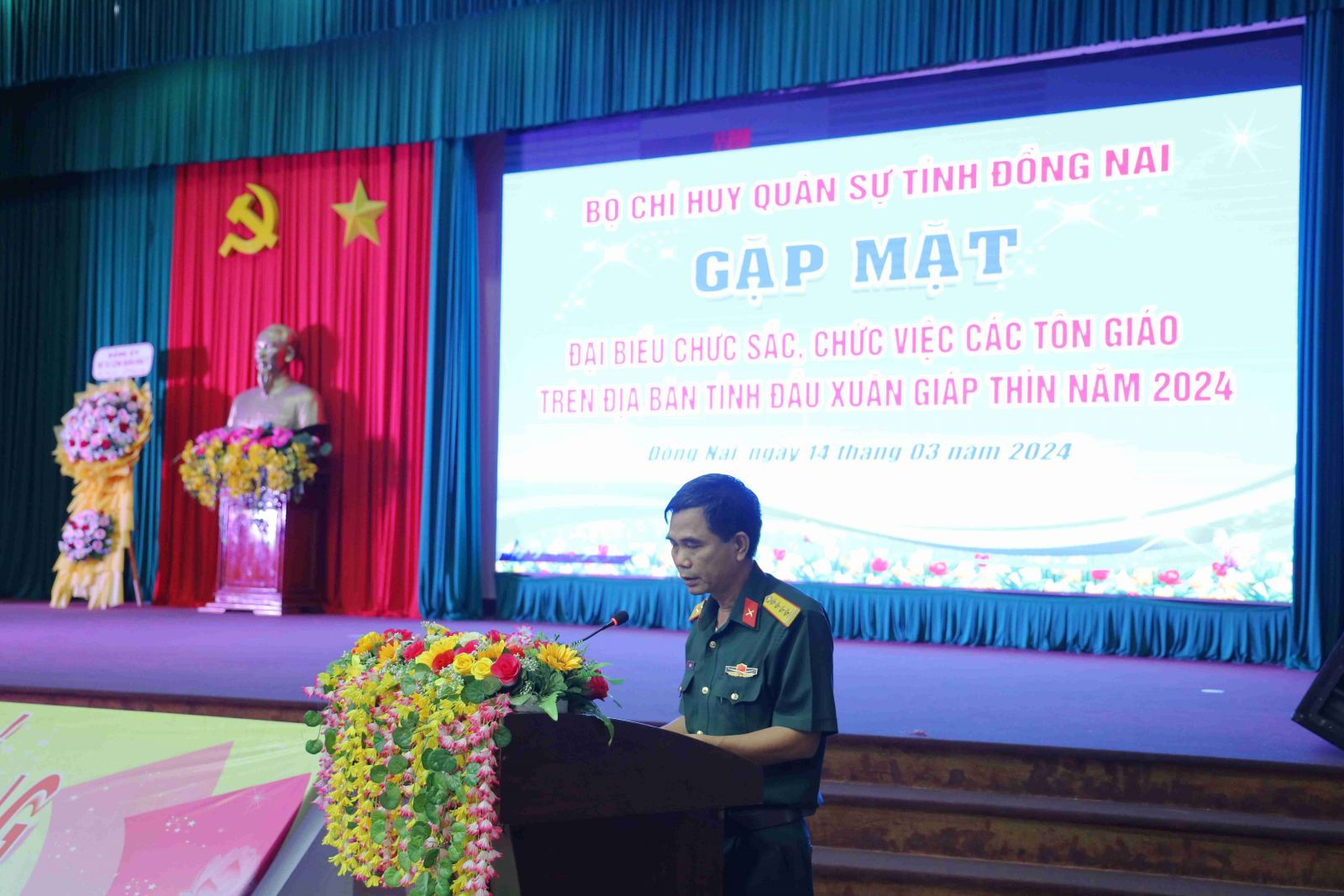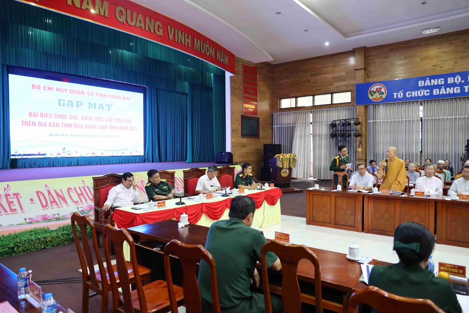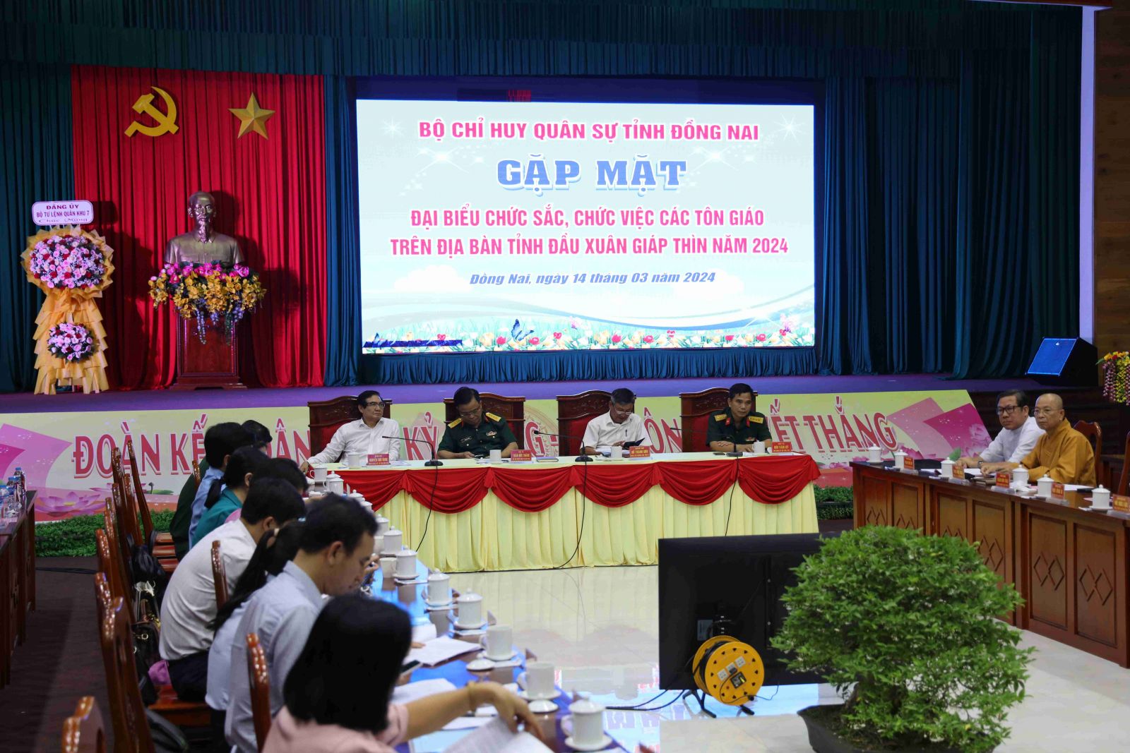 Phát biểu tại buổi gặp mặt, Phó Bí thư Thường trực tỉnh Đồng Nai ông Hồ Thanh Sơn biểu dương công tác phối hợp giữa lực lượng vũ trang tỉnh Đồng Nai và các Tôn giáo trên địa bàn trong thời gian qua đã đạt kết quả tốt, góp phần quan trọng vào sự phát triển kinh tế - xã hội tại địa phương, giữ vững an ninh chính trị, trật tự an toàn xã hội trên địa bàn. Lực lượng vũ trang tỉnh luôn làm tốt công tác vận động quần chúng, xây dựng khối đại đoàn kết toàn dân tộc. Đặc biệt, công tác phối hợp giữa Bộ Chỉ huy Quân sự tỉnh với các tổ chức tôn giáo trên địa bàn để lại những dấu ấn đậm nét trong lòng cấp ủy, chính quyền và nhân dân trong tỉnh.