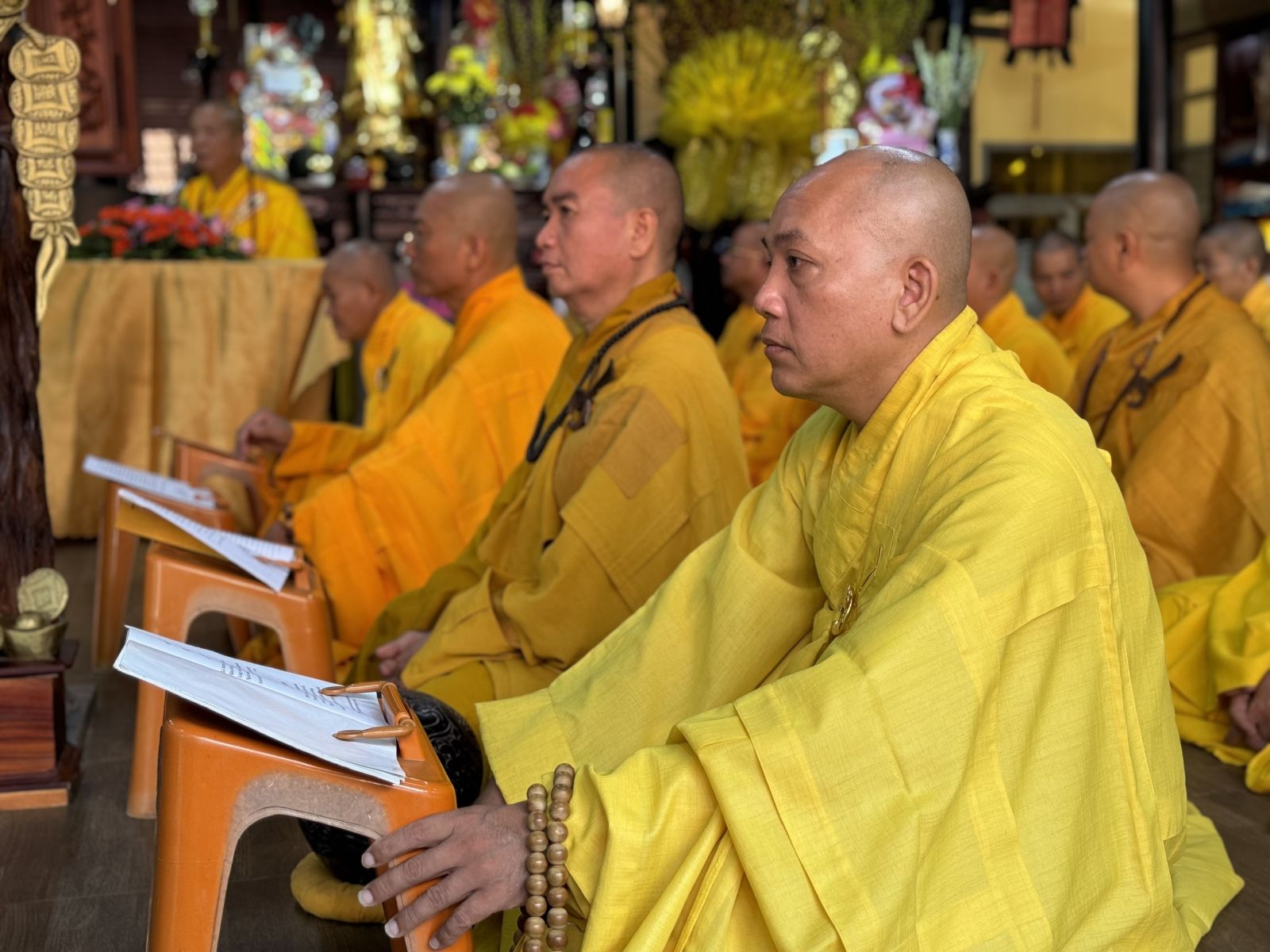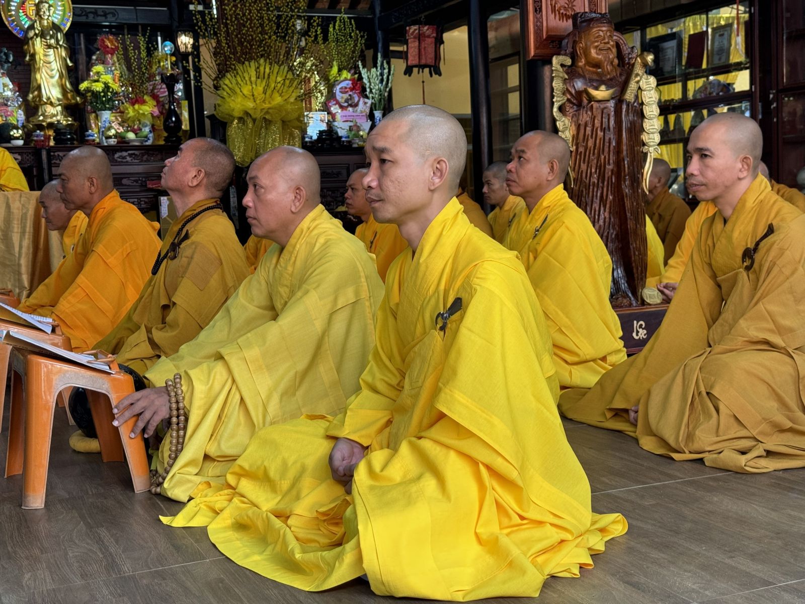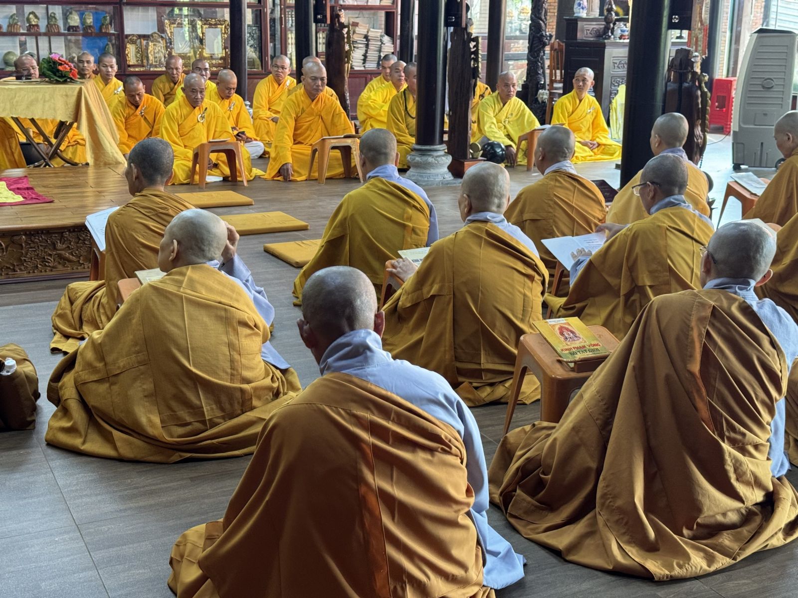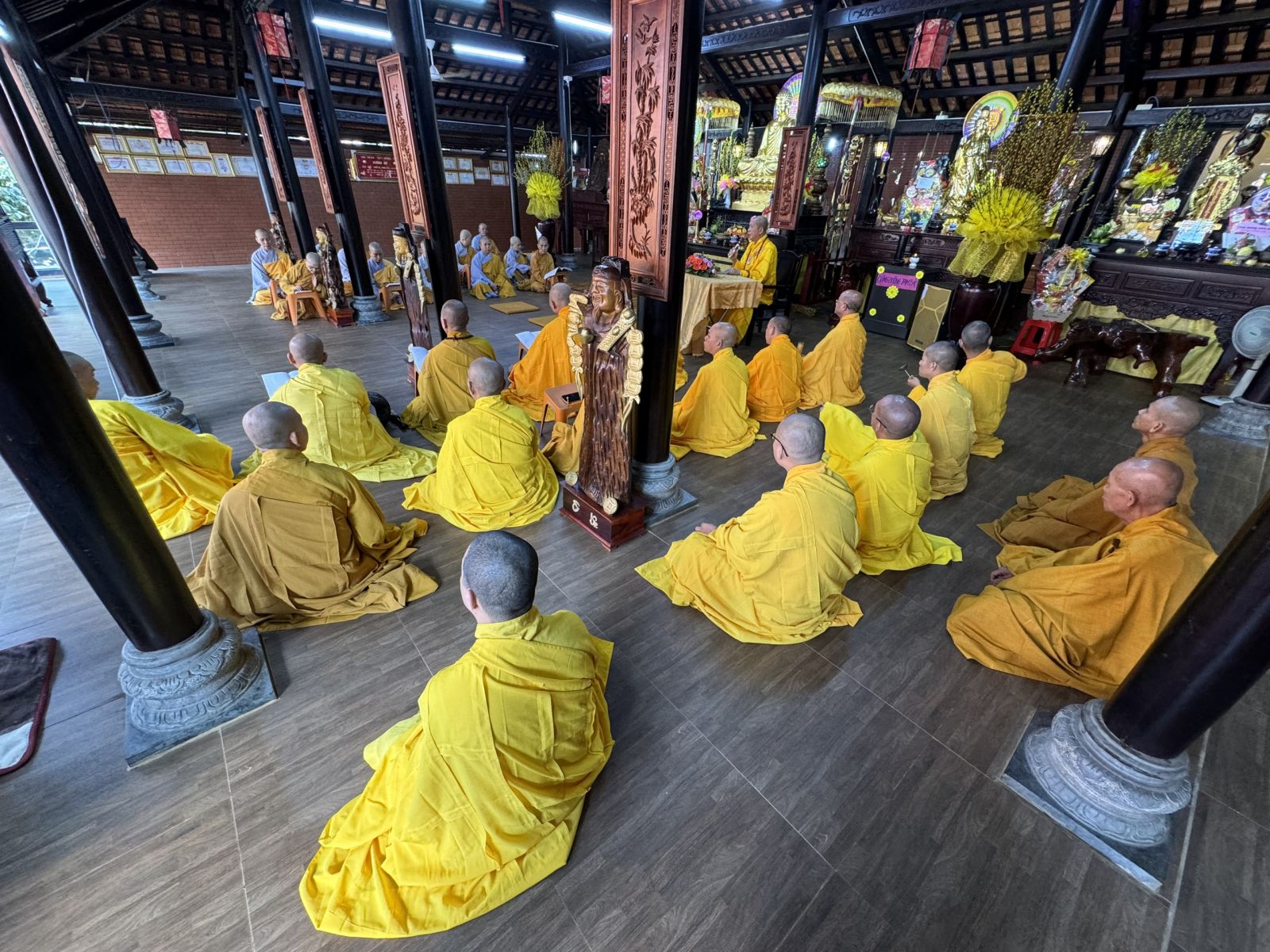 Tại Chánh điện Chùa Hoàng Mai, Thượng toạ Thích Pháp Đăng – Uỷ viên Thường trực Ban Trị sự tỉnh, Cố vấn BTS GHPGVN huyện niêm hương bạch Phật; toàn thể đại chúng thành kính đảnh lễ Tam bảo, thực hiện nghi thức Yết-ma Bố-tát, tụng giới.