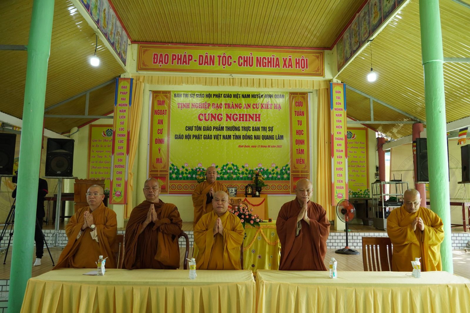 Về phía chư Tôn đức BTS GHPGVN huyện Định Quán có TT. Thích Đồng Ngạn – Trưởng ban Ban Trị sự GHPGVN huyện Định Quán, TT. Thích Pháp Đăng, TT. Thích Pháp Tân, ĐĐ. Thích Huệ Trí ĐĐ. Thích Huệ Hạnh cùng chư tôn đức tăng ni, chư hành giả an cư kiết hạ đã vân tập về hạ trường cùng cung đón chư tôn đức giáo phẩm BTS GHPGVN tỉnh Đồng Nai quang lâm.