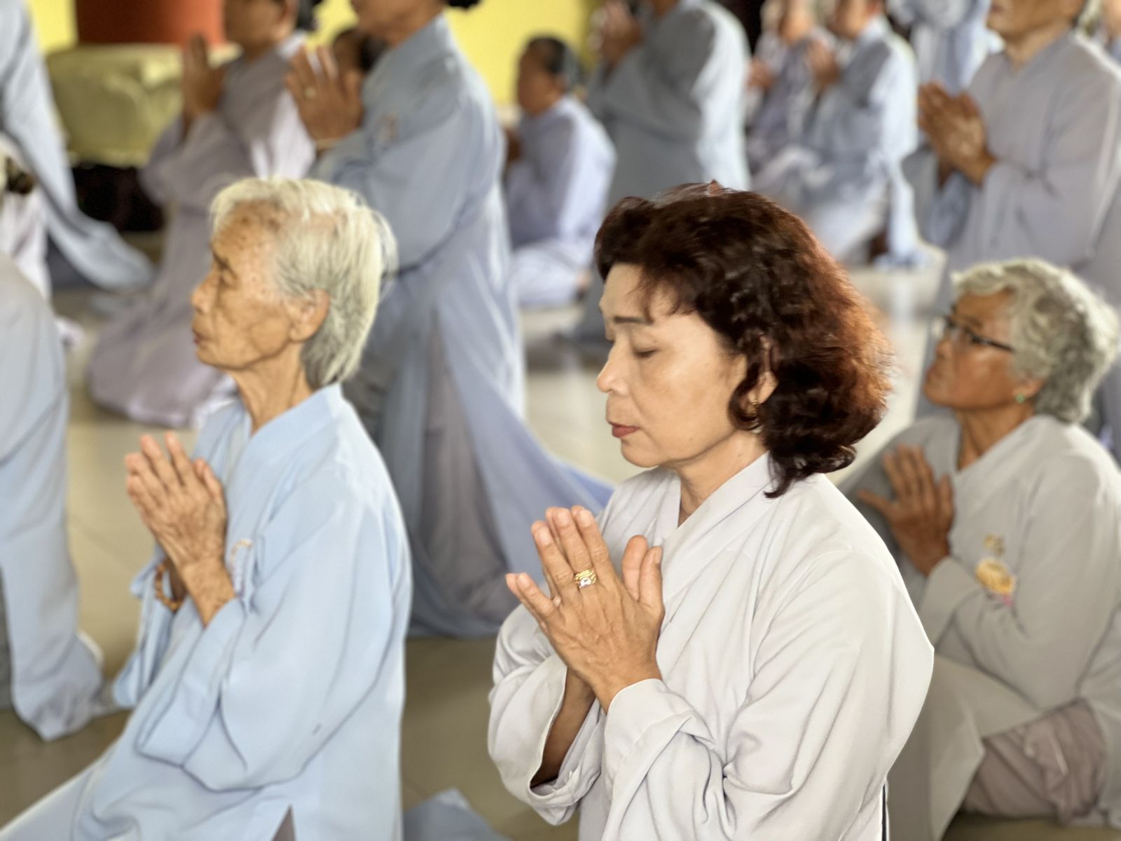 Vào lúc 13h00’ là thời khóa tu học buổi chiều được bắt đầu pháp tọa thiền tĩnh tâm, sau đó cả đại chúng tiếp tục trì danh hiệu đức Phật A Di Đà, tụng kinh sau đó Đại chúng hướng về Tam Bảo thực hành nghi thức hồi hướng kết khóa tu học một ngày Niệm Phật.