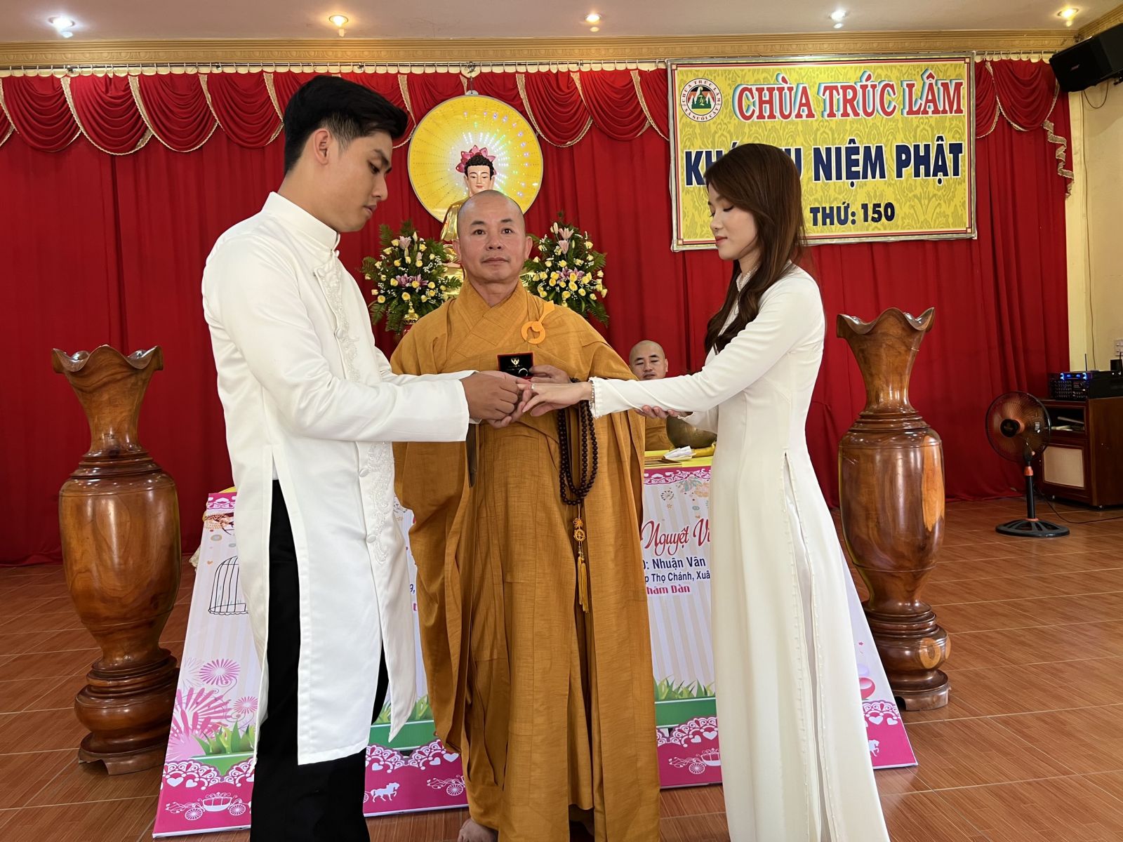 TT. Thích Huệ Quang chứng minh hôn lễ đã hướng dân đôi tân lang, tân nương phát 4 điều phát nguyện cam kết trong hôn nhân của vợ và chông. Thượng tọa cũng đã giảng giải về ý nghĩa của việc trao nhẫn cưới, Thượng tọa đã nhấn mạnh về giá trị của tình yêu, hôn nhân gia đình qua bốn ý nghĩa lớn của chiếc nhẫn đó là về hình thù là chiếc nhẫn tròn thể hiện cho sự viên mãn hạnh phúc của đôi tân lang và tân nương. Về chất liệu là bằng vàng hoặc bạch kim thể hiện cho sự cao quý nhất của tình yêu đẹp, là hoa trái của sự gắn kết đó là hạnh phúc. Về trọng lượng chỉ là 5 phân bởi đó chính là một nửa, một nửa của anh và một nửa của em và mỗi người là một nửa của nhau. Về tên gọi là chiếc nhẫn tức là sự nhẫn nại trong hôn nhân, dù gặp bất cứ chuyện gì xảy ra thì vợ và chồng phải có lòng kiên nhẫn lớn để vượt qua sóng gió hướng đến hạnh phúc viên mãn.