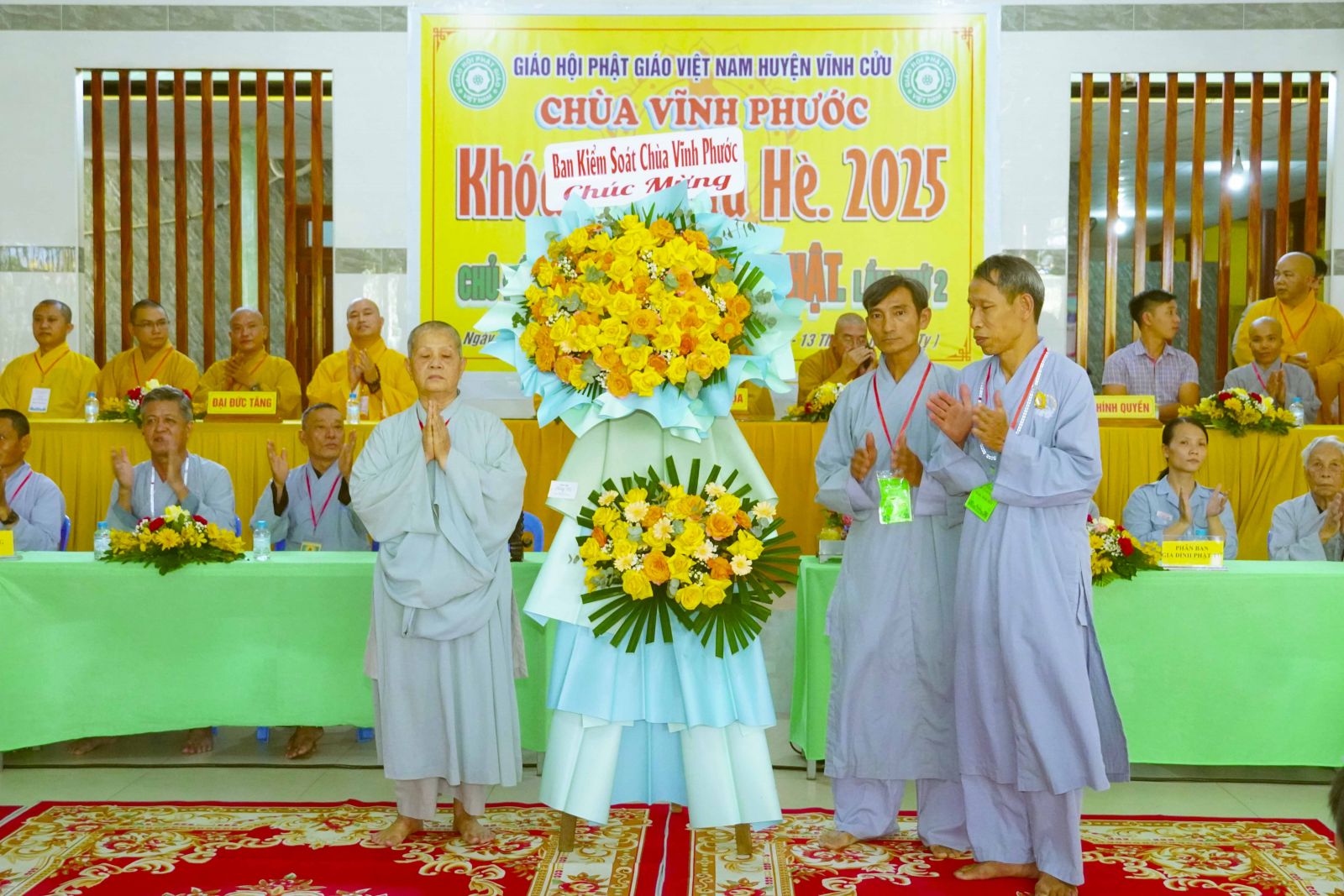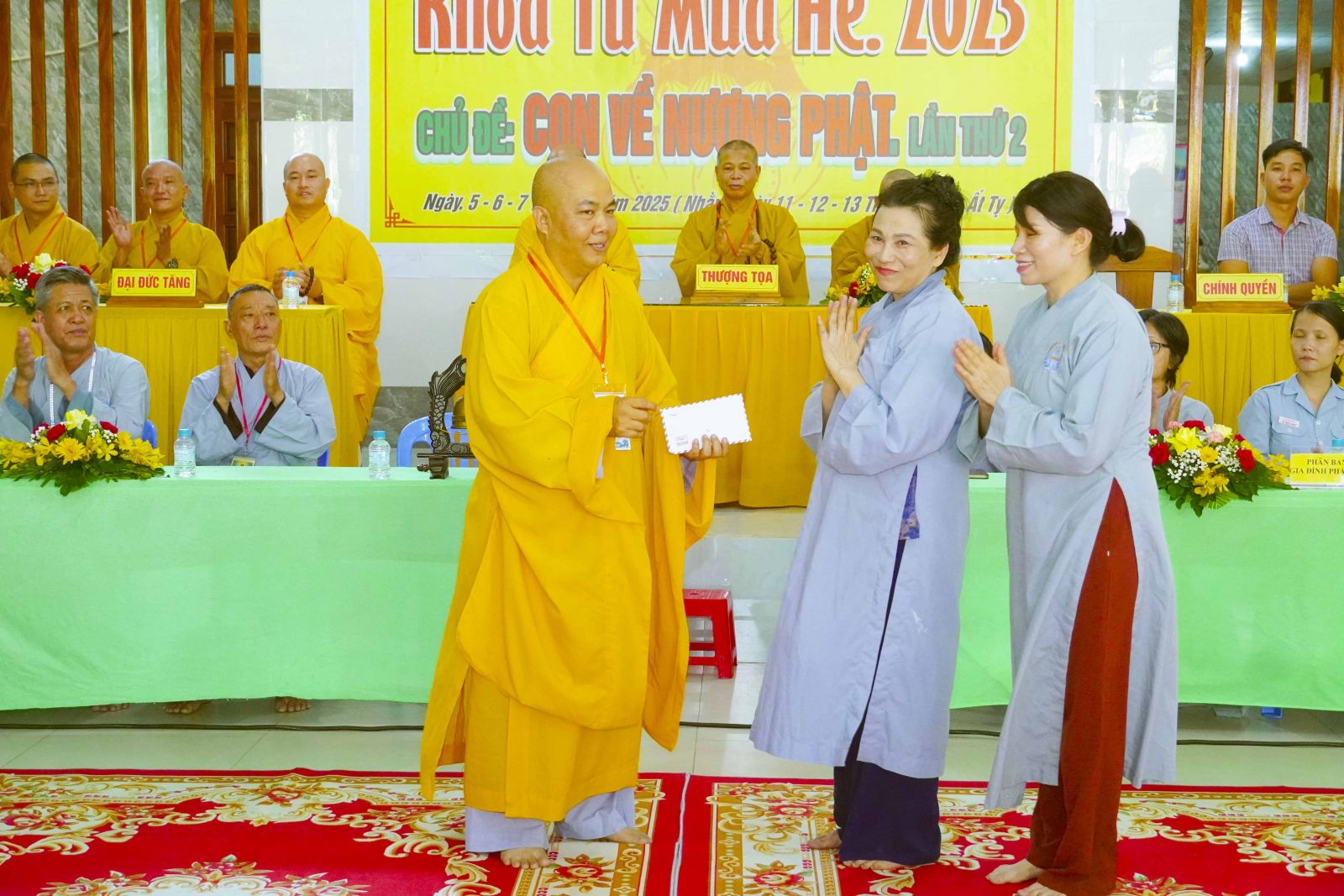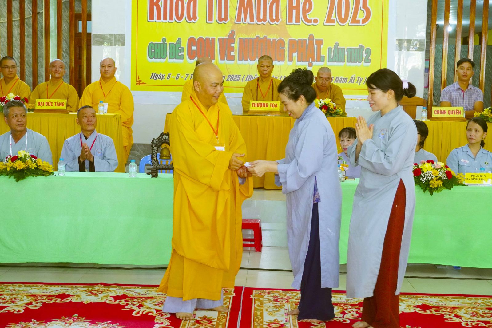 Tại buổi lễ Khai mạc, Ban Tổ chức Khóa tu đã đón nhận những lẵng hoa cùng tịnh tài từ ban Hướng dẫn Phật tử GHPGVN tỉnh và Ban Bảo trợ Khóa tu cúng dường.