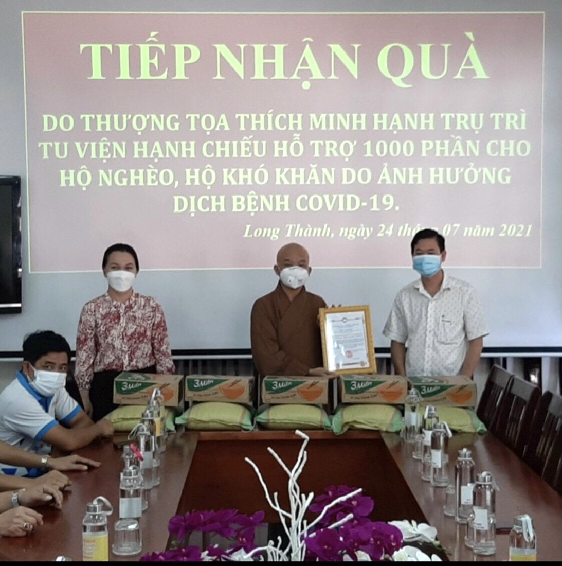 Tính đến nay, Tu viện Hạnh Chiếu đã ủng hộ cho Ủy ban Mặt trận Tổ quốc Việt Nam tổng cộng 26 tấn gạo để cứu trợ cho bà con vùng dịch bị ảnh hưởng đến cuộc sống nghiêm trọng. Bên cạnh đó, 1000 phần quà và 10 tấn gạo cũng được trao tặng tới tay các hộ nghèo, hộ gia đình gặp khó khăn trên địa bàn huyện Long Thành. Tổng giá trị thành tiền là 940 triệu đồng.