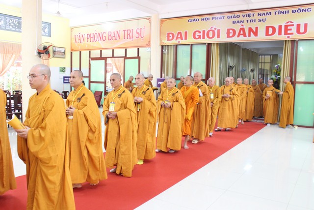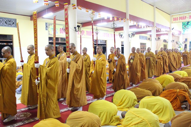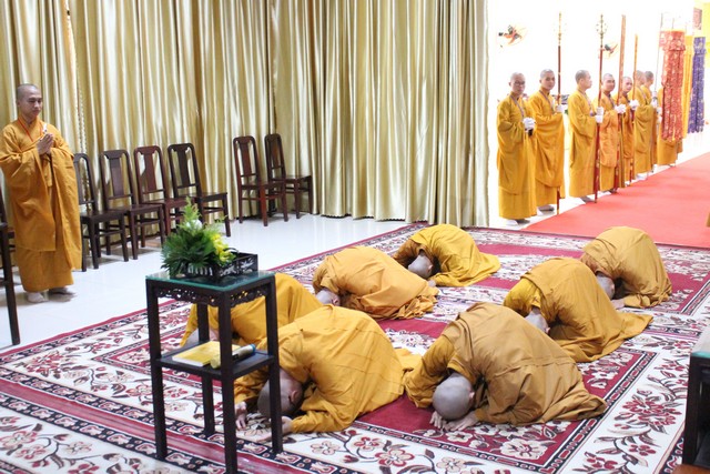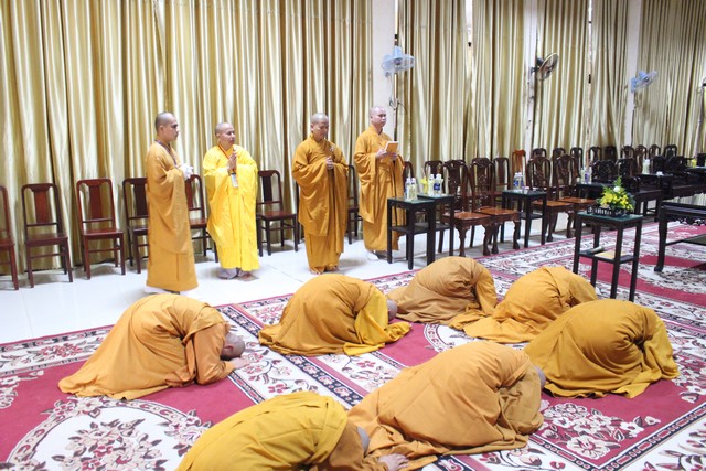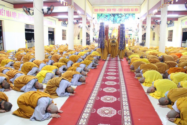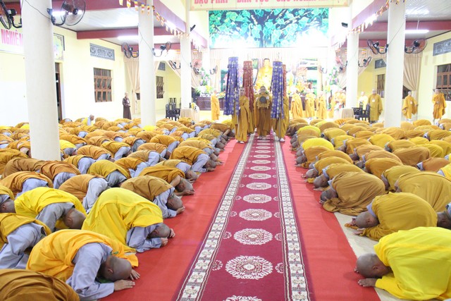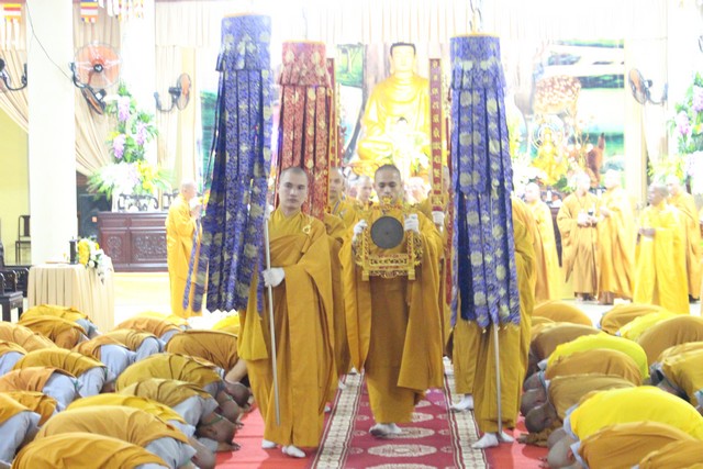 Các tân Tỳ-kheo quỳ thẳng, chắp tay cung kính hướng về Thập sư lắng nghe lời huấn từ của Hòa thượng Đường đầu với những lời dạy hết sức cần thiết cho sự nghiệp tu hành của một người xuất gia. Giới Định Tuệ là ba yếu tố vô cùng thiết yếu của người bắt đầu học Phật, đó là cả hành trang mang theo suốt cuộc đời của những hành giả muốn tìm đến chân như của cuộc sống, với những lời dạy hết sức giản dị mà chứa đầy tình thương đến với hàng hậu học. Toàn thể tân Tỳ-kheo khể thủ cung kính đồng thanh phụng chỉ: “Y giáo phụng hành” ba lần, thể hiện sự quyết tâm trân quý giới thể châu viên vừa bẩm thọ.