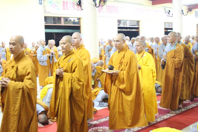 Ban cung nghinh đã trang nghiêm lễ thỉnh chư Tôn Thập Sư Tăng quang lâm Phật điện để chính thức khai lễ. Sau khi chư Tôn giáo phẩm Hội đồng Thập Sư niêm hương bạch Phật, chất vấn già nạn thì các Giới tử Tỳ-kheo được hướng dẫn xếp thành 175 đàn, mỗi đàn 3 vị lần lượt thứ tự vào giới trường để tấn đàn cầu thọ giới Tỳ-kheo, dưới sự điều phối của ban quản giới tử. Trước chư Tôn giáo phẩm Hội đồng Thập sư, nghi thức được diễn ra đúng y như Pháp, như Luật bạch tứ Yết-ma, truyền giới Tỳ-kheo thành tựu giới pháp trọn vẹn. Các Giới tử được xả y Sa-di. Hòa thượng Yết-ma Thích Minh Thông hướng dẫn các Giới tử Tỳ-kheo thọ trì 3 y: An-đà-hội, Uất-đa-la và Tăng-già-lê, truyền bình bát, tọa cụ, đãy lọc nước cho giới tử.