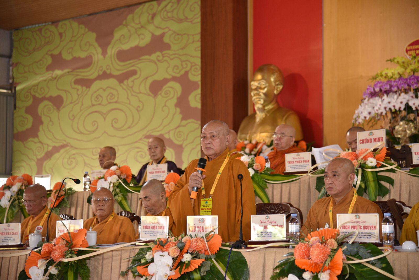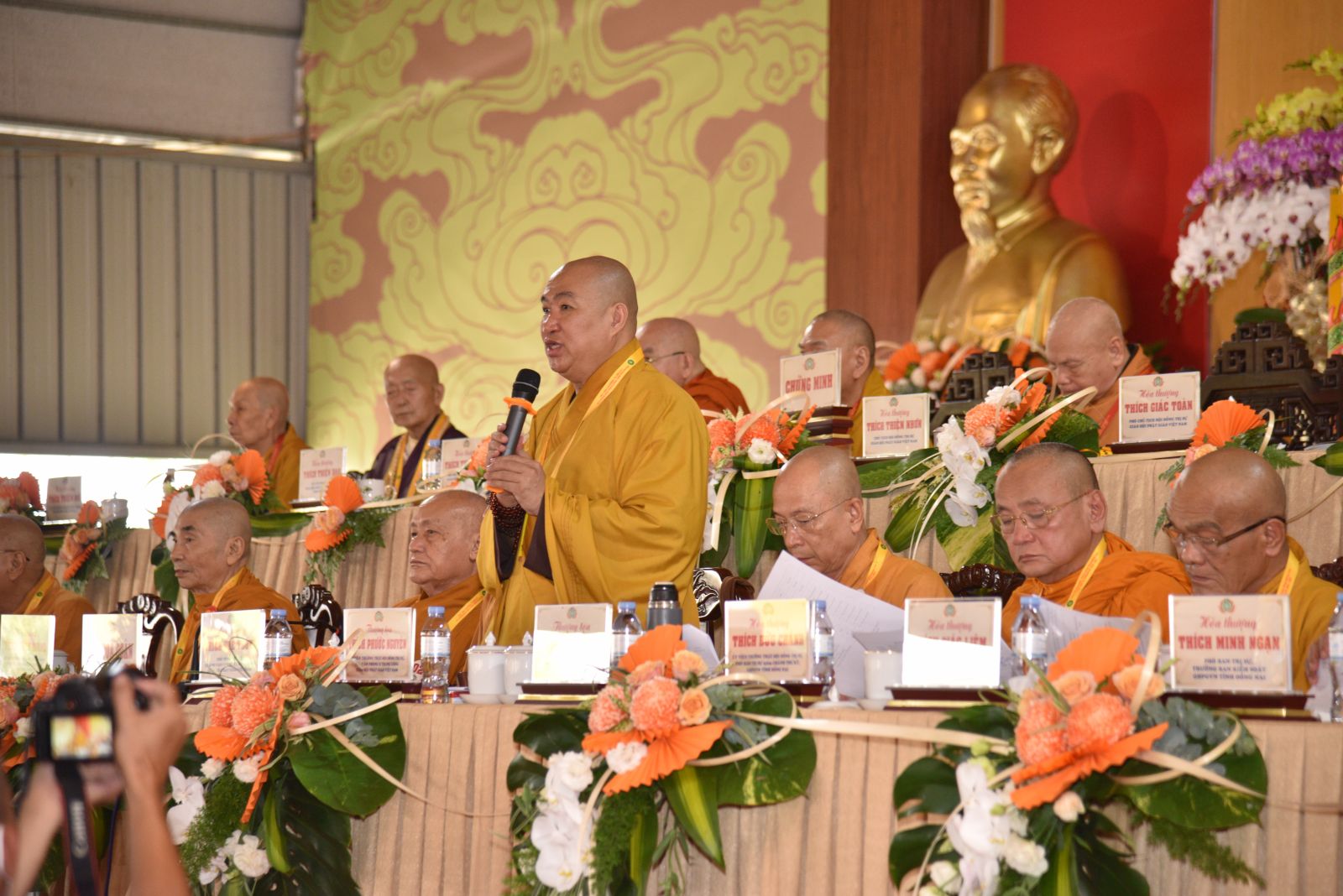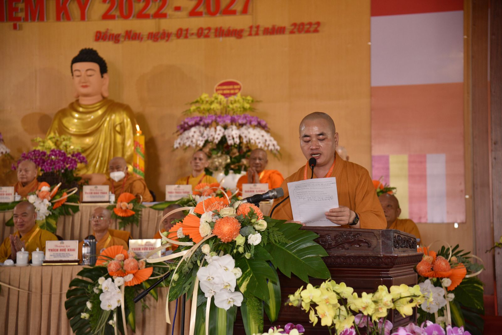 Hòa thượng Thích Minh Ngạn - Phó Ban Trị sự, Trưởng Ban Kiểm soát GHPGVN tỉnh Đồng Nai thay mặt toàn Ban Trị sự nhiệm kỳ 2017 - 2022 lên tuyên bố mãn nhiệm.