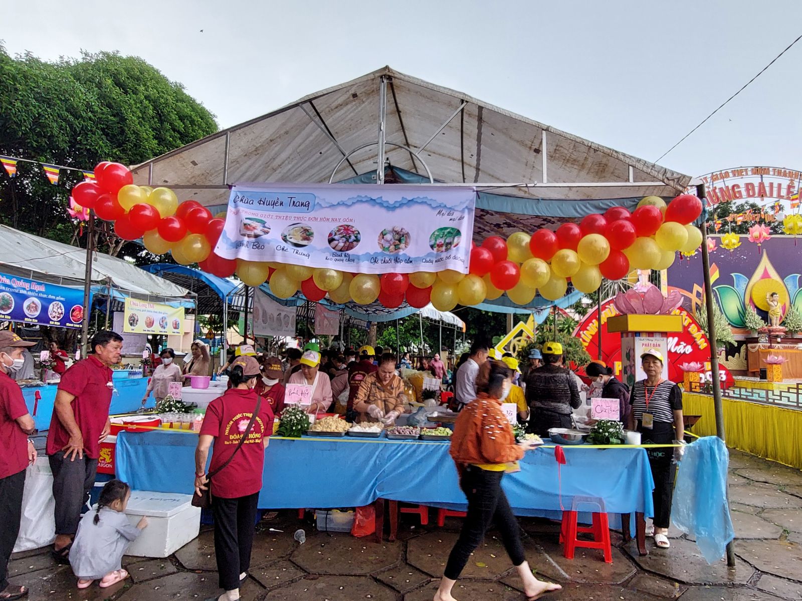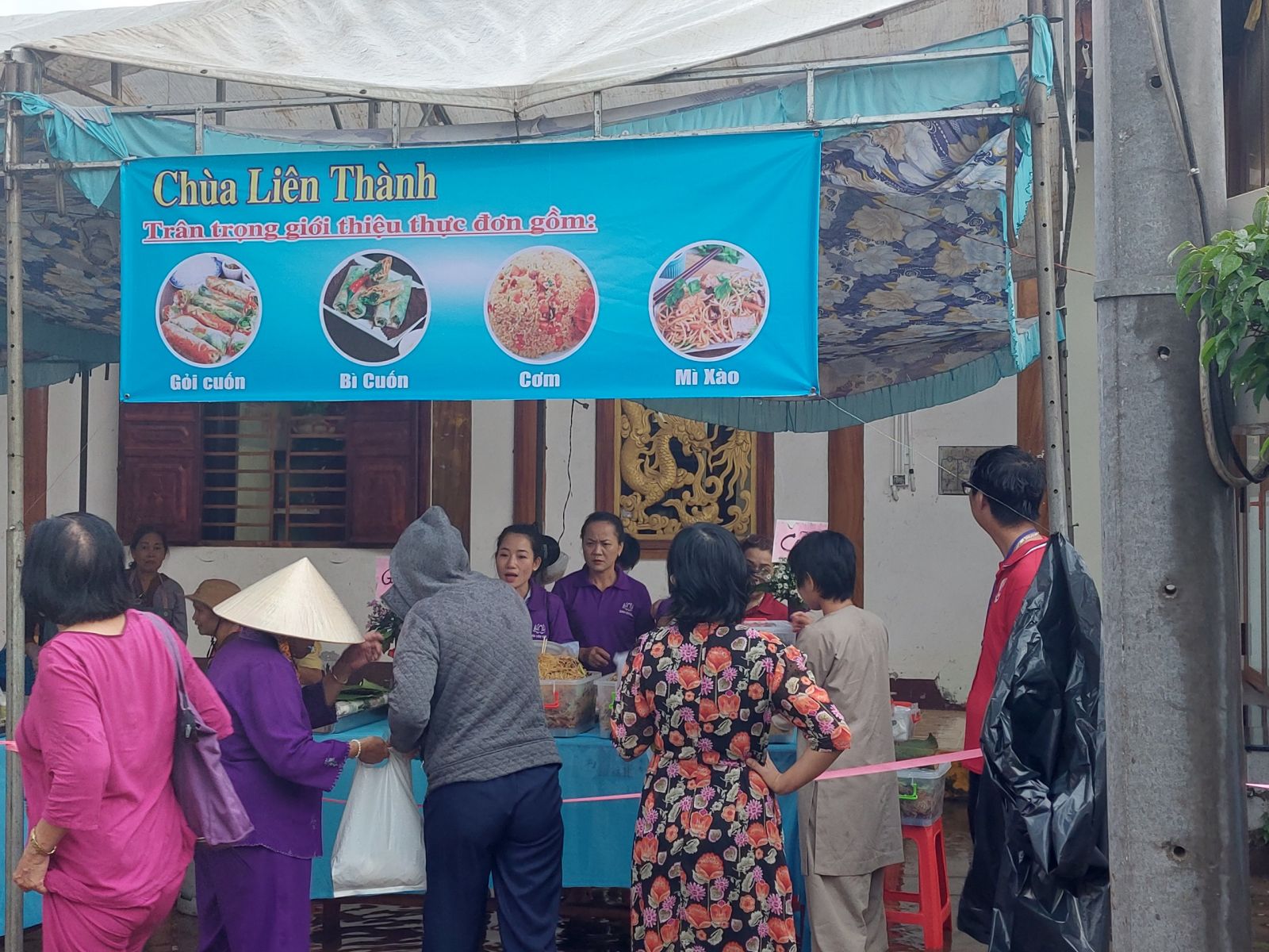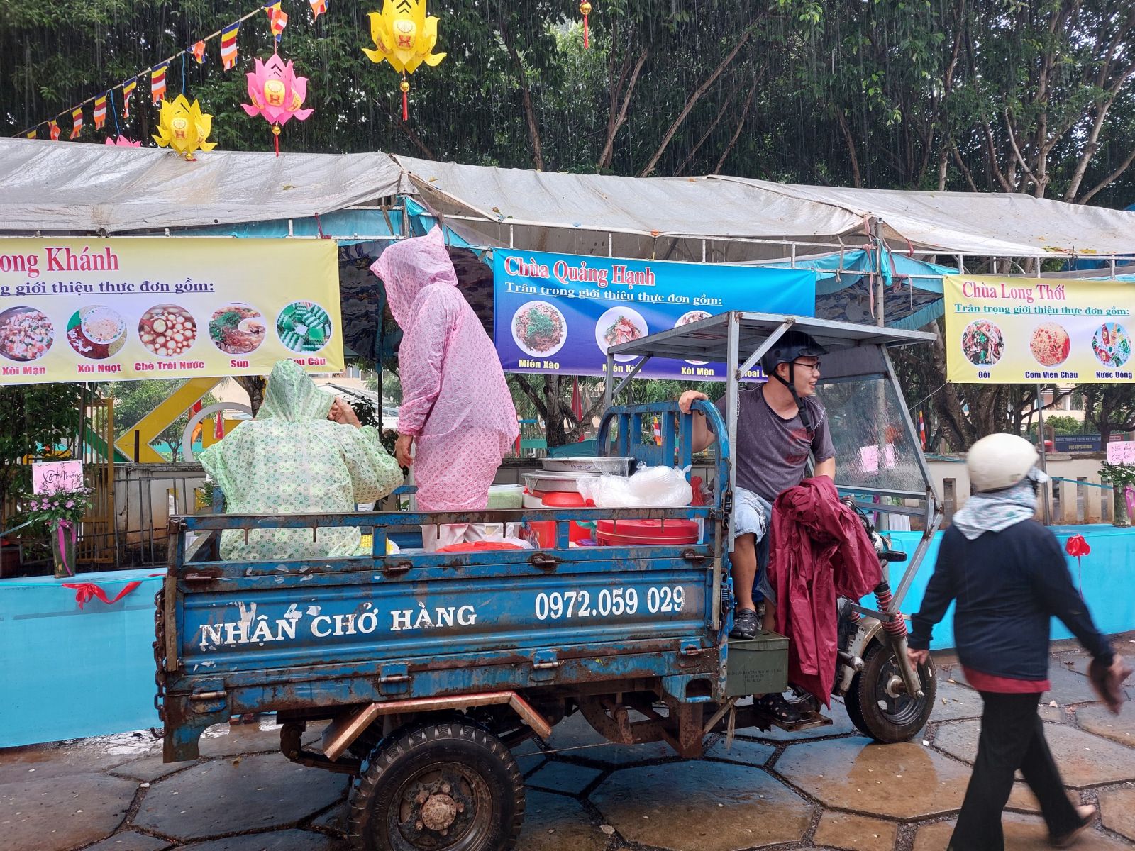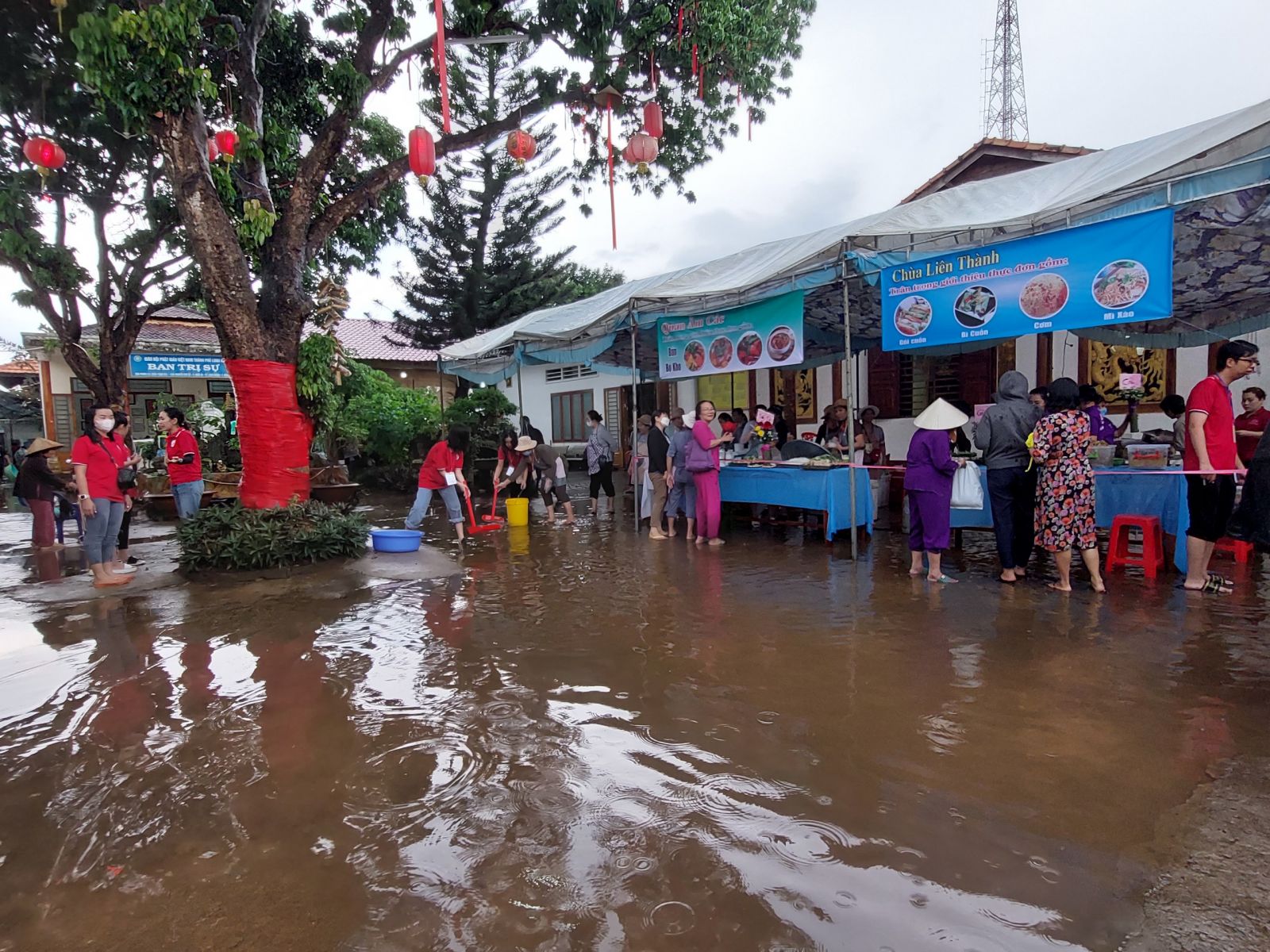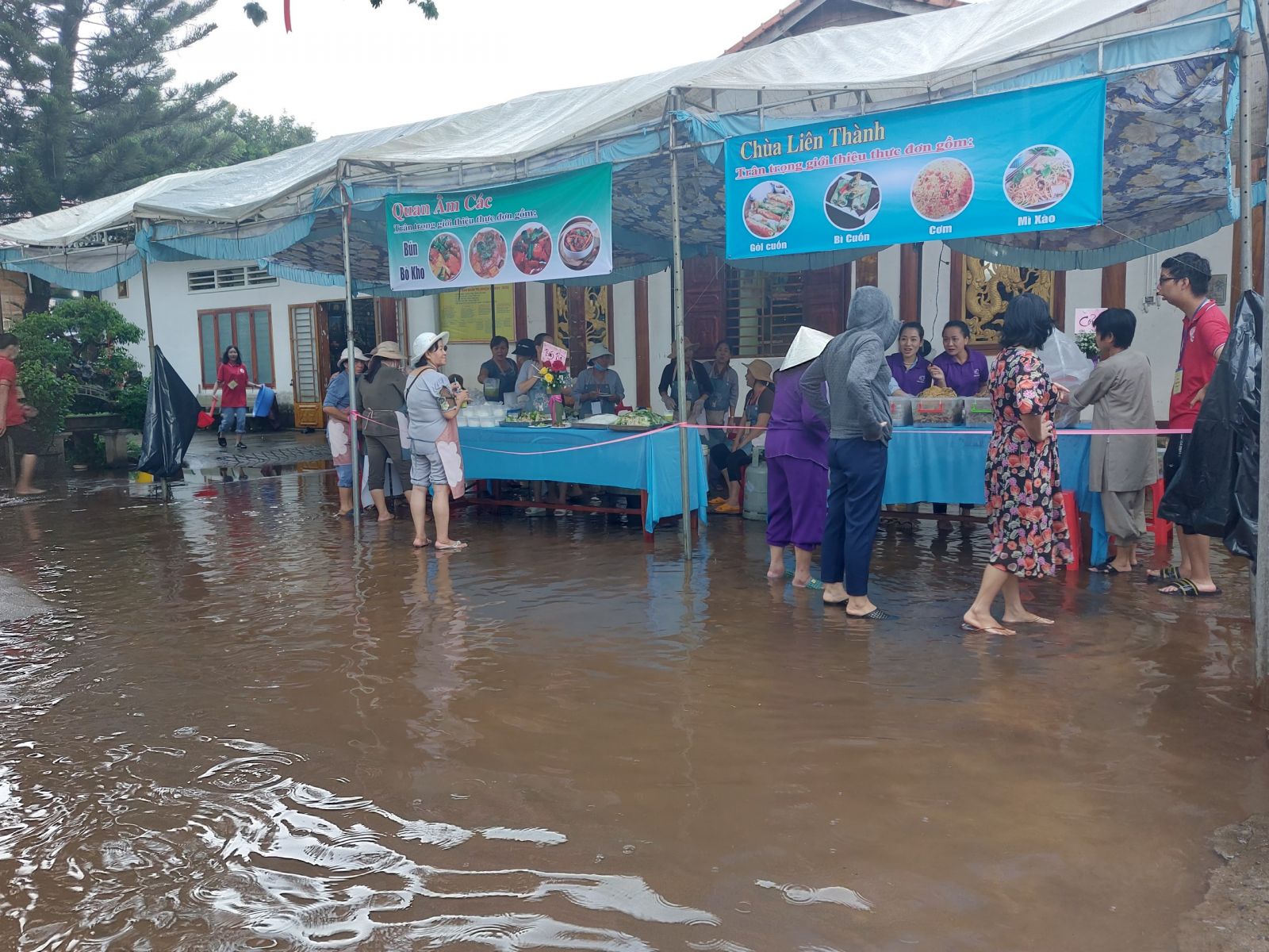 Mặc dù trời mưa bão kéo dài, nhưng hơn 20 đơn vị phát tâm với 70 món ăn vô cùng hấp dẫn và đẹp mắt, đã vất vả nổ lực vận chuyển đồ đạc trong mưa để lo cho tiệc buffet. Những nghĩa cử thật xúc động thân thương để lại ấn tượng trong lòng mọi người.