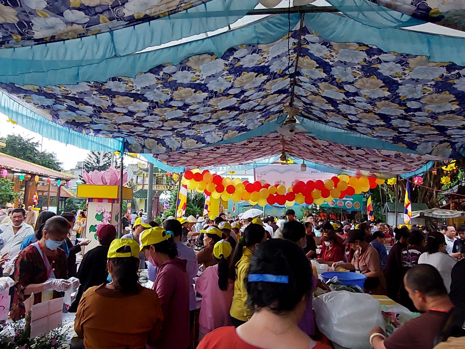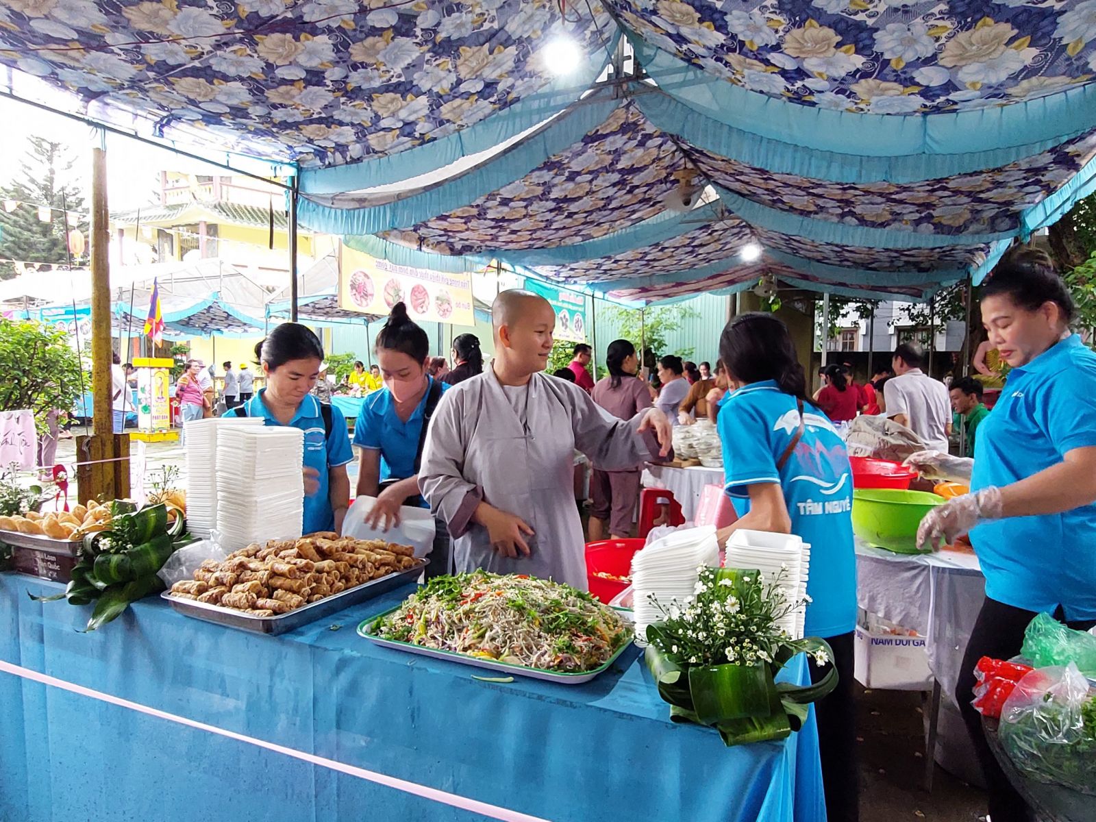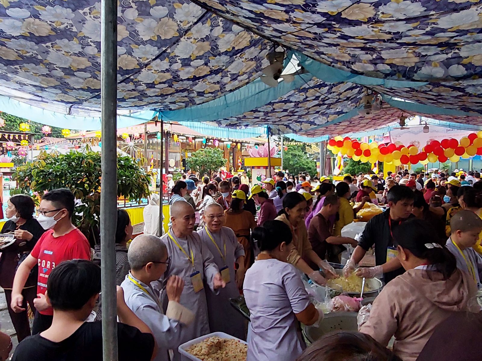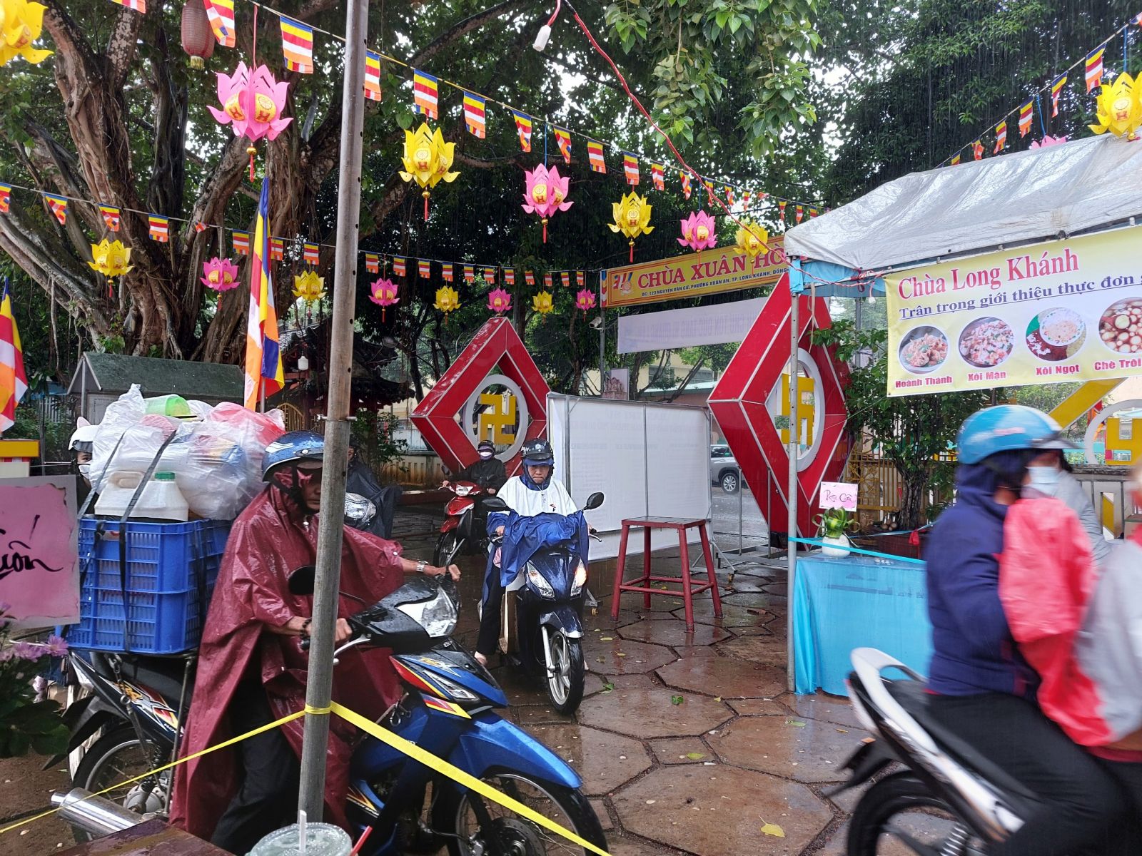 Mặc dù trời mưa bão kéo dài, nhưng hơn 20 đơn vị phát tâm với 70 món ăn vô cùng hấp dẫn và đẹp mắt, đã vất vả nổ lực vận chuyển đồ đạc trong mưa để lo cho tiệc buffet. Những nghĩa cử thật xúc động thân thương để lại ấn tượng trong lòng mọi người.