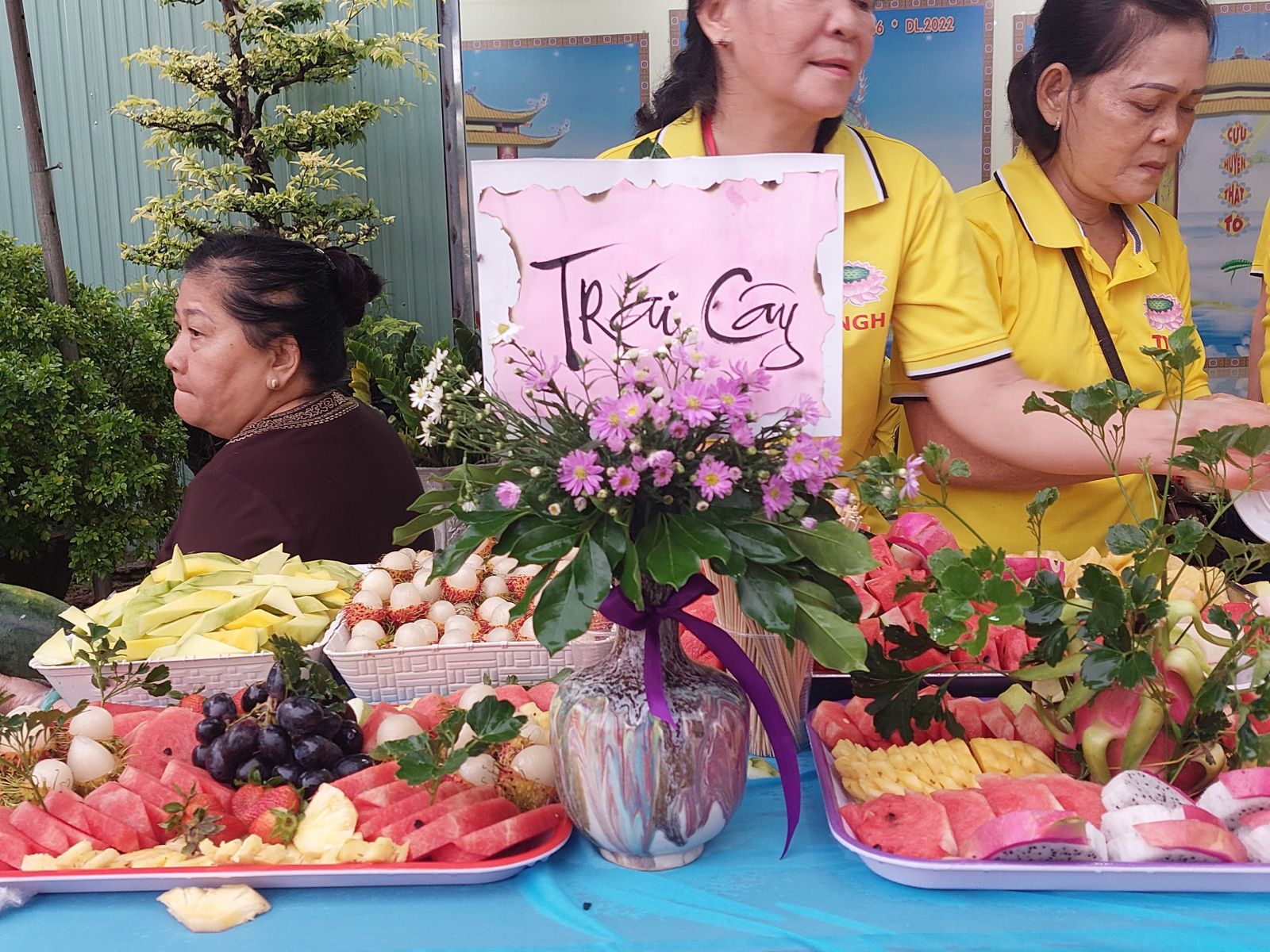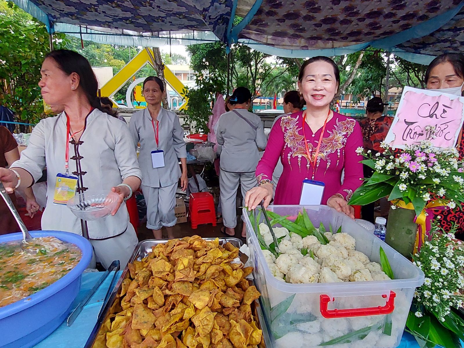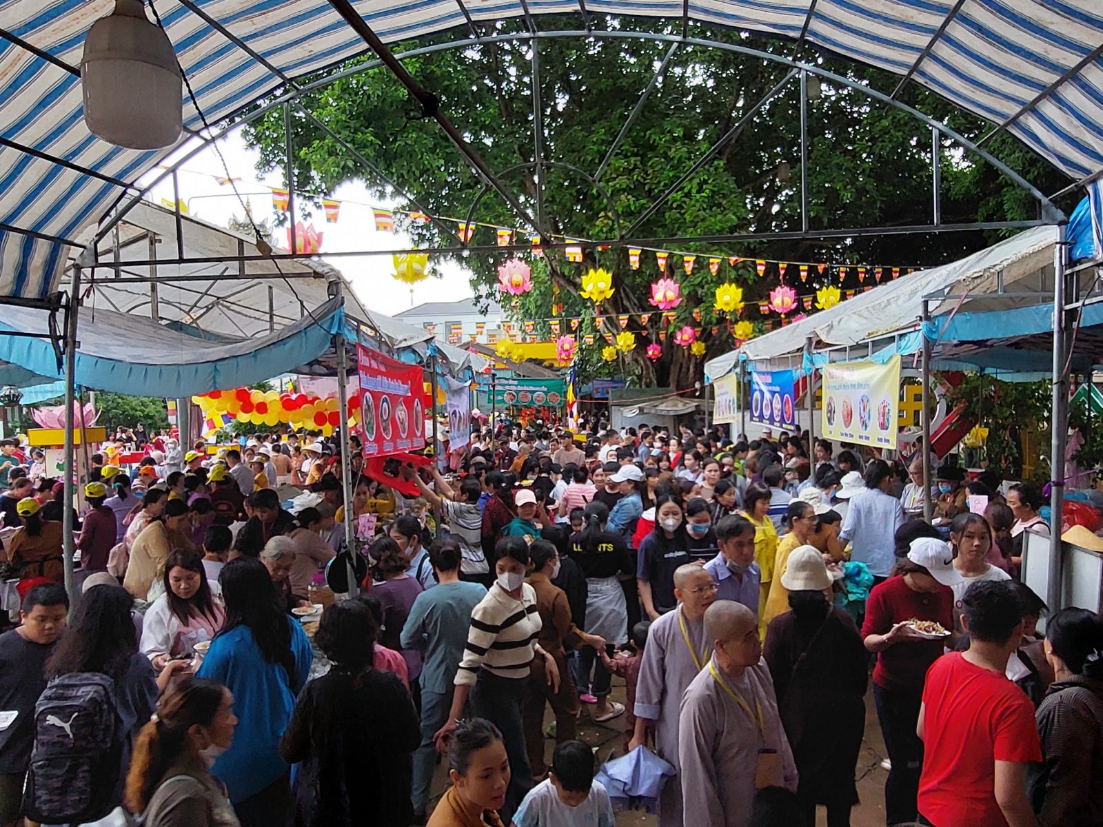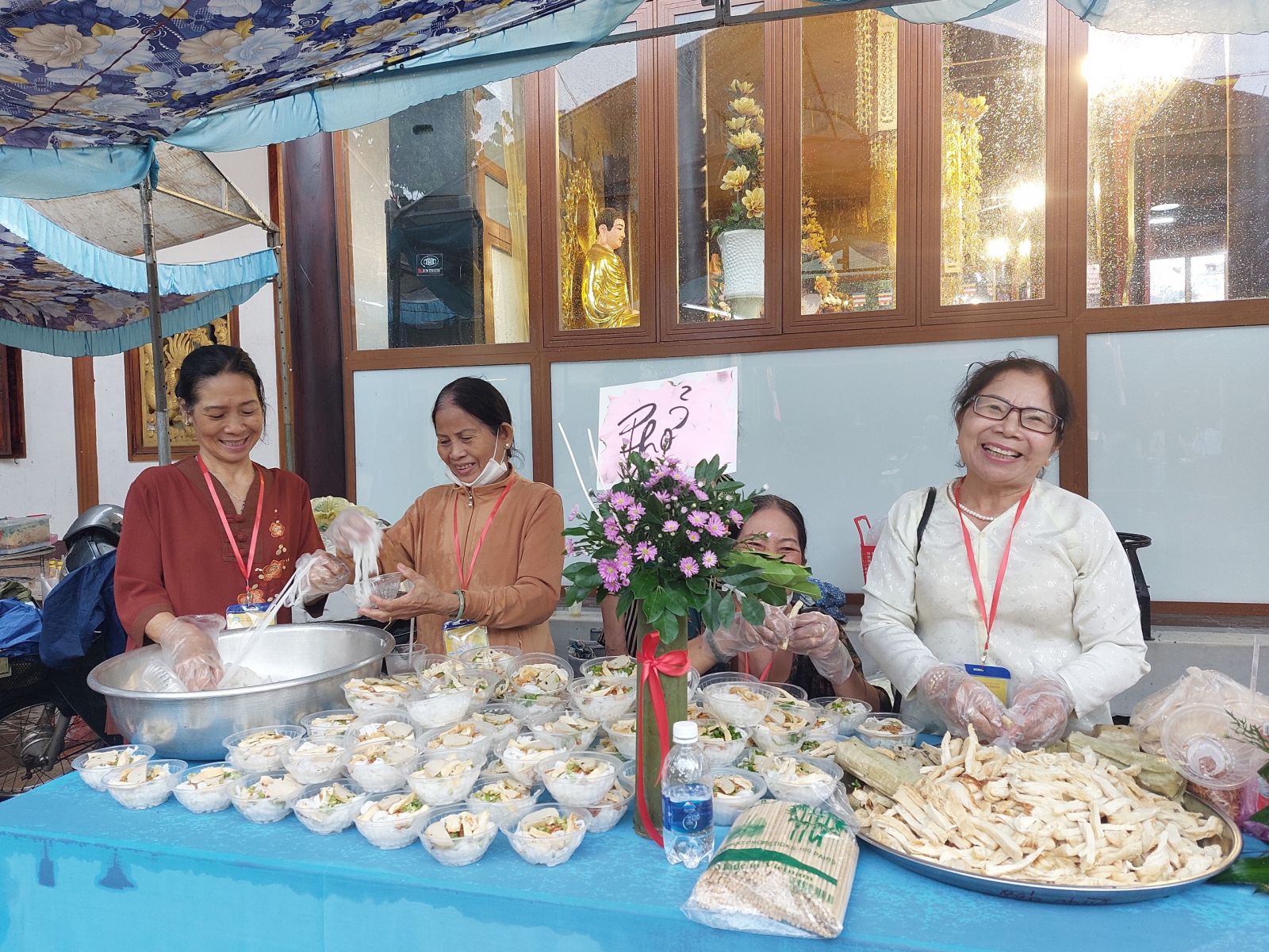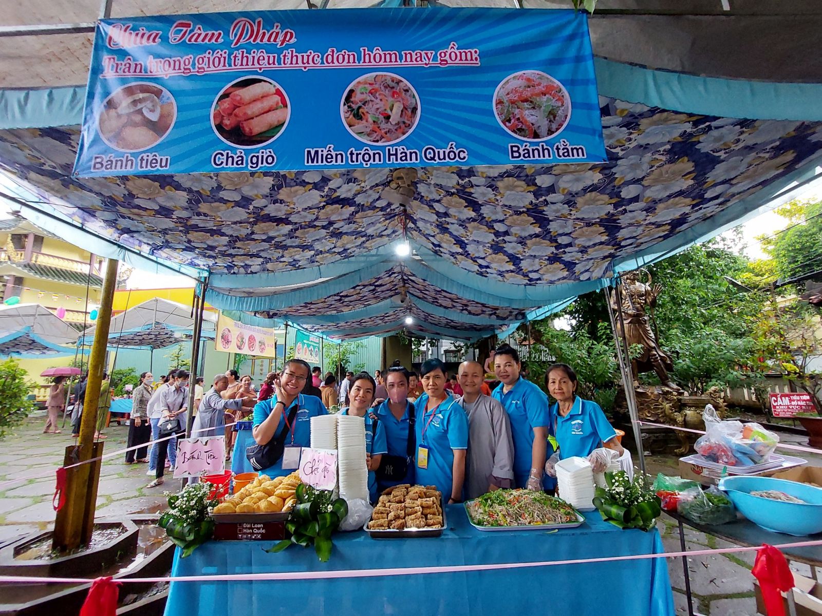 Mặc dù trời mưa bão kéo dài, nhưng hơn 20 đơn vị phát tâm với 70 món ăn vô cùng hấp dẫn và đẹp mắt, đã vất vả nổ lực vận chuyển đồ đạc trong mưa để lo cho tiệc buffet. Những nghĩa cử thật xúc động thân thương để lại ấn tượng trong lòng mọi người.
