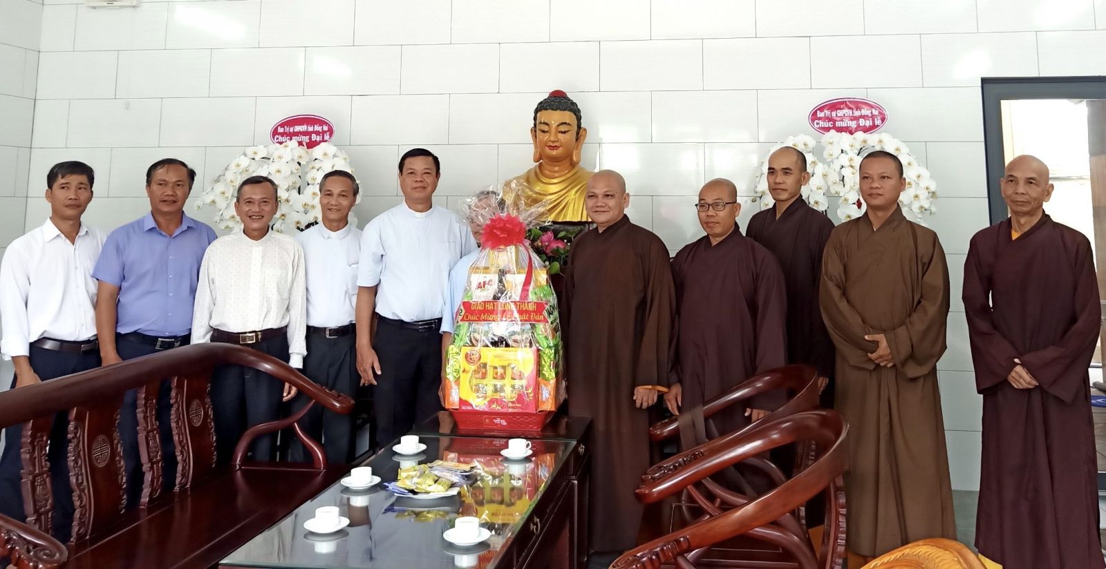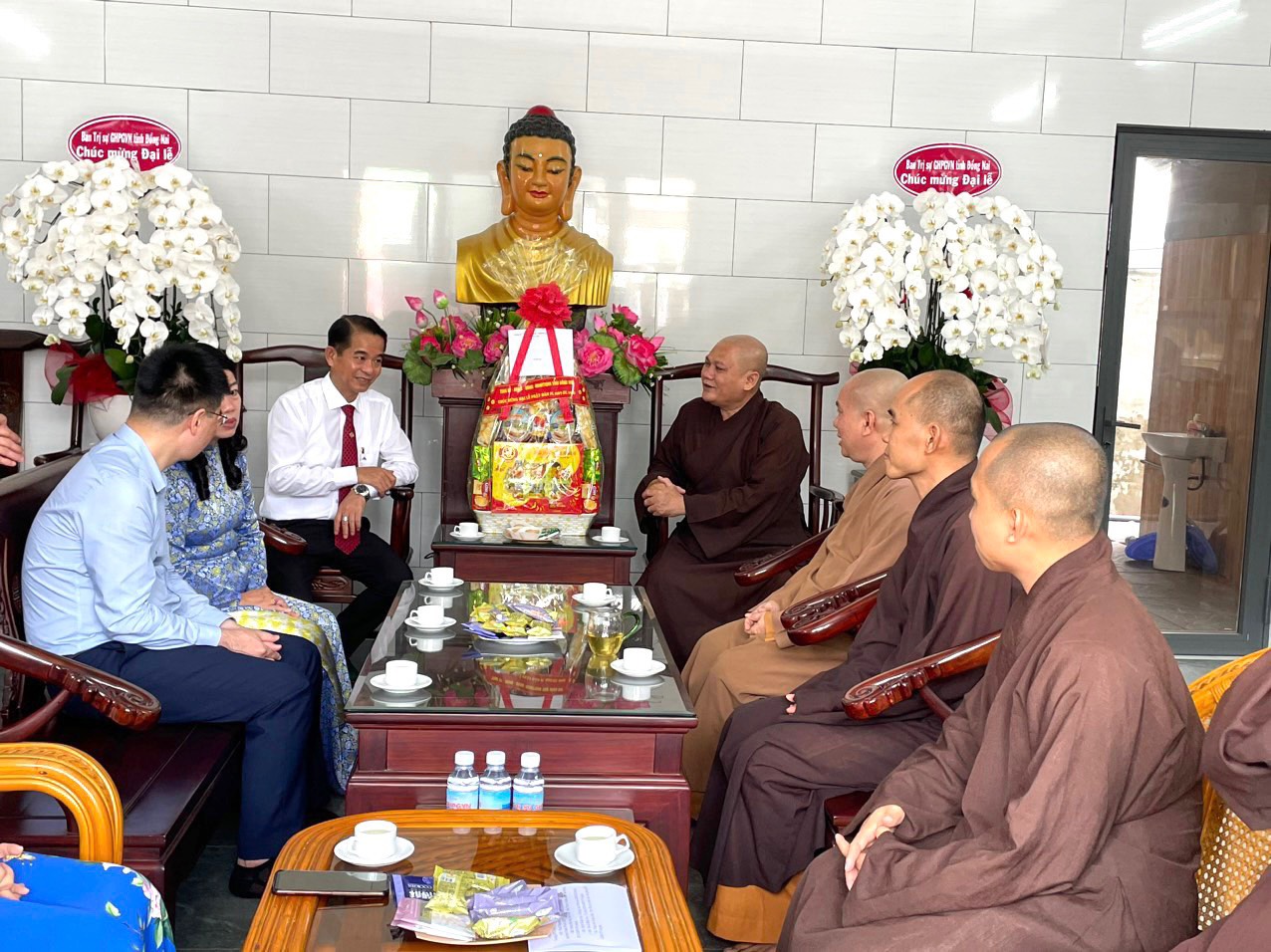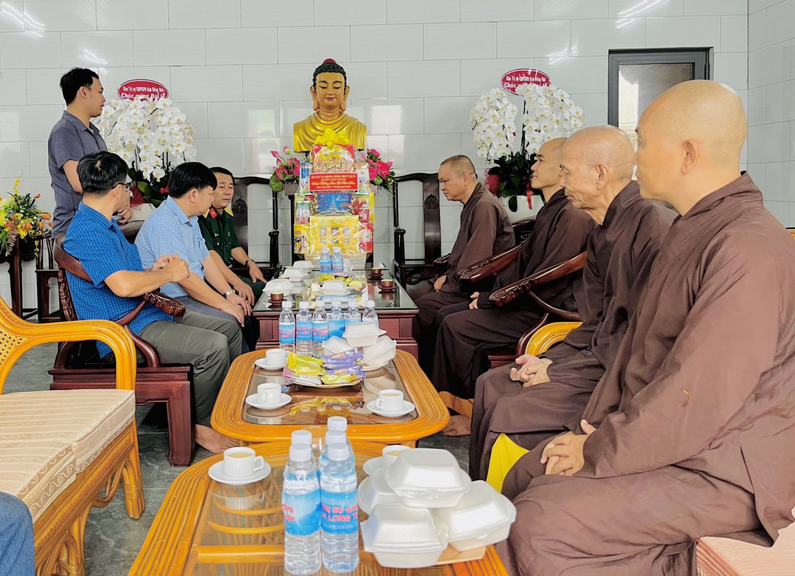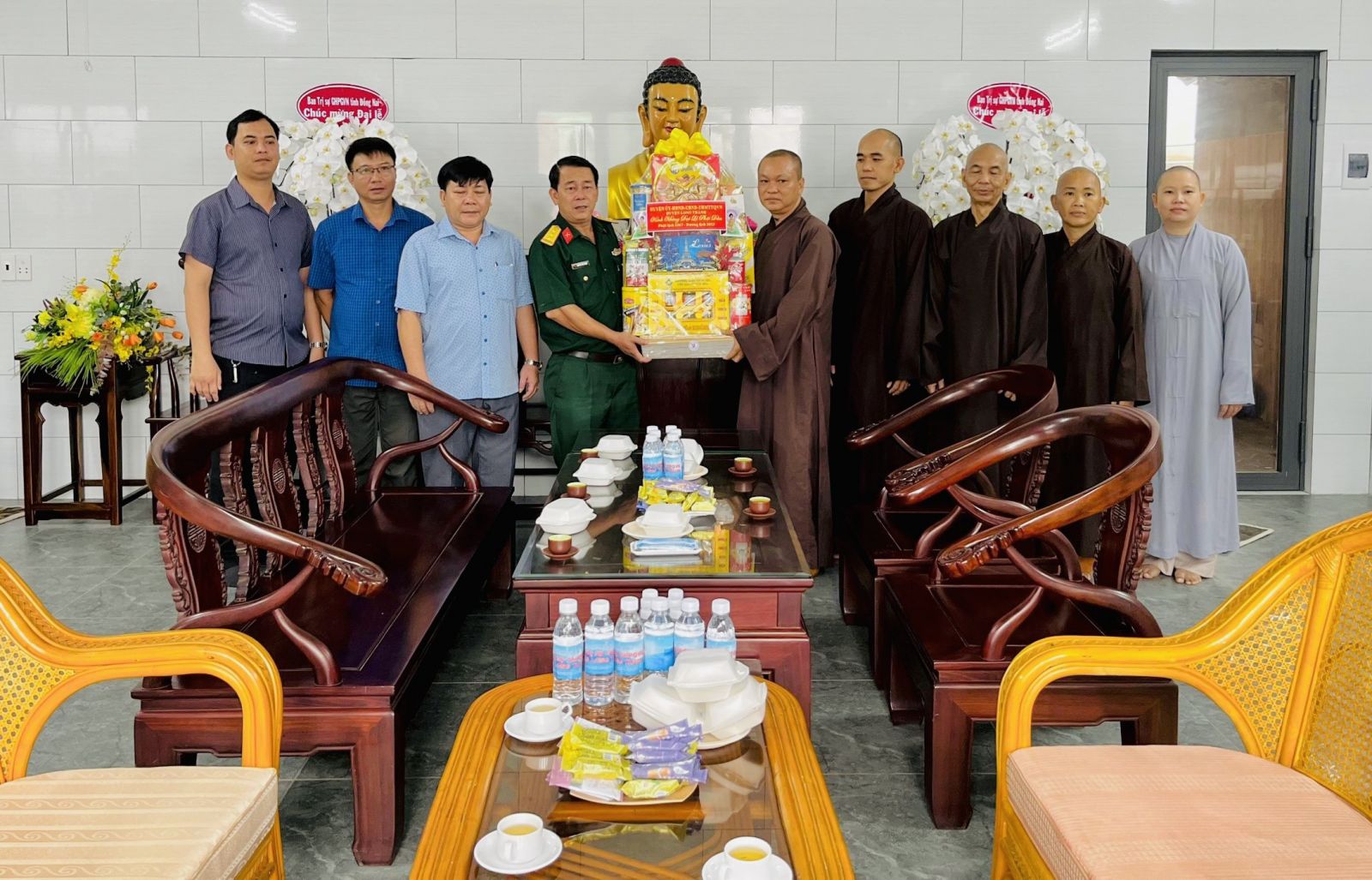 Đón tiếp phái đoàn chúc mừng có: ĐĐ. Thích Đạt Ma Chí Hải – UVTT BTS GHPGVN tỉnh, Trưởng BTS GHPGVN huyện Long Thành; ĐĐ. Thích Nguyên Thông – UV BTS GHPGVN tỉnh, Phó BTS kiêm Chánh thư ký BTS GHPGVN huyện; ĐĐ. Thích Thiện Huy – UV BTS GHPGVN tỉnh, Trưởng ban Văn Hóa PG huyện; ĐĐ. Thích Đạt Ma Tuệ Nhã, Phó Thư ký kiêm Chánh Văn Phòng PG huyện; ĐĐ. Thích Minh Trang; ĐĐ. Thích Hạnh Tín; SC. Tn Nhuận Huệ, Phó VP PG huyện; ĐĐ. Thích Minh Trụ, Phó ban Từ thiện Xã Hội PG huyện; Cùng chư Tôn đức Tăng Ni Văn phòng BTS GHPGVN huyện, chư Tôn đức Tăng Ni BTS GHPGVN huyện Long Thành cùng đón tiếp quý phái đoàn.