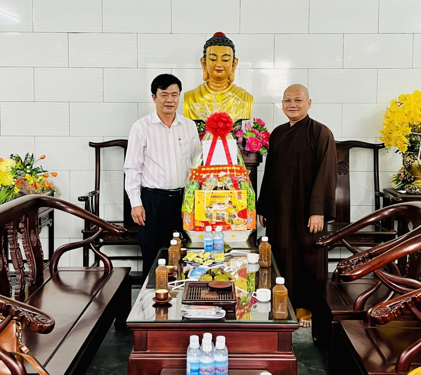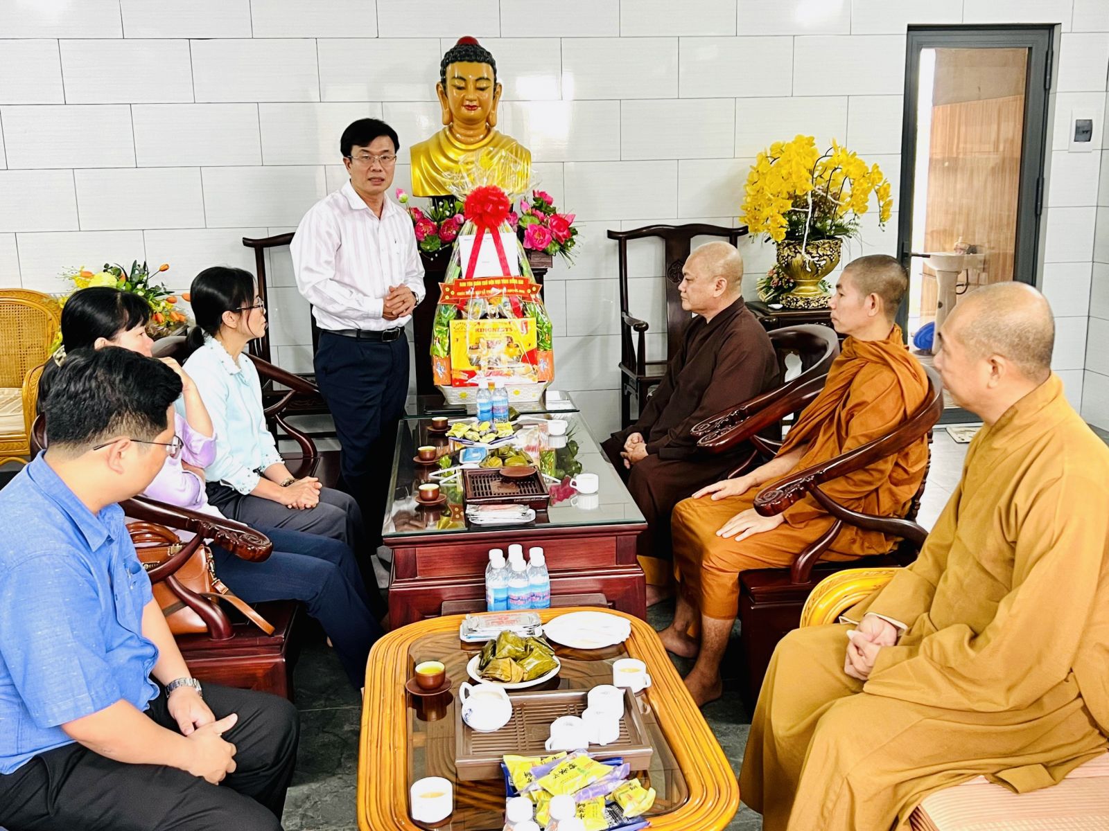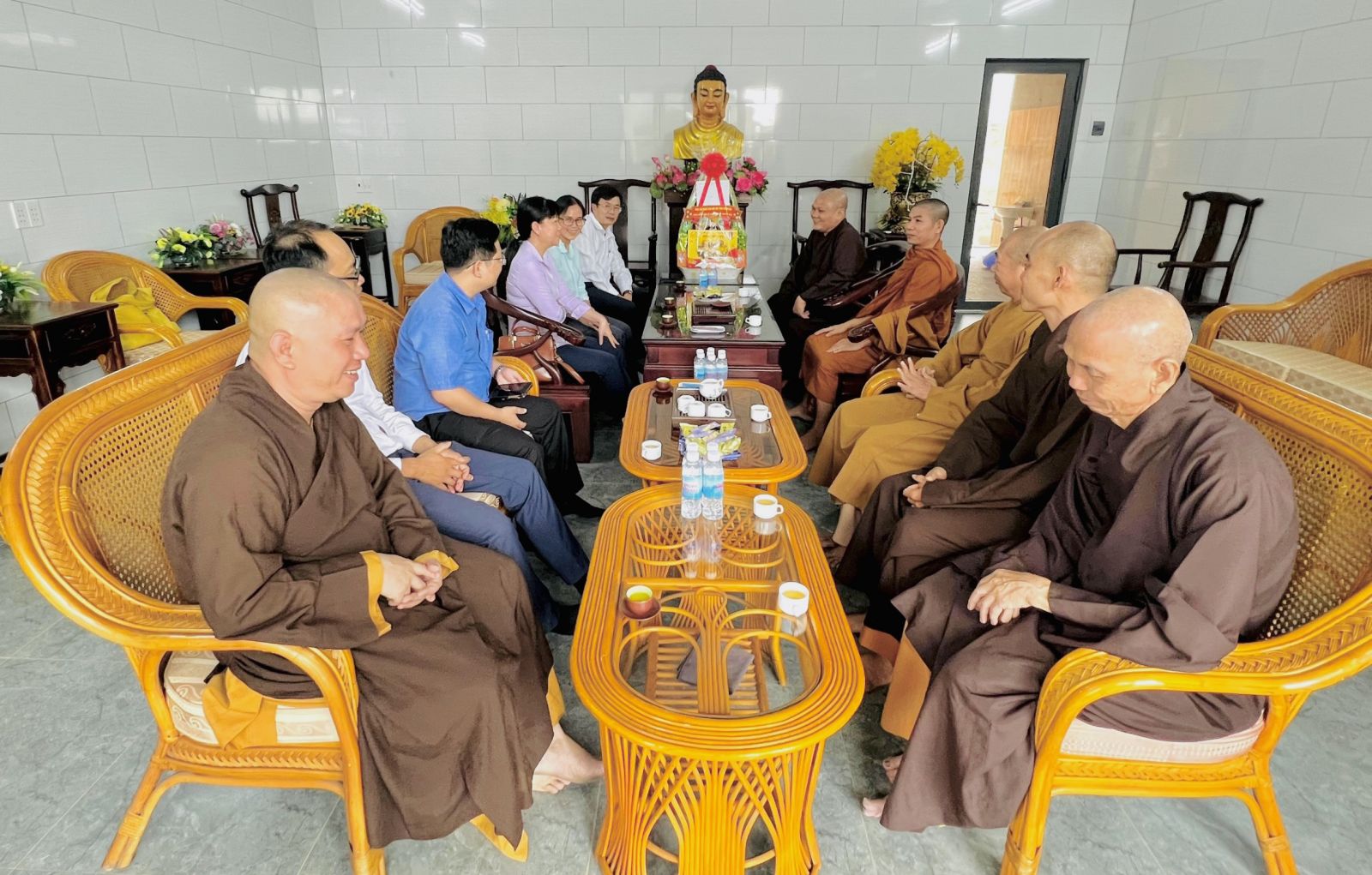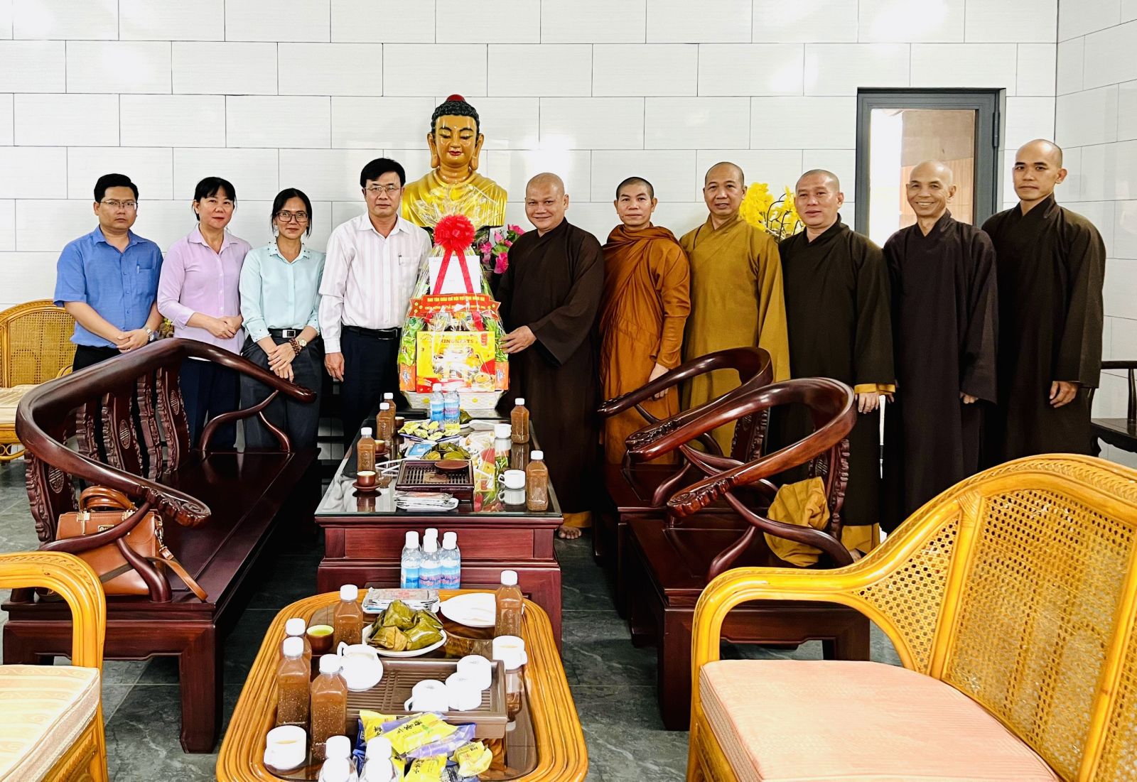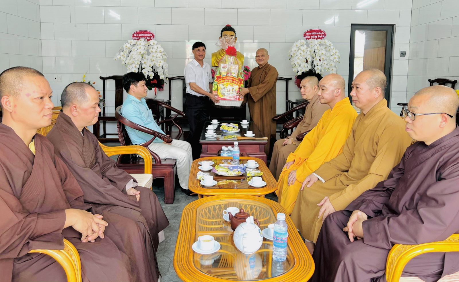 Đón tiếp phái đoàn chúc mừng có: ĐĐ. Thích Đạt Ma Chí Hải – UVTT BTS GHPGVN tỉnh, Trưởng BTS GHPGVN huyện Long Thành; ĐĐ. Thích Nguyên Thông – UV BTS GHPGVN tỉnh, Phó BTS kiêm Chánh thư ký BTS GHPGVN huyện; ĐĐ. Thích Thiện Huy – UV BTS GHPGVN tỉnh, Trưởng ban Văn Hóa PG huyện; ĐĐ. Thích Đạt Ma Tuệ Nhã, Phó Thư ký kiêm Chánh Văn Phòng PG huyện; ĐĐ. Thích Minh Trang; ĐĐ. Thích Hạnh Tín; SC. Tn Nhuận Huệ, Phó VP PG huyện; ĐĐ. Thích Minh Trụ, Phó ban Từ thiện Xã Hội PG huyện; Cùng chư Tôn đức Tăng Ni Văn phòng BTS GHPGVN huyện, chư Tôn đức Tăng Ni BTS GHPGVN huyện Long Thành cùng đón tiếp quý phái đoàn.