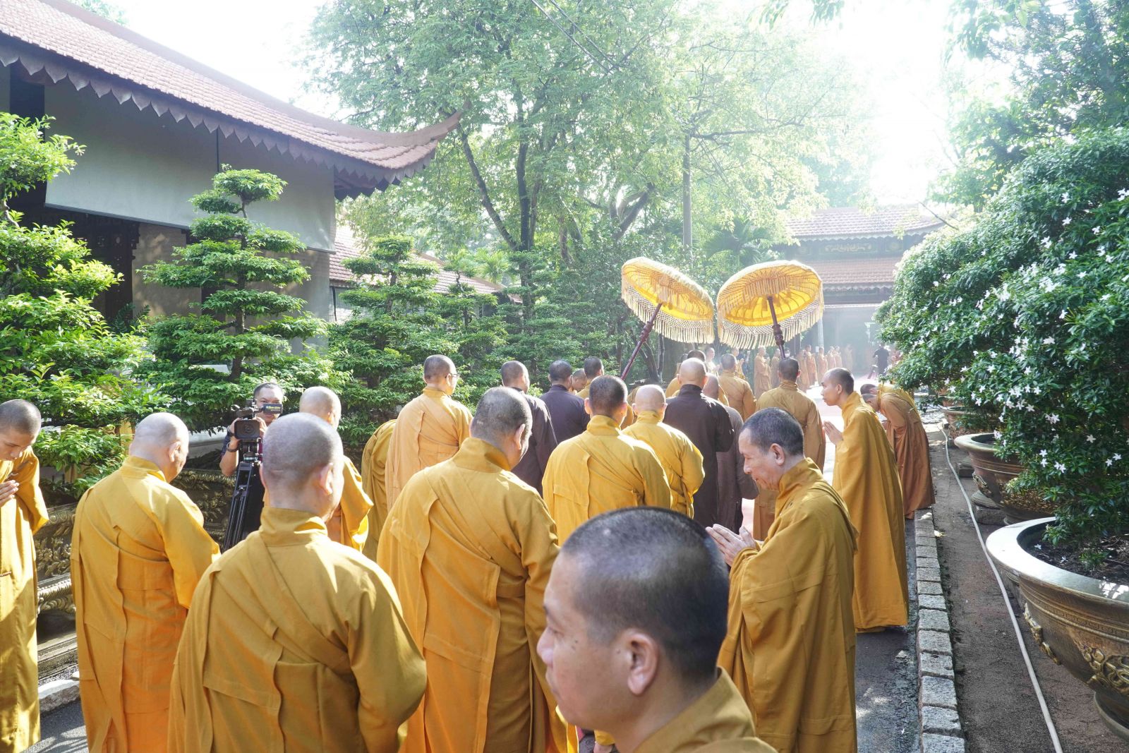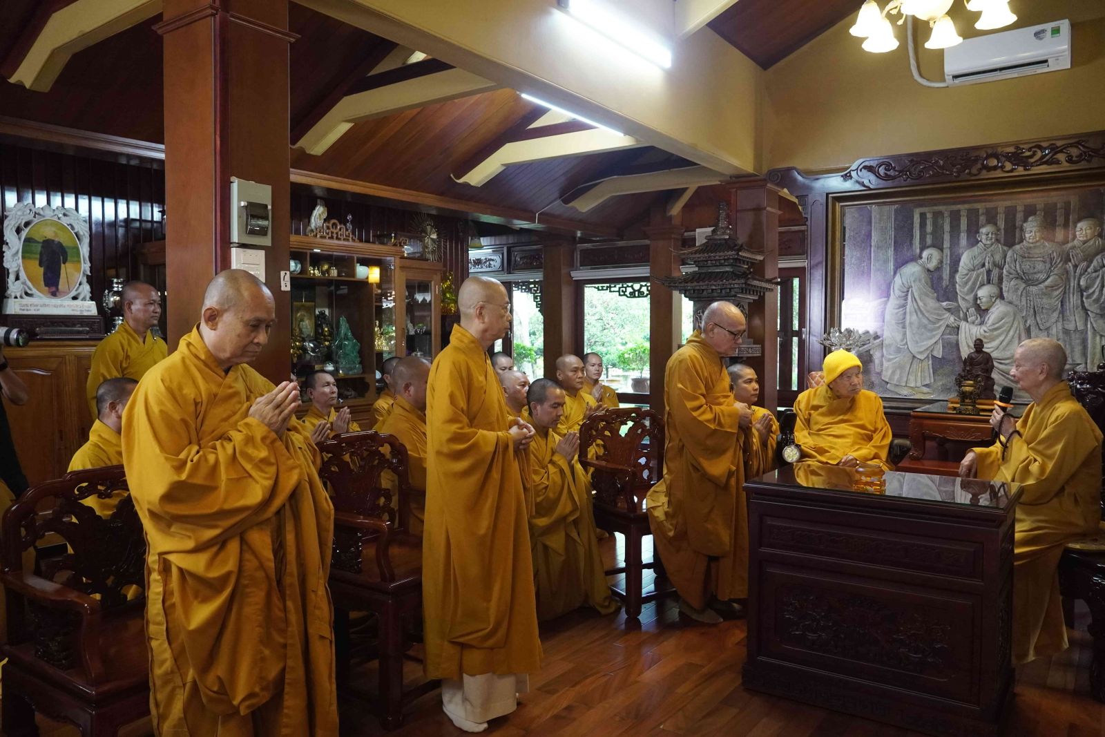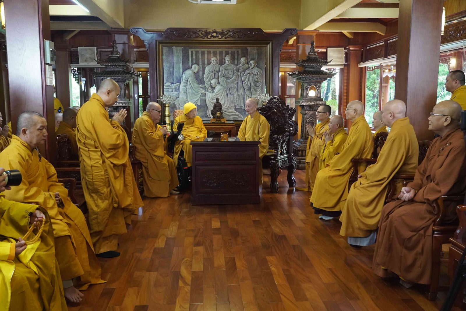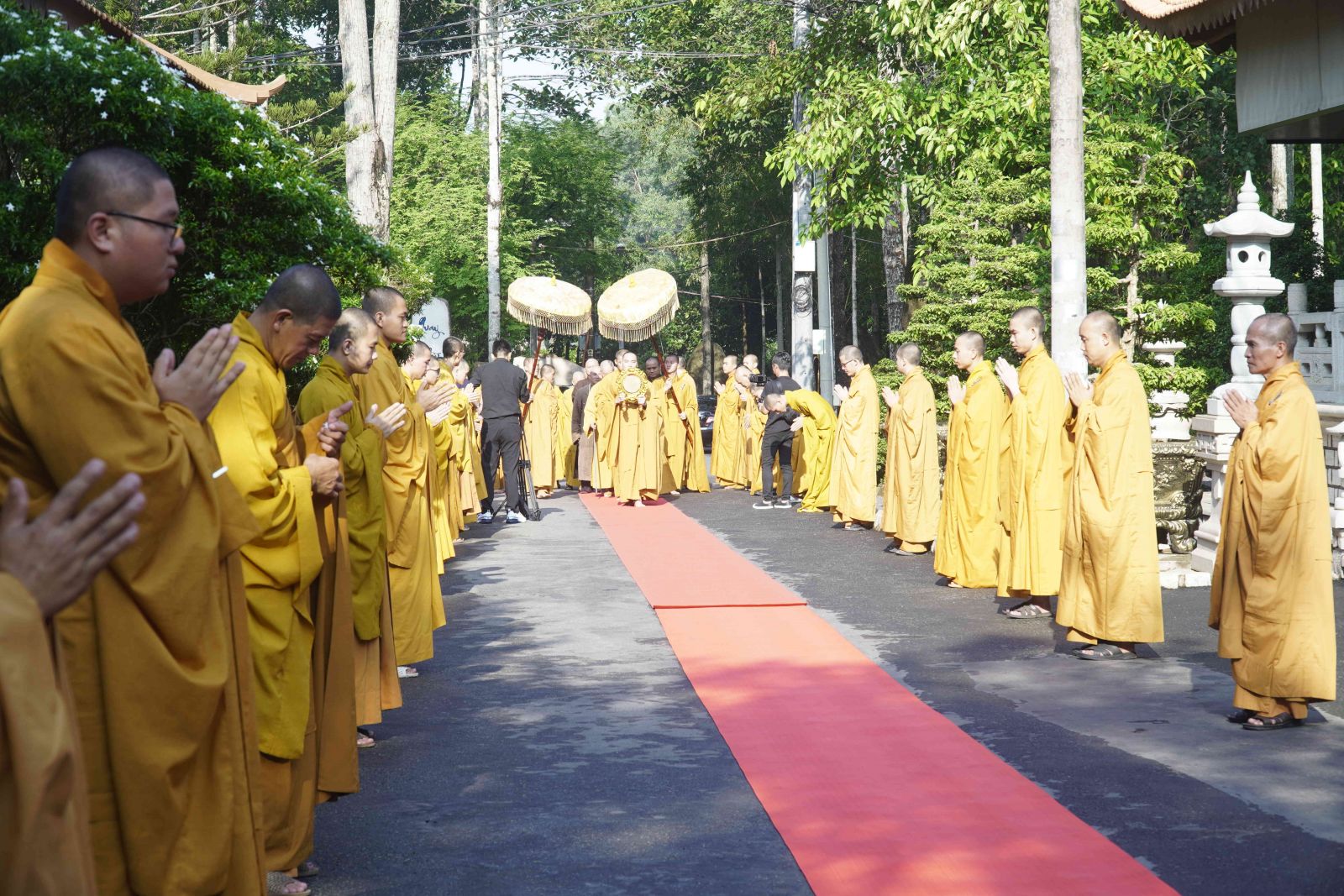 Cung đón Hòa thượng Đức pháp chủ GHPGVN có HT. Thích Nhật Quang - Ủy viên Thường trực HĐCM GHPGVN, Chứng minh Ban Trị sự GHPGVN tỉnh Đồng Nai, Trưởng ban Quản Trị Thiền Phái Trúc Lâm Việt Nam; TT. Thích Huệ Khai - Ủy viên Thường trực HĐTS, Trưởng Ban Trị sự, Trưởng ban Tăng sự GHPGVN tỉnh Đồng Nai; TT. Thích Huệ Sanh - Ủy viên HĐTS, Phó Ban Trị sự, Trưởng ban Hoằng Pháp GHPGVN tỉnh; TT. Thích Thông Hạnh – Phó ban Quản Trị Thiền phái Trúc Lâm Việt Nam; TT. Thích Đạo Huy – Phó ban kiêm Chánh thư ký BTS GHPGVN tỉnh; TT. Thích Minh Trì – Phó Ban Trị sự tỉnh, Trưởng Ban Trị sự GHPGVN huyện Trảng Bom; TT. Thích Huệ Nghiệp – Phó Ban Trị sự, Trưởng ban Pháp chế GHPGVN tỉnh; TT. Thích Quảng Trí – Phó Ban Trị sự, Trưởng ban Nghi lễ GHPGVN tỉnh; Cùng chư tôn đức Ban Trị sự GHPGVN tỉnh, Chư tôn đức Thiền phái Trúc lâm và Chư hành giả An cư Kiết hạ tại Thiền viện Thường Chiếu đồng trang nghiêm cung đón.