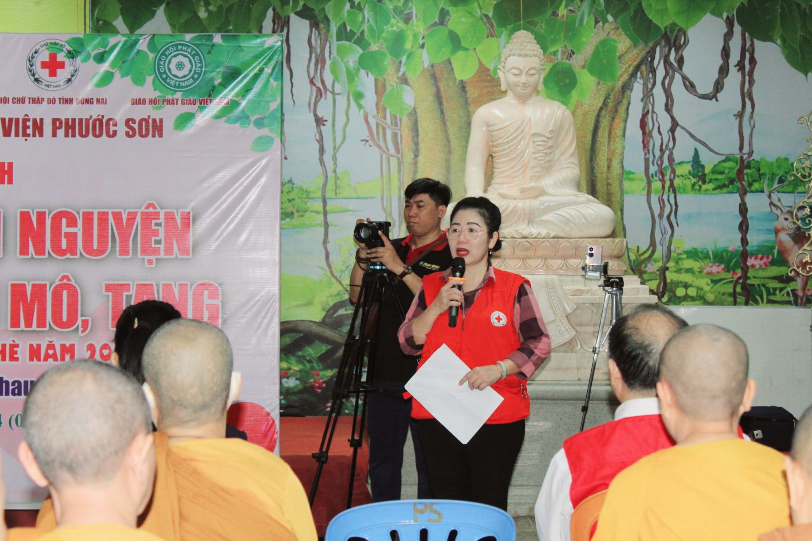 Phát biểu khai mạc, bà Đỗ Thị Phước Thiện chia sẻ niềm hoan hỉ, cám ơn chư Tăng Ni Phật tử phát tâm HMNĐ và hiến mô tạng.