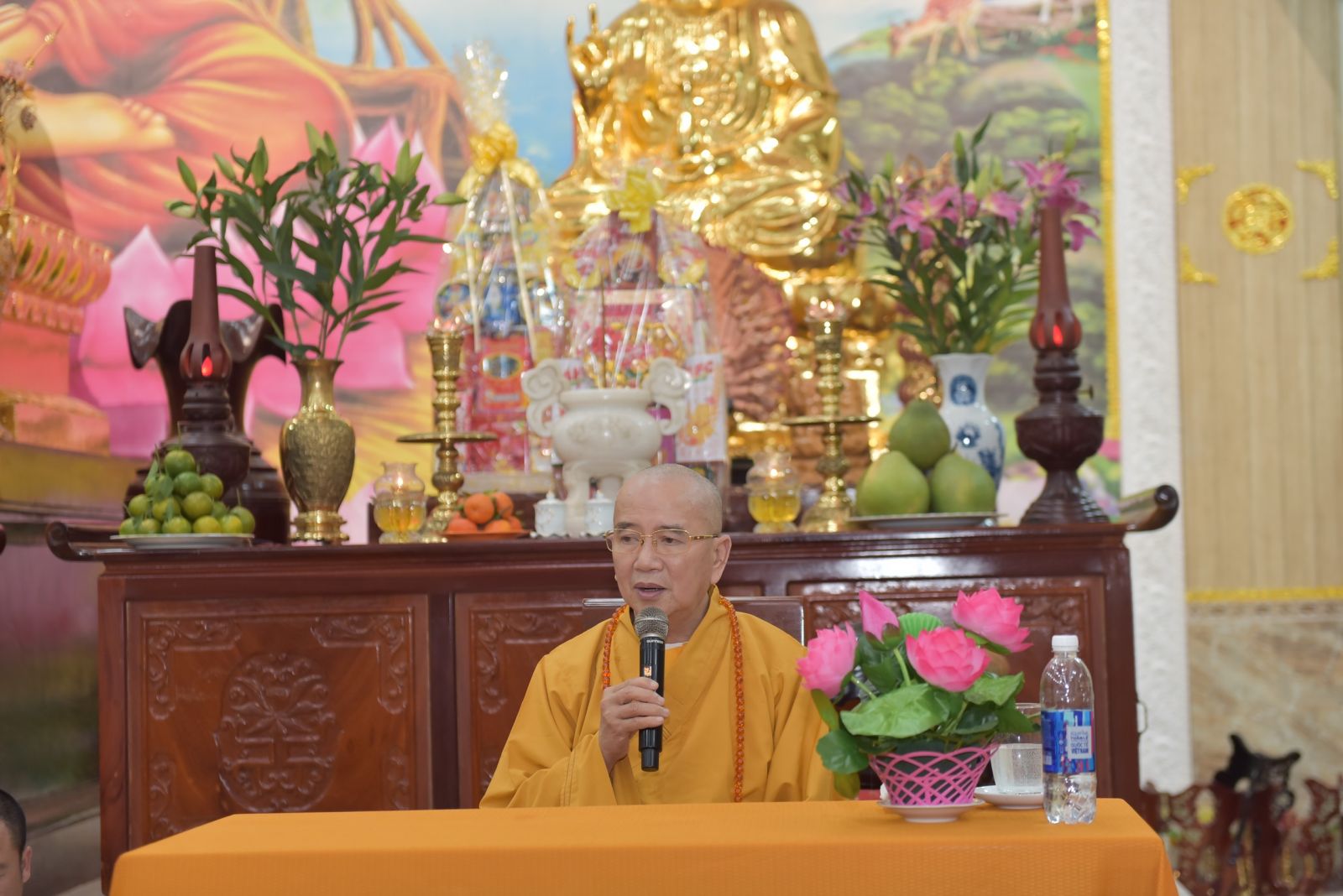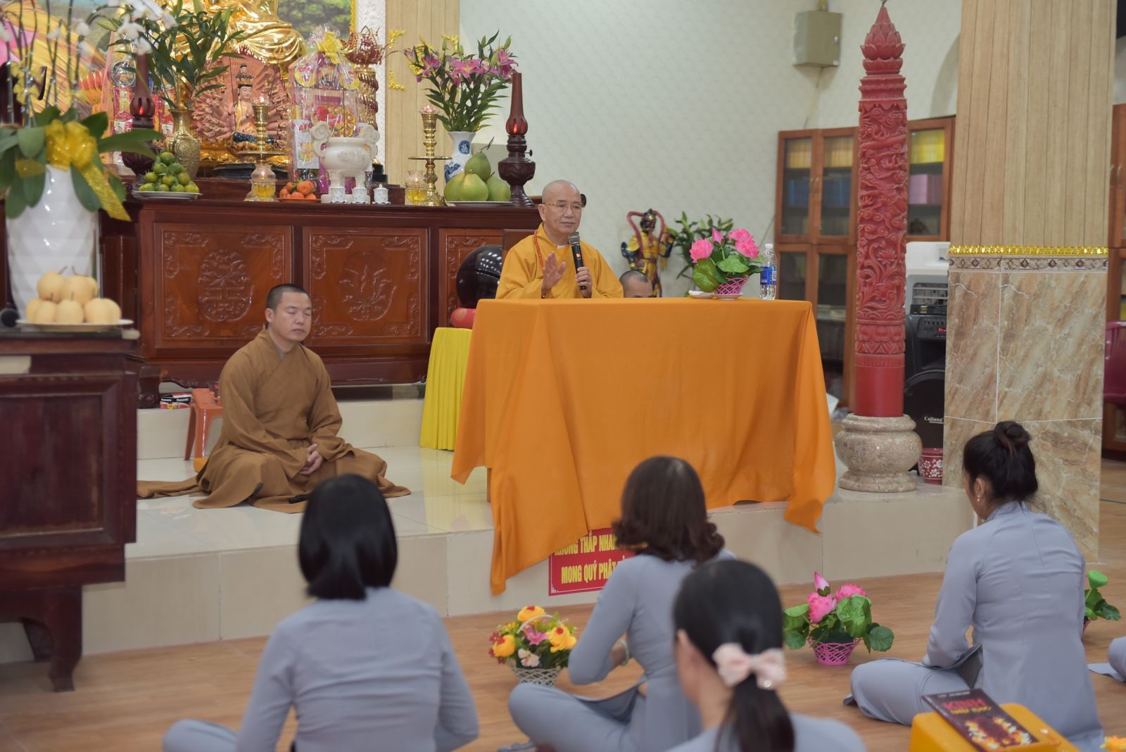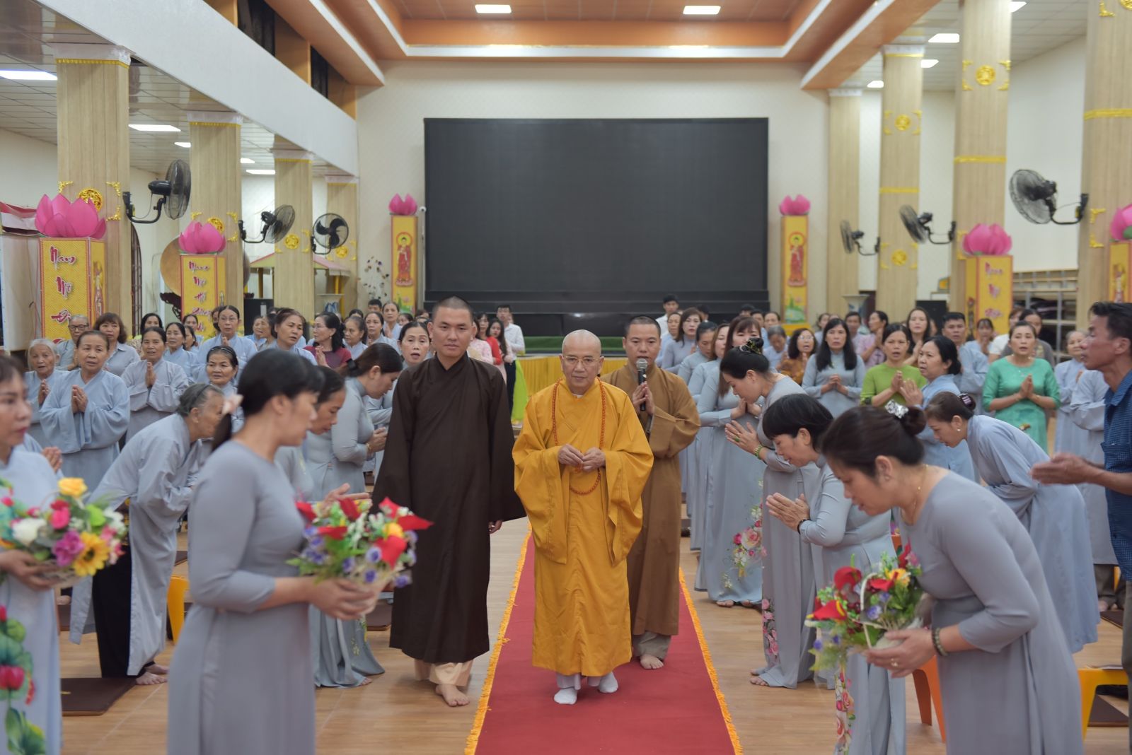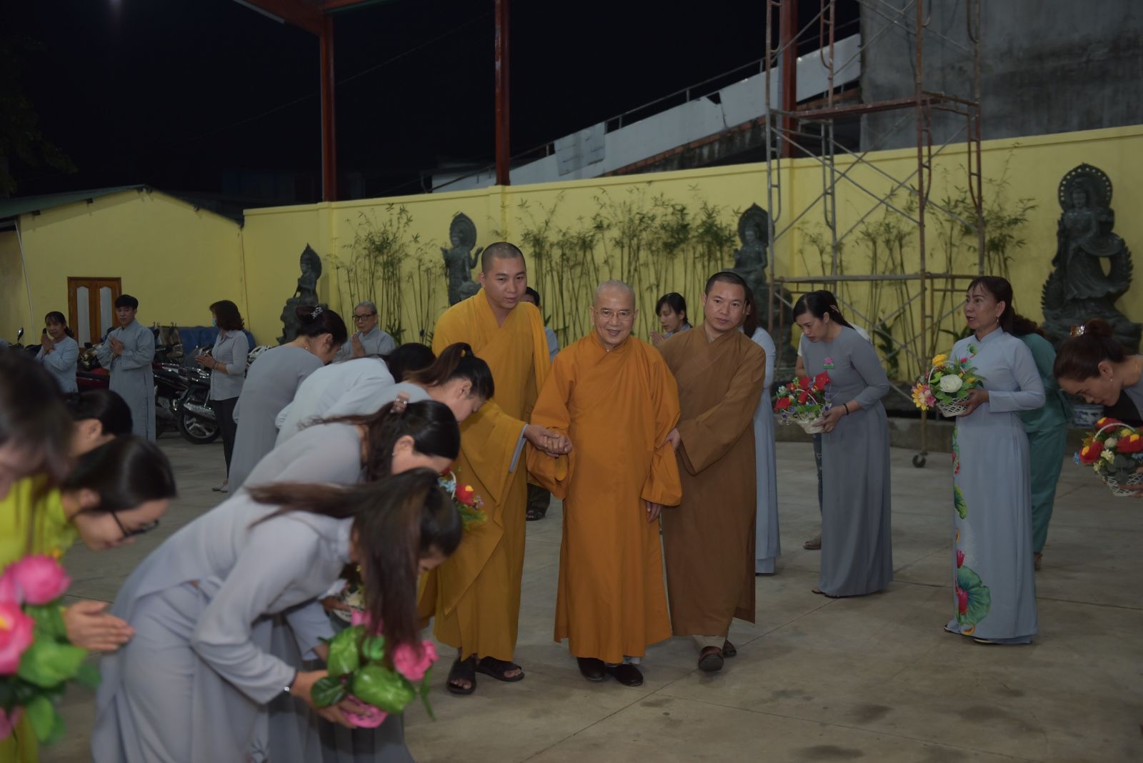 Ba hồi chuông trống Bát Nhã vang lên trầm hùng, nơi chánh điện hàng Phật tử ngân nga tiếng niệm Phật cung đón Hoà thượng quang lâm chia sẻ những lời Pháp của Đức Thế Tôn. Dừng chân tại Trúc Lâm Viên Nghiêm, Hoà thượng thấy hoan hỷ với những gì mà đệ tử của Ngài đã dấn thân vì Đạo Pháp, vì sự nghiệp hoằng pháp độ sanh. Qua những lời thăm hỏi, HT tán thán tinh thần, sự nhiệt huyết chung tay vì Đạo Pháp của toàn thể Chư Tăng, Phật tử trải qua bao nhiêu khó khăn, thăng trầm nay đã hoàn thiện được ngôi Tam Bảo trang nghiêm, rộng rãi. Khi một ngôi chùa được xây dựng lên là cánh cửa nhà tù được khép lại. Chư Tăng tâm nguyện hoằng dương Chánh Pháp, lại nhờ thêm sự phát tâm cao quý hộ trì Tam Bảo để những con đường hoằng pháp của Chư Tăng được thuận duyên viên mãn. Tứ chúng đồng tu, đạo tràng hoà hợp thì ắt thiền môn hưng thịnh, Pháp bảo trường tồn.
