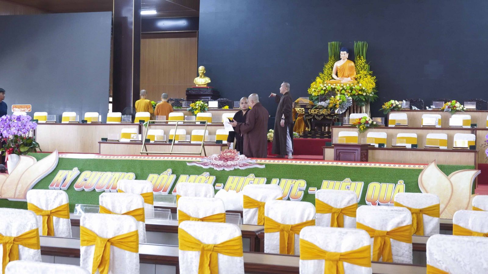 Công tác trần thiết (trang trí và sắp đặt không gian Đại hội) được Ban Tổ chức đặc biệt quan tâm, bảo đảm yếu tố trang nghiêm, thanh tịnh và mang đậm bản sắc Phật giáo. Hội trường chính được thiết kế theo bố cục cân đối, tôn trí tôn tượng Đức Phật trang nghiêm ở vị trí trung tâm, tạo điểm tựa tâm linh cho toàn thể Đại hội.