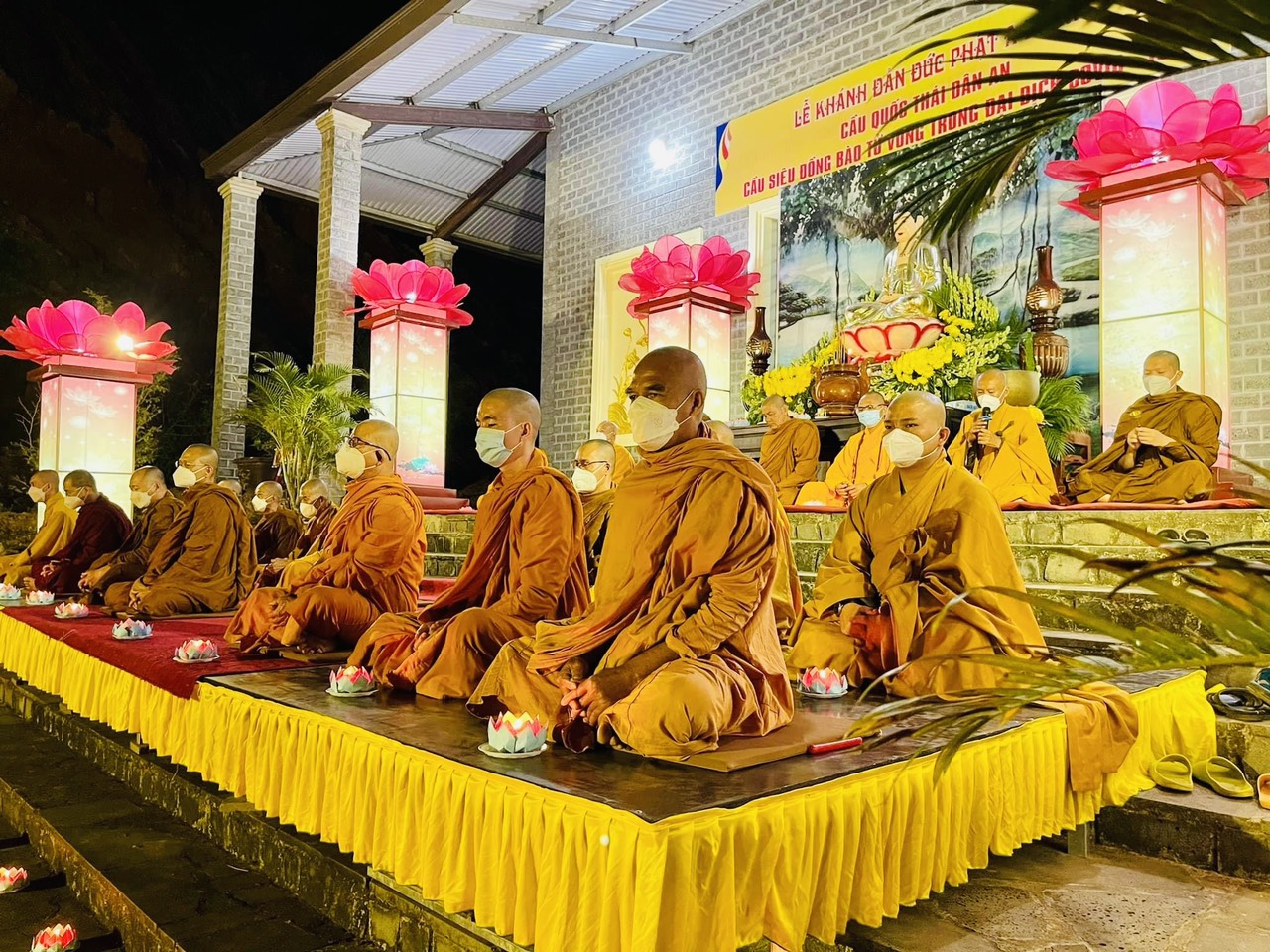 Tại buổi lễ Hòa thượng Thích Pháp Cần niêm hương, đảnh lễ Tam Bảo, tiếp đến quý Tôn đức tăng cử hành nghi lễ truyền thống của Phật giáo gồm: tán hương, tụng kinh, truyền đăng,…Sau khi truyền đăng Hòa thượng có nhắc về ý nghĩa của ngày Vía Khánh đản Đức Phật A Di Đà và những hạnh nguyện vô lượng của ngài. Hòa thượng nhấn mạnh về việc xây dựng cực lạc nhân gian chính là cách để chúng ta có được một đời sống an lạc. cùng với đó là sự chia sẻ về đại dịch Covid-19 đã gây ra nhiều đau thương, mất mát lớn cho nhân loại. Không chỉ riêng đối với Việt Nam mà còn cả với thế giới, khiến nhiều người tử vong.