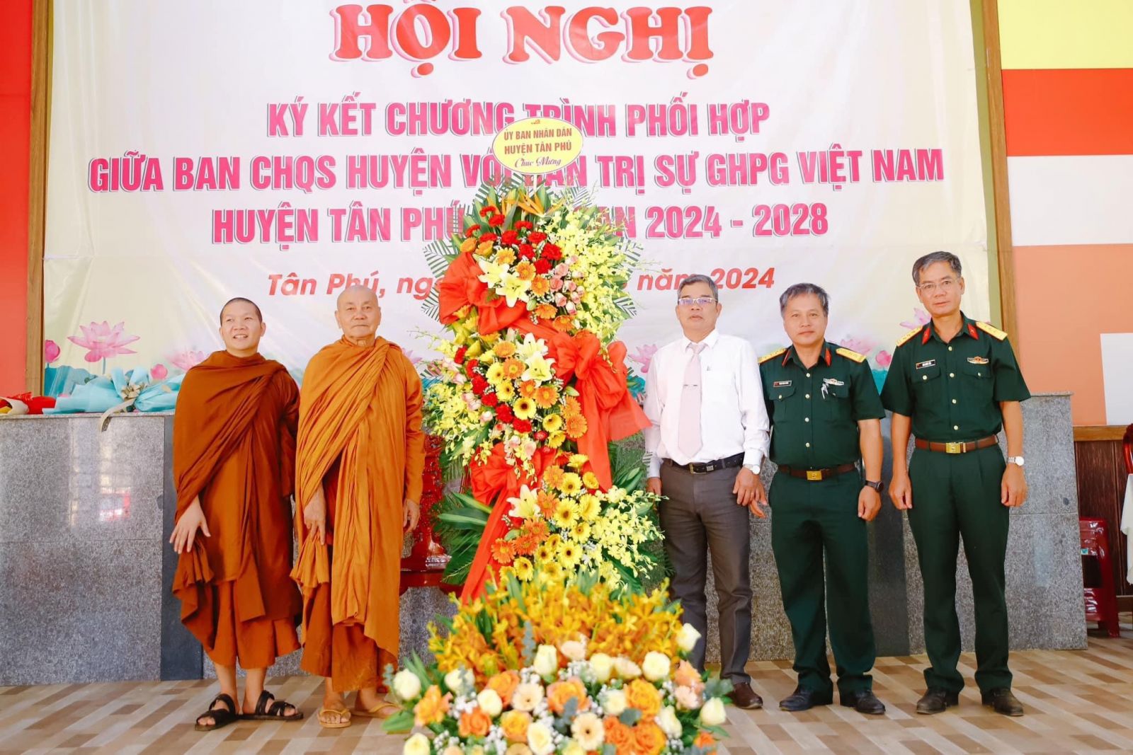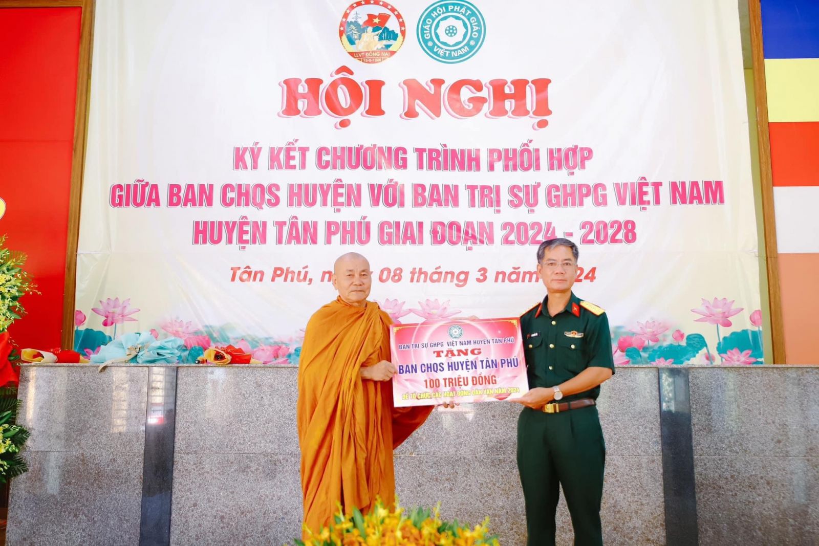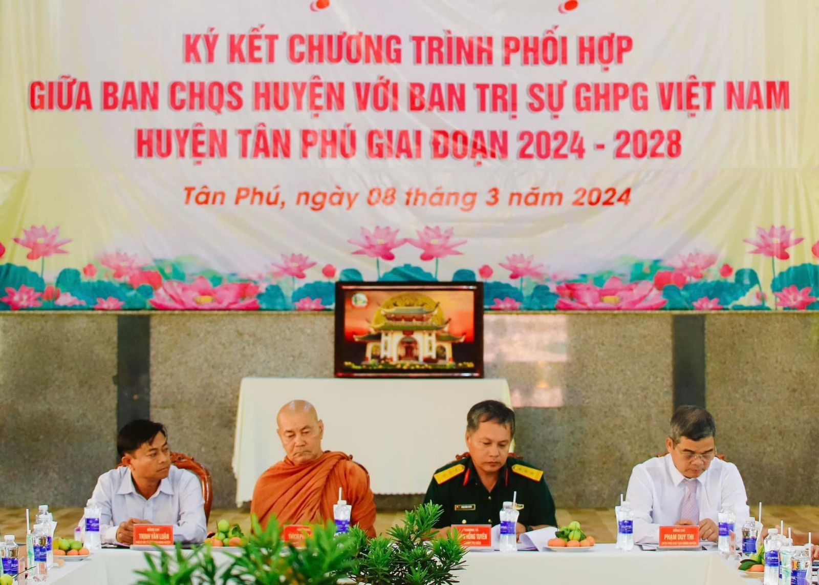 Tại đây, HT. Thích Pháp Cần thay mặt Thường trực BTS huyện cảm ơn Ban Chỉ huy Quân sự huyện đã mời Ban Trị sự PG huyện tham gia ký kết chương trình phối hợp hoạt động giai đoạn 2024 - 2028. Hòa thượng Trưởng ban khẳng định: Sự phối hợp với Ban Chỉ huy Quân sự huyện thực hiện các nội dung chương trình ký kết là bổn phận trách nhiệm công dân của mỗi Tăng Ni, Phật tử, phù hợp tôn chỉ, giáo lý Phật giáo đó là: “Phật pháp bất ly thế gian giác”. Nhân dịp hội nghị ký kết, Ban Trị sự GHPGVN huyện Tân Phú trân trọng gửi tặng 100 triệu đồng, góp phần cùng Ban Chỉ huy Quân sự chuyện thực hiện chương trình dân vận vì an sinh xã hội.