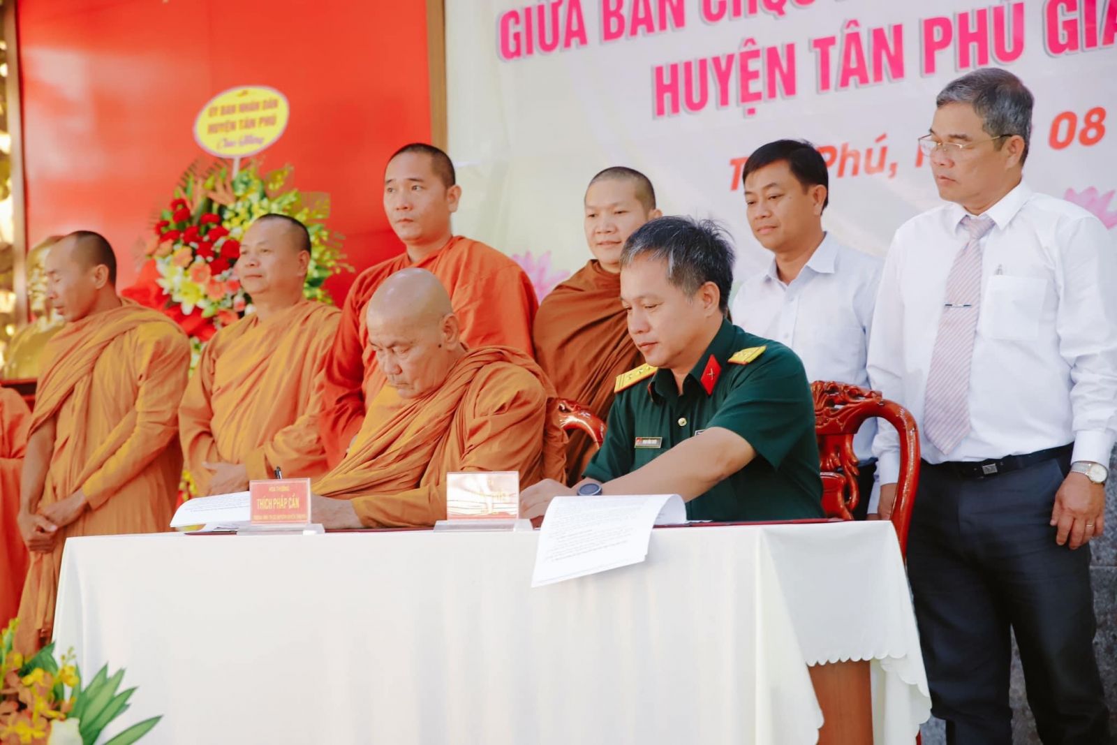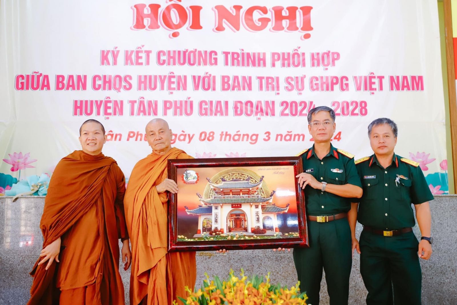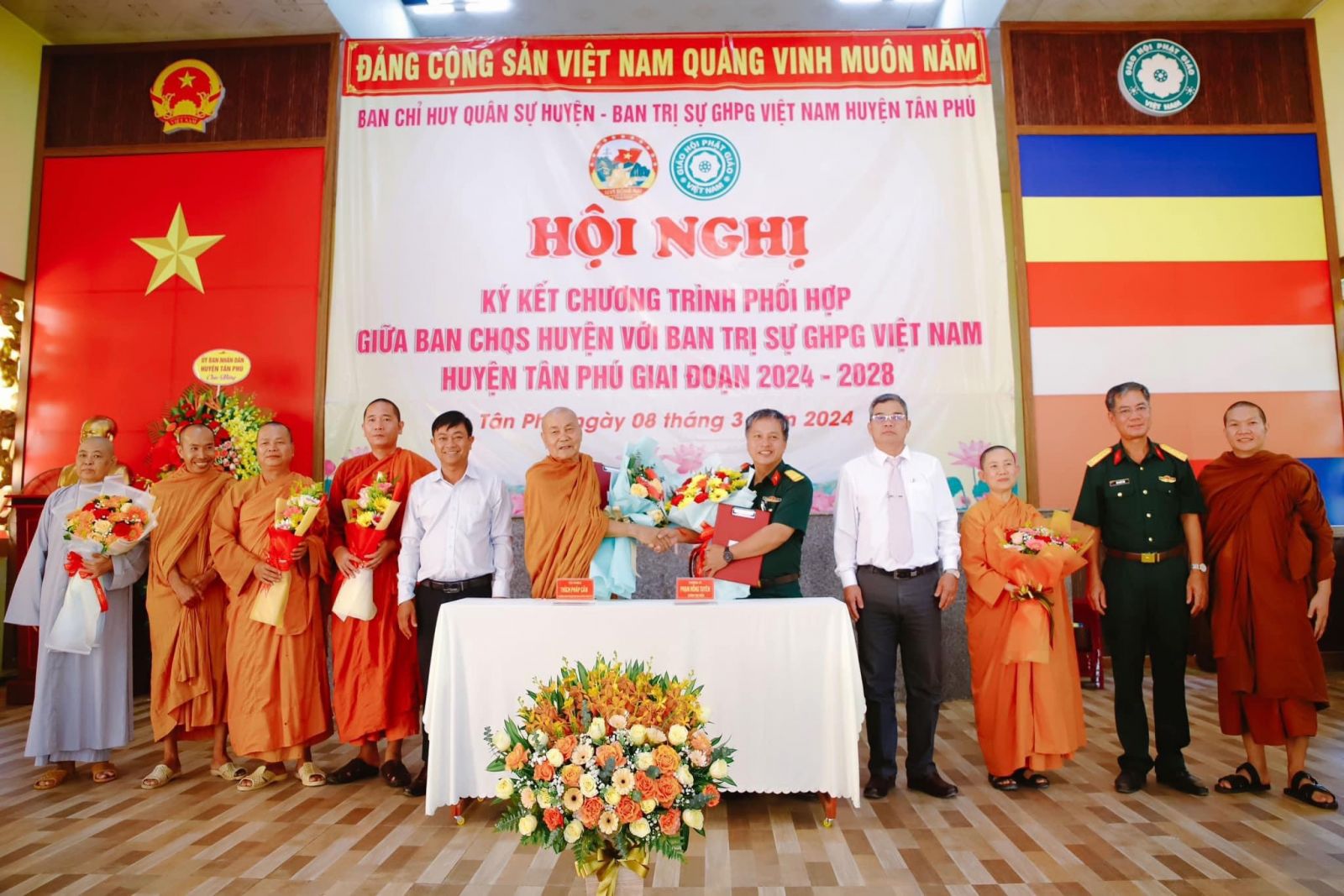 Tại đây, HT. Thích Pháp Cần thay mặt Thường trực BTS huyện cảm ơn Ban Chỉ huy Quân sự huyện đã mời Ban Trị sự PG huyện tham gia ký kết chương trình phối hợp hoạt động giai đoạn 2024 - 2028. Hòa thượng Trưởng ban khẳng định: Sự phối hợp với Ban Chỉ huy Quân sự huyện thực hiện các nội dung chương trình ký kết là bổn phận trách nhiệm công dân của mỗi Tăng Ni, Phật tử, phù hợp tôn chỉ, giáo lý Phật giáo đó là: “Phật pháp bất ly thế gian giác”. Nhân dịp hội nghị ký kết, Ban Trị sự GHPGVN huyện Tân Phú trân trọng gửi tặng 100 triệu đồng, góp phần cùng Ban Chỉ huy Quân sự chuyện thực hiện chương trình dân vận vì an sinh xã hội.