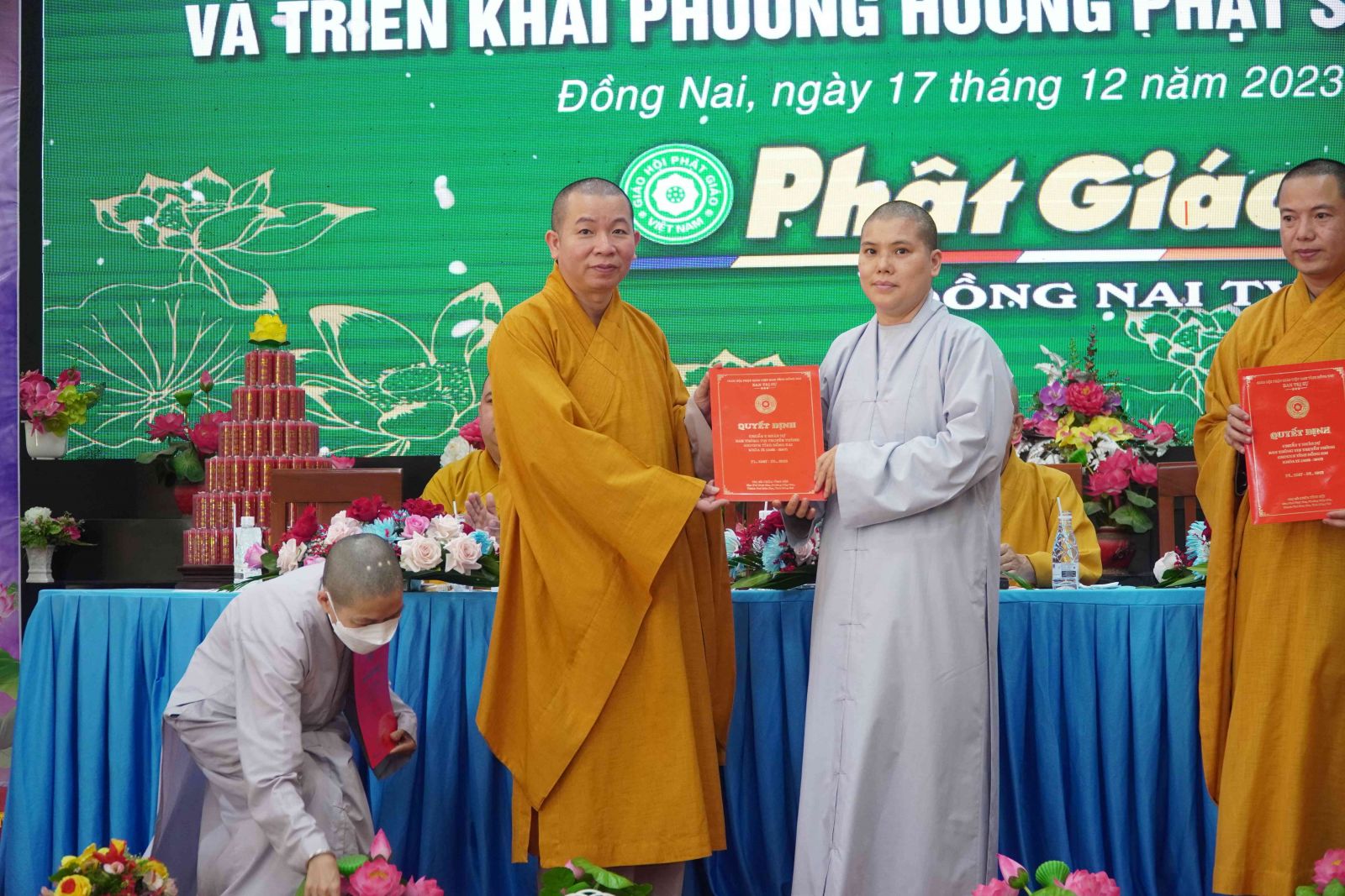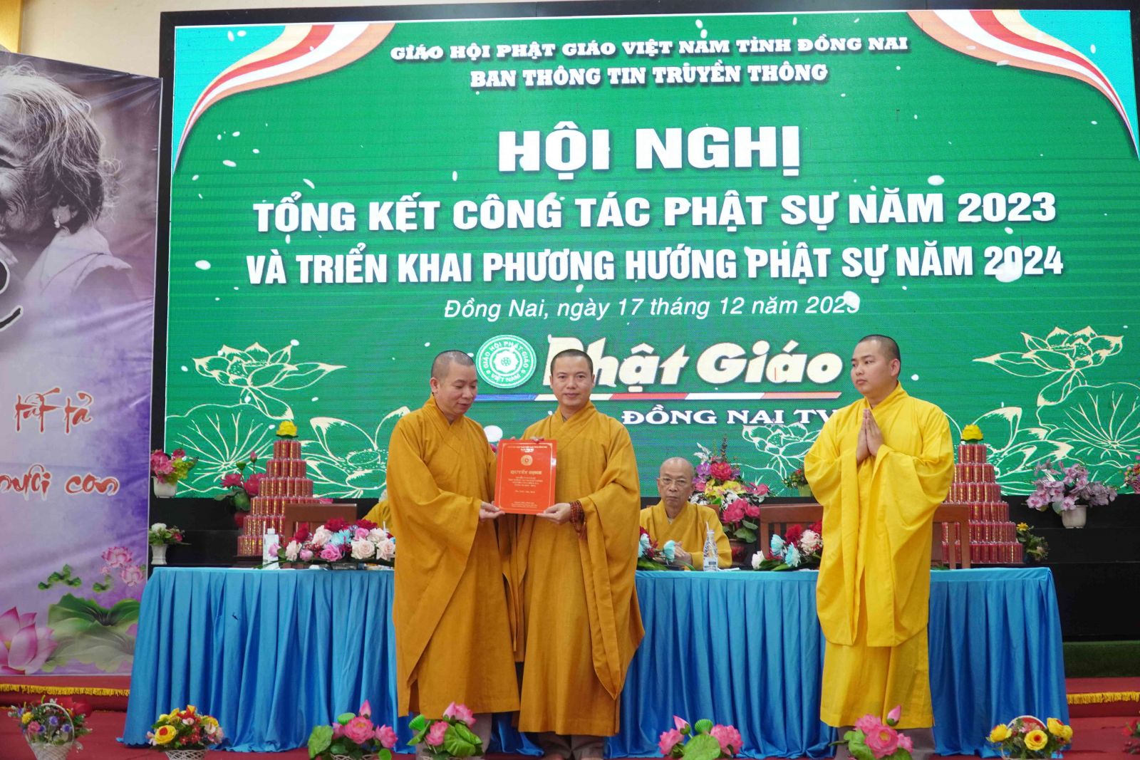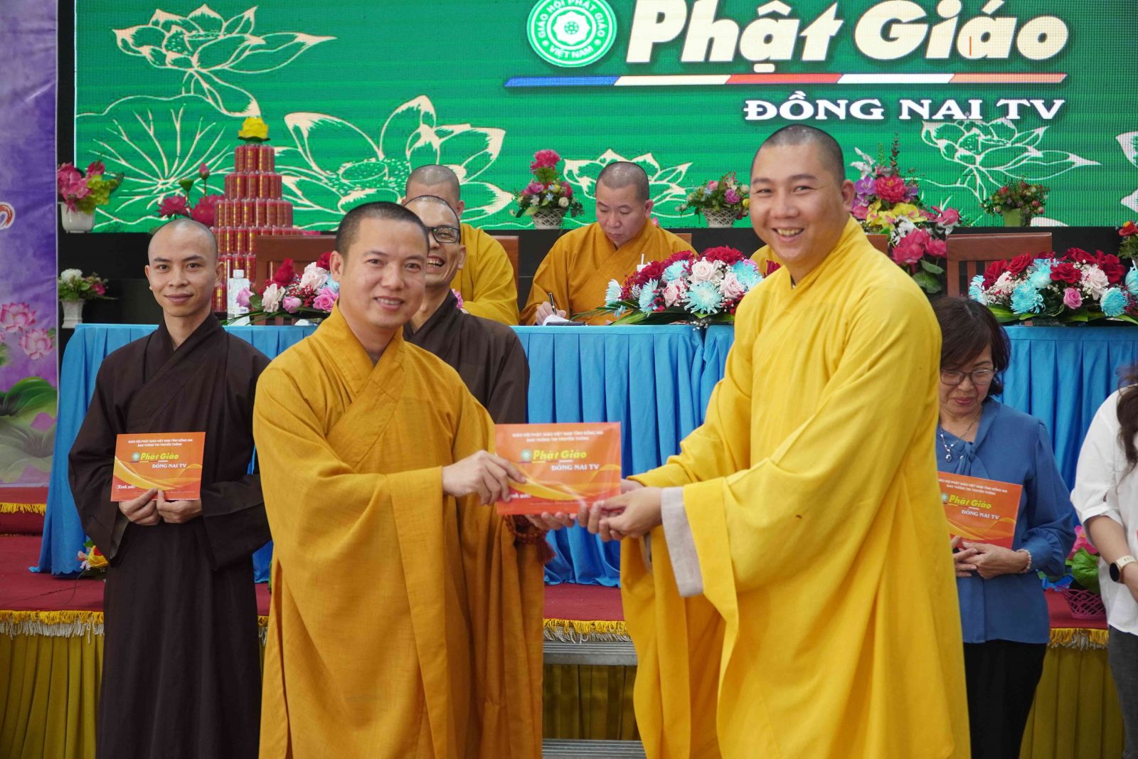 Cũng trong hội nghị, lần này Ban Trị sự GHPGVN tỉnh Đồng Nai tiếp tục trao quyết định Chuẩn y nhân sự ban TTTT nhiệm kỳ 2022 – 2027 cho những thành viên được bổ sung và ban TTTT cũng trao thẻ thành viên ban Biên tập, tài khoản của kênh Phật Giáo Đồng Nai TV.