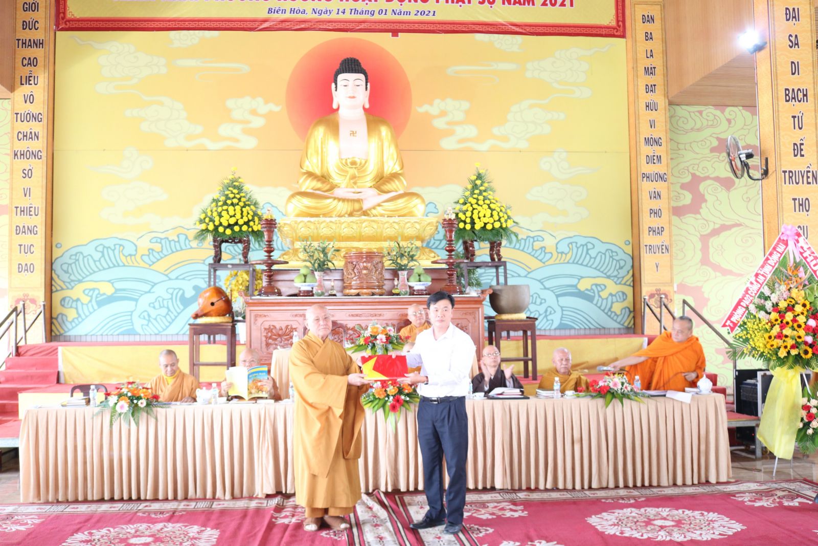 Mở đầu chương trình Hội nghị, BTS GHPGVN tỉnh Đồng Nai hoan hỷ được tiếp nhận lá cờ Tổ quốc và lá cờ Phật giáo từ Ban Tôn giáo Chính Phủ do Ban Tôn giáo tỉnh Đồng Nai đại diện trao tặng. Sau đó Hội nghị đã tổ chức một buổi chào cờ Quốc Kỳ và Đạo Kỳ trang nghiêm trước Trụ sở văn phòng BTS GHPGVN tỉnh Đồng Nai.