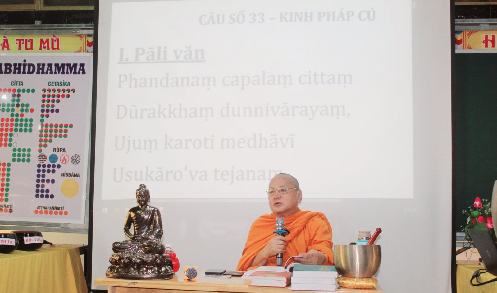 Dưới sự hướng dẫn của hòa thượng trưởng ban, đại chúng ôn lại hai phẩm đã học, hòa thượng hướng dẫn cách đọc theo song ngữ âm Pali Việt, giải thích ý nghĩa từng câu kinh Pháp Cú trong chương III - phẩm Tâm (DHP III - CITTAVAGGO) gồm có 11 câu (33-43).