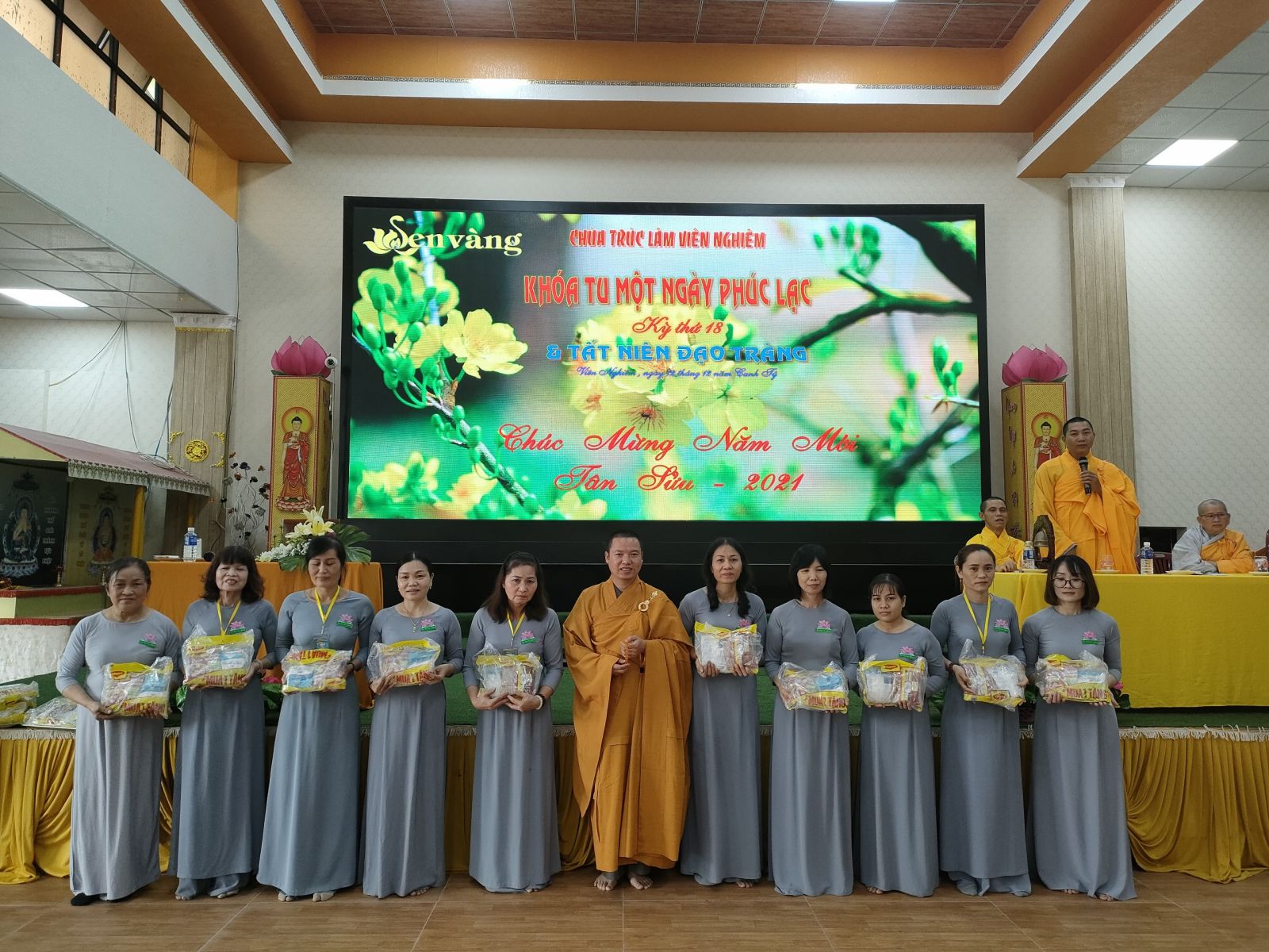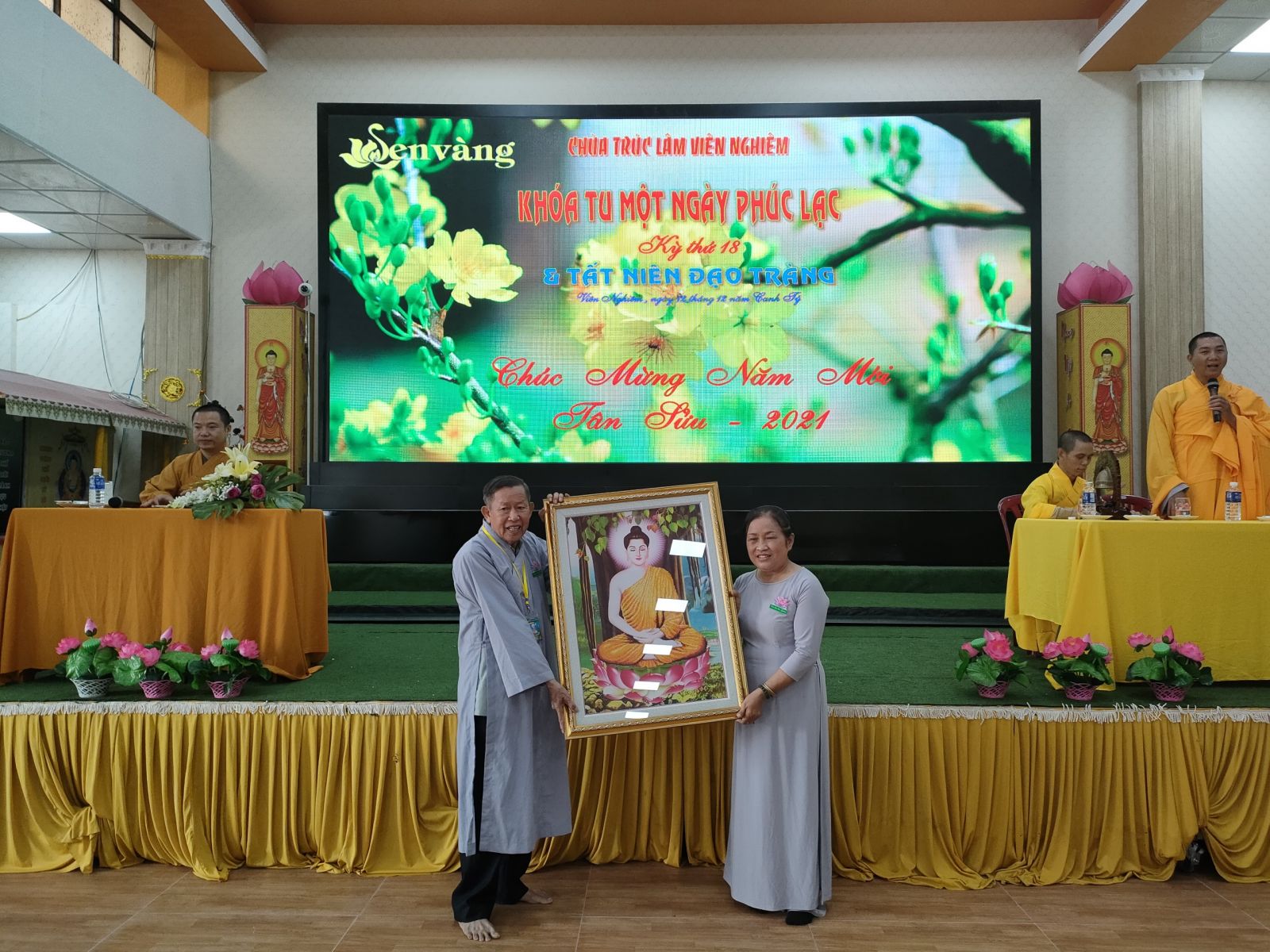 Đại diện cho phật tử đạo tràng, phật tử Lê Thị Ninh, Lê Thái Thư báo cáo công tác hoạt động và tổng kết cuối năm của đạo tràng chùa Trúc Lâm Viên Nghiêm. Trong năm 2020, các nhóm đạo tràng (Hạnh Huệ, Bình An, Tâm Hạnh, Long Bình Tân, An Bình, Tình Thương) đã phát tâm cúng dường 450.000.000 đồng. Các nhóm phật tử đã không ngừng học hỏi, trau dồi chánh pháp, thực hành chánh niệm, ứng dụng thực tiễn, hóa lời Phật dạy vào đời sống để xây dựng cho mình một cuộc sống an lành và hạnh phúc. Tính đến nay, đạo tràng chùa Viên Nghiêm hoạt động với hơn 500 phật tử, thường xuyên sinh hoạt tham gia các khóa tu "Một ngày Phúc Lạc" định kỳ hàng tháng.