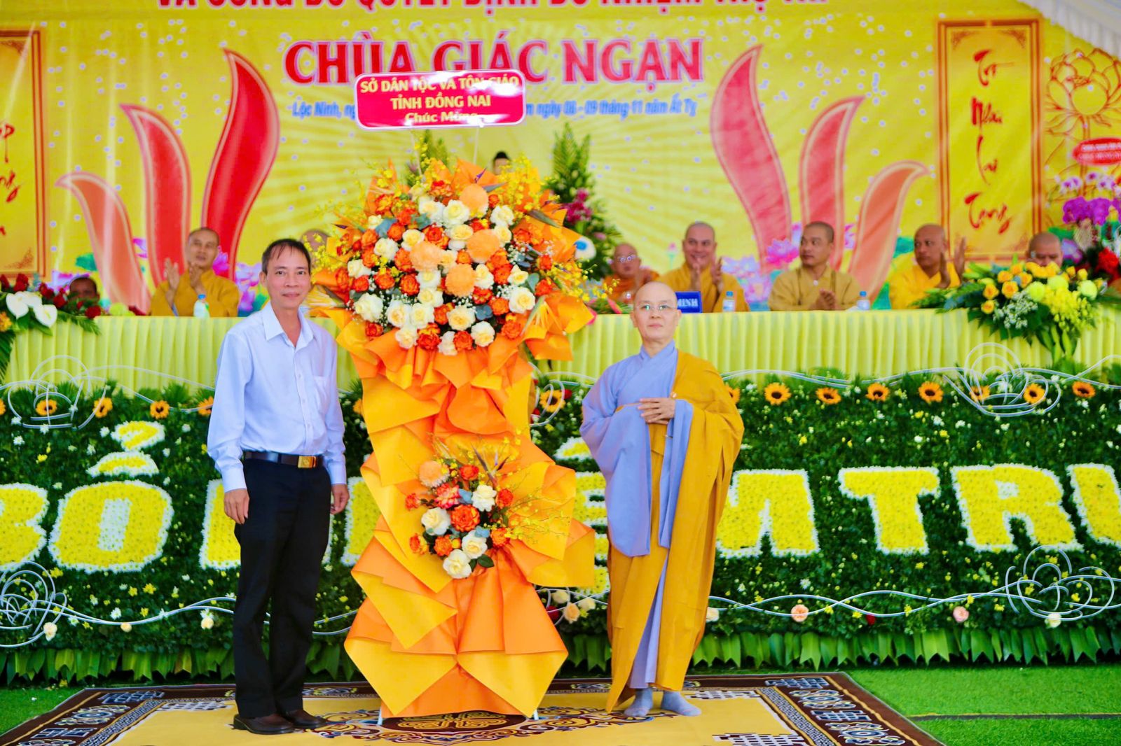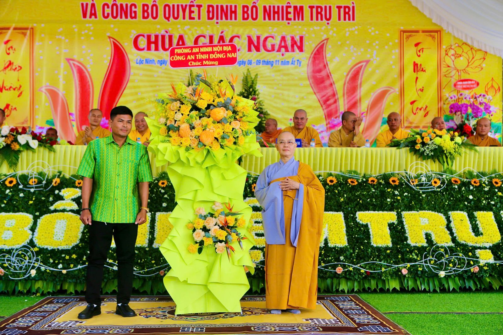 Sau lời đạo là phần chúc mừng Tân trụ trì chùa Giác Ngạn. Ni Sư Thích Nữ Từ Phước đã đón nhận những lẵng hoa tươi thắm từ Ban Trị sự GHPGVN tỉnh Đồng Nai, đại diện chính quyền các cấp và quý Phật tử gần xa gửi đến, thể hiện tấm lòng hoan hỷ và sự tin tưởng đối với trọng trách mới của Ni Sư Thích Nữ Từ Phước tại trú xứ Chùa Giác Ngạn này.