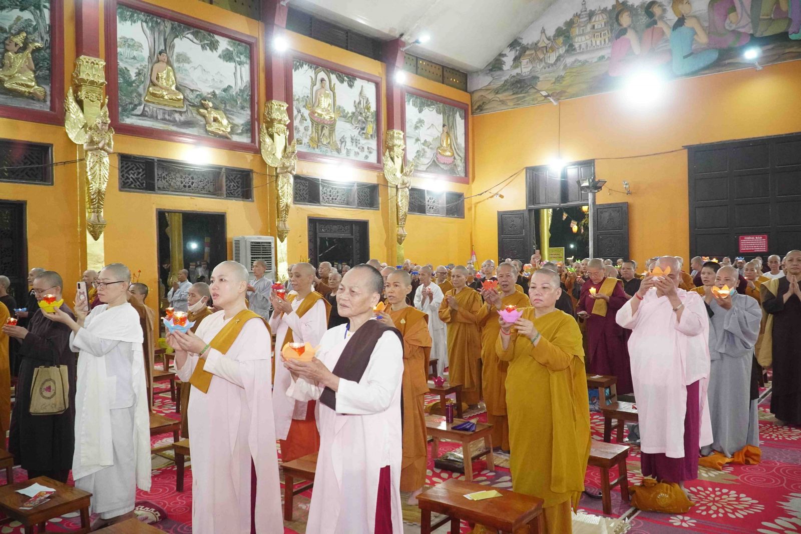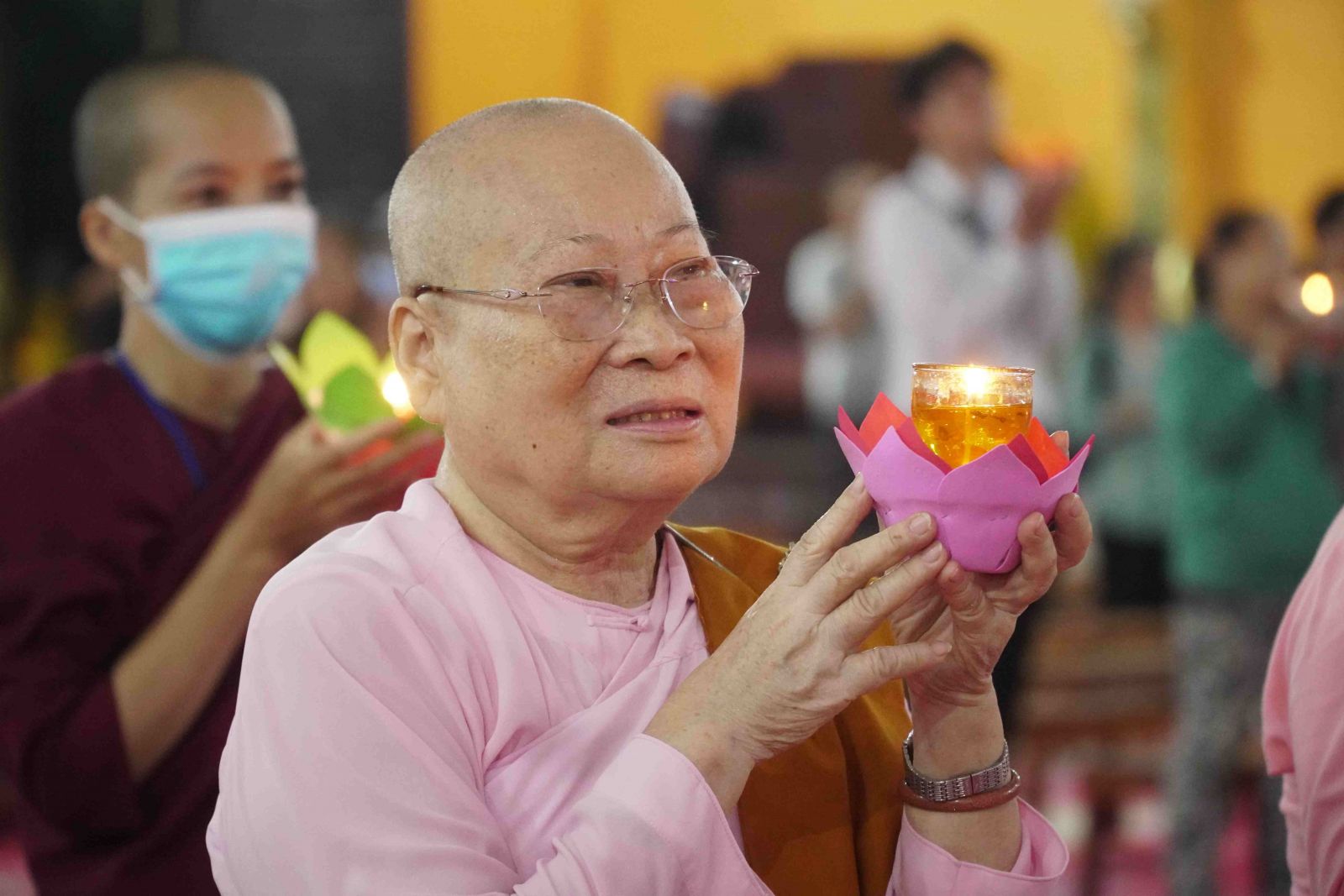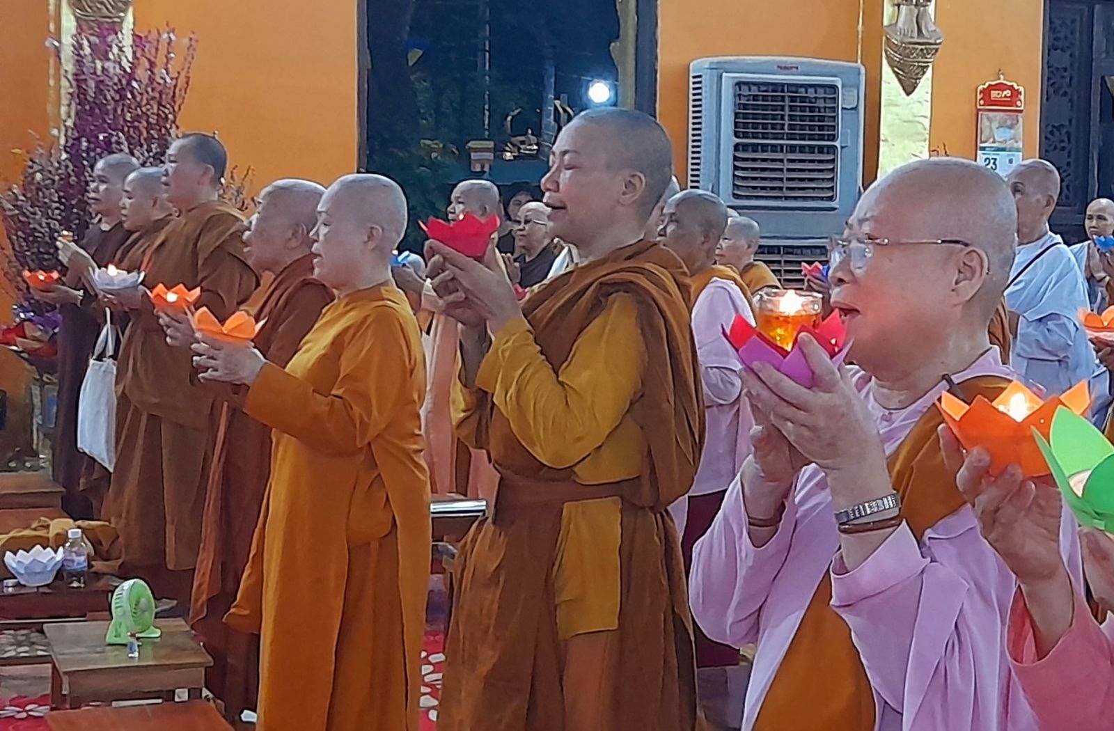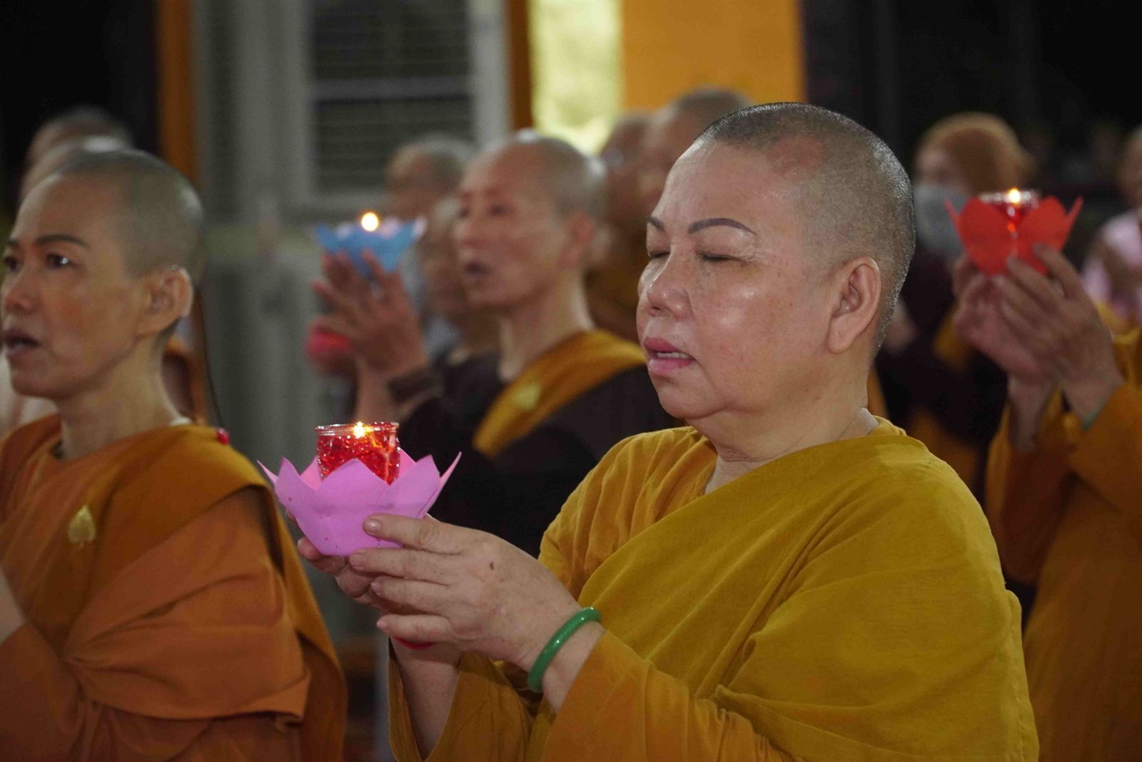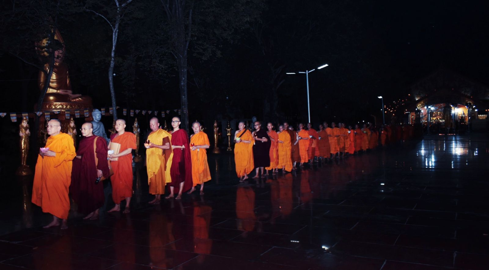 Theo sự điều phối của hòa thượng, đại chúng tụng kinh cầu an chúc phúc, dâng cúng đèn và đi nhiễu đăng từ quảng trường Bồ-Đề về chánh điện. Hòa thượng nhắn nhủ, mỗi ngọn đèn tỏa sáng lung linh đại diện cho trí tuệ. Ánh sáng của ngọn đèn xua tan u mê tăm tối luân hồi, đại chúng cần tinh tấn thắp sáng ngọn đèn trong tâm bằng tất cả sự thành kính thanh tịnh và cầu nguyện cho chính pháp luôn trường tồn.