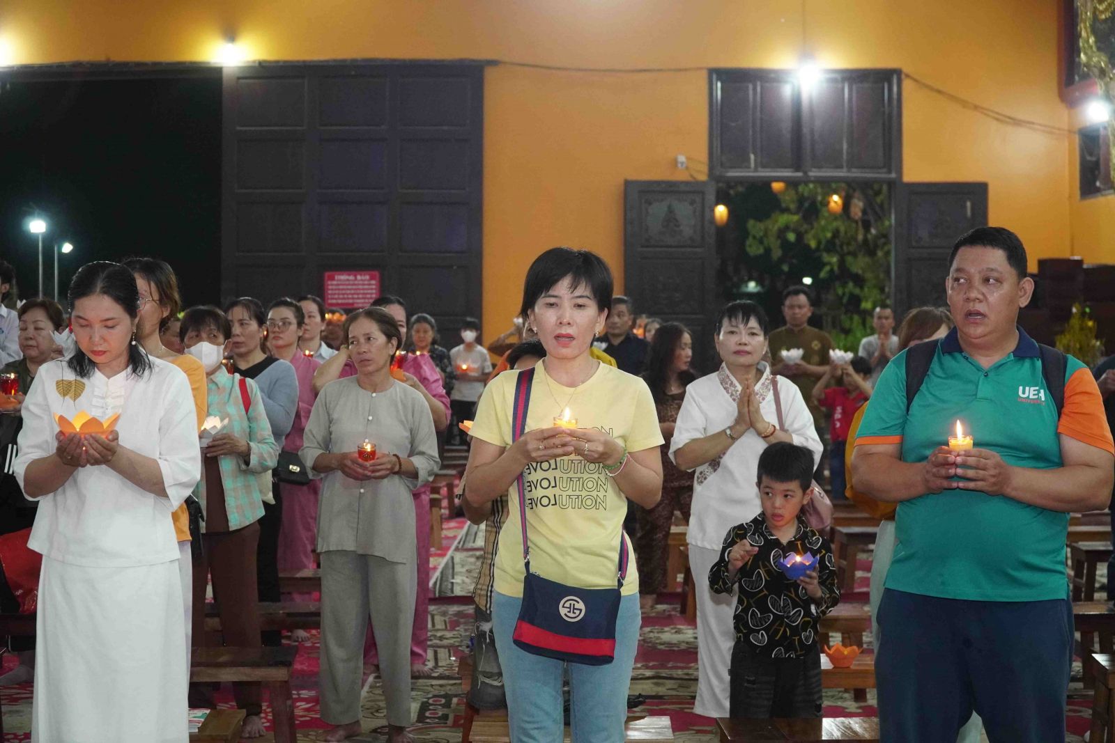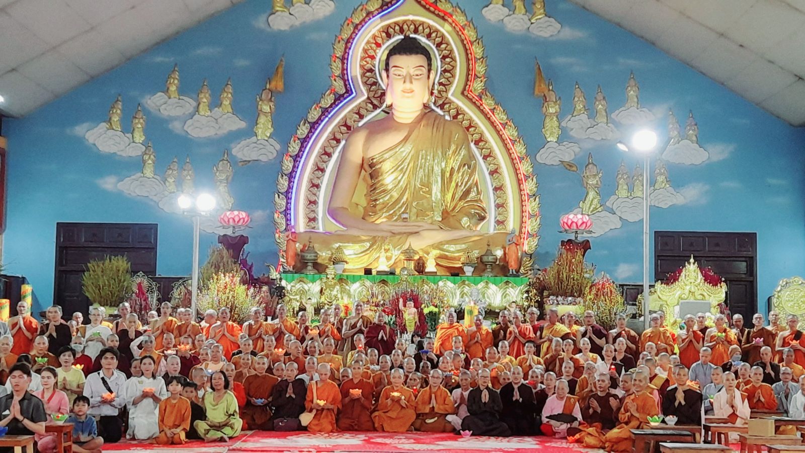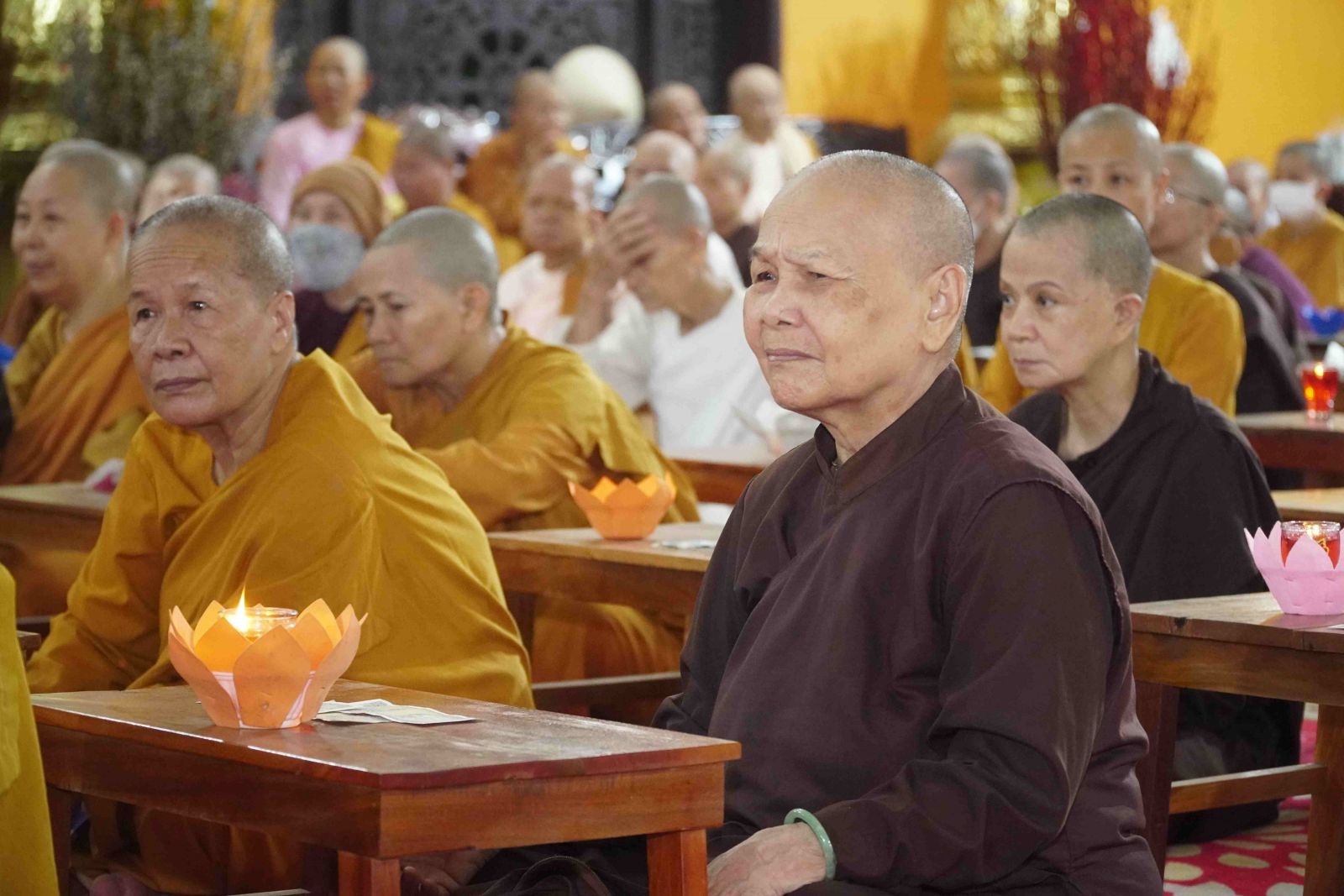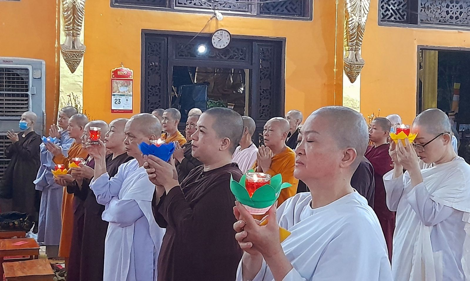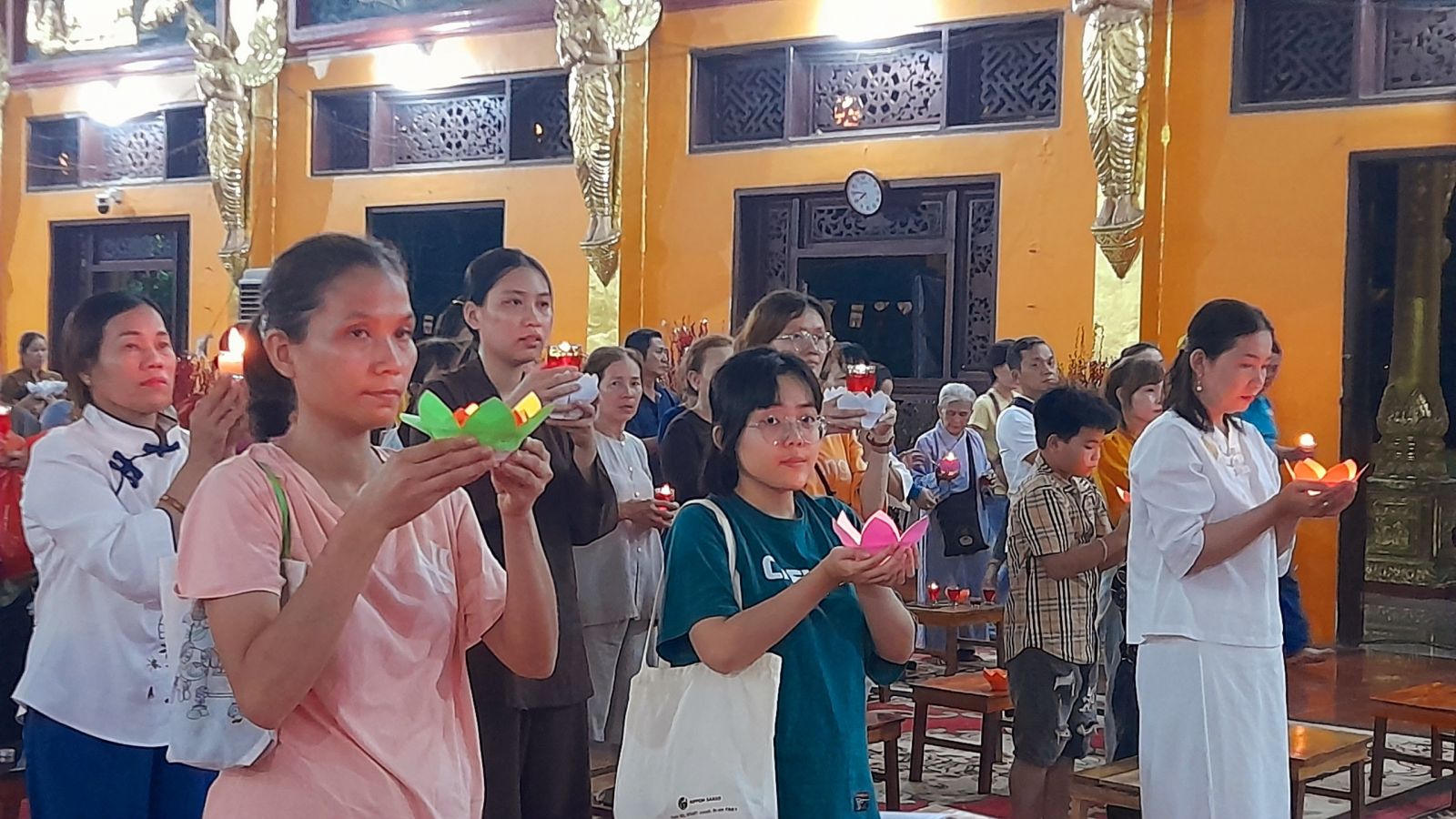 Theo sự điều phối của hòa thượng, đại chúng tụng kinh cầu an chúc phúc, dâng cúng đèn và đi nhiễu đăng từ quảng trường Bồ-Đề về chánh điện. Hòa thượng nhắn nhủ, mỗi ngọn đèn tỏa sáng lung linh đại diện cho trí tuệ. Ánh sáng của ngọn đèn xua tan u mê tăm tối luân hồi, đại chúng cần tinh tấn thắp sáng ngọn đèn trong tâm bằng tất cả sự thành kính thanh tịnh và cầu nguyện cho chính pháp luôn trường tồn.