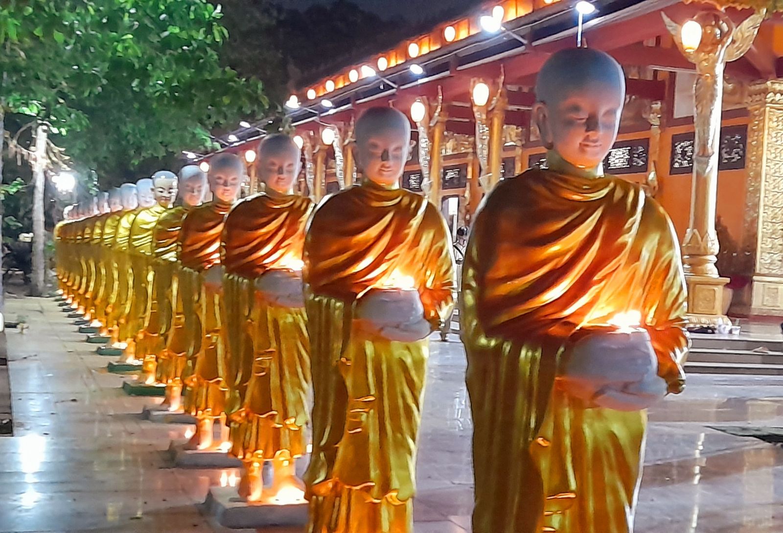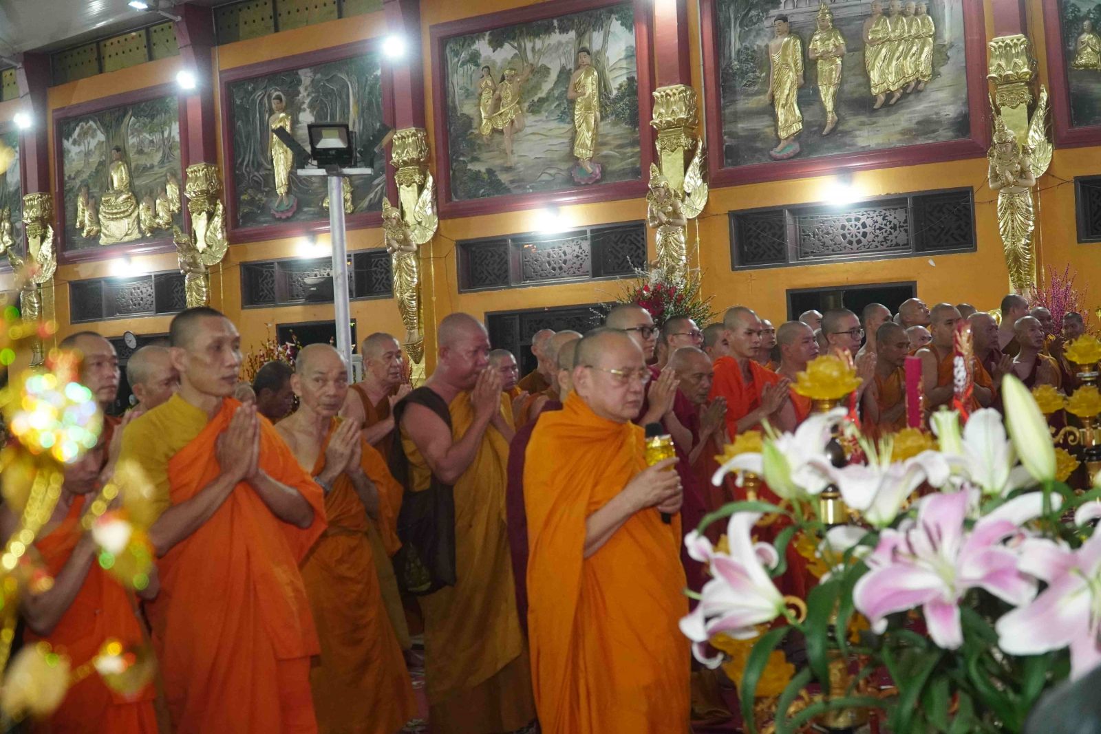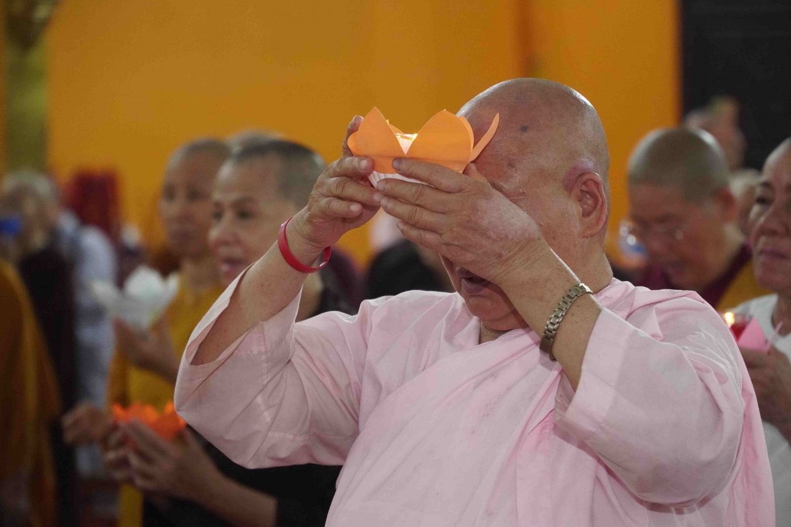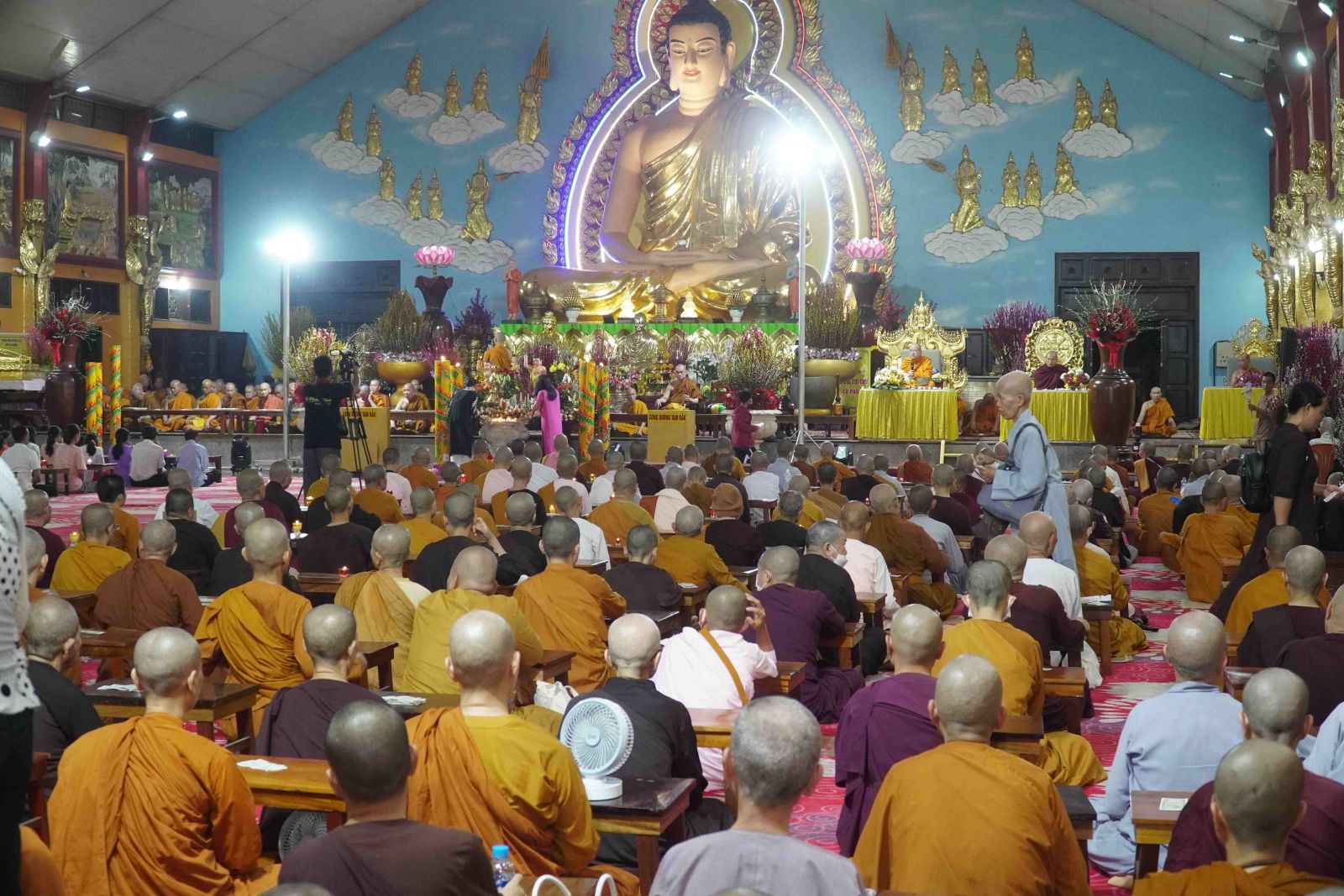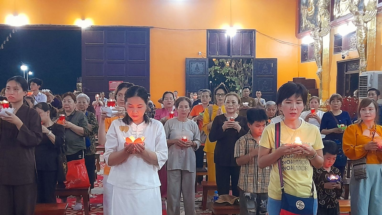 Theo sự điều phối của hòa thượng, đại chúng tụng kinh cầu an chúc phúc, dâng cúng đèn và đi nhiễu đăng từ quảng trường Bồ-Đề về chánh điện. Hòa thượng nhắn nhủ, mỗi ngọn đèn tỏa sáng lung linh đại diện cho trí tuệ. Ánh sáng của ngọn đèn xua tan u mê tăm tối luân hồi, đại chúng cần tinh tấn thắp sáng ngọn đèn trong tâm bằng tất cả sự thành kính thanh tịnh và cầu nguyện cho chính pháp luôn trường tồn.