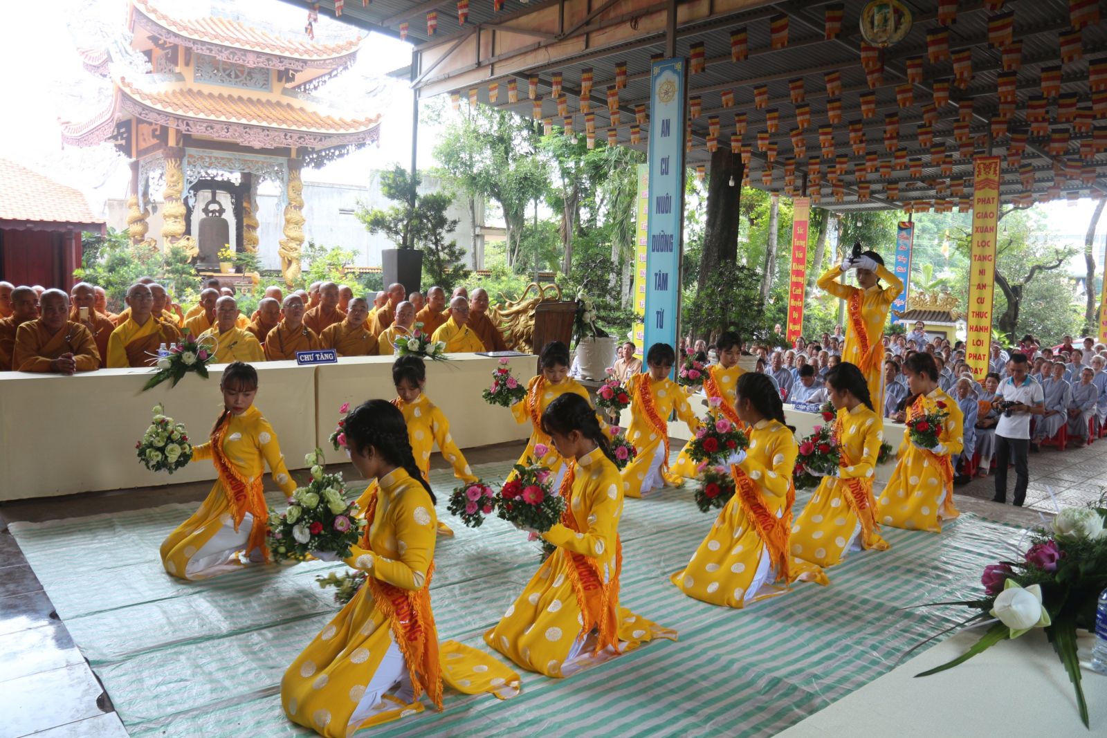 Để cúng dường lên chư Tôn Đức cũng như chào mừng quý quan khách, các em trong gia đình Phật tử đã có một tiết mục múa dâng hoa.