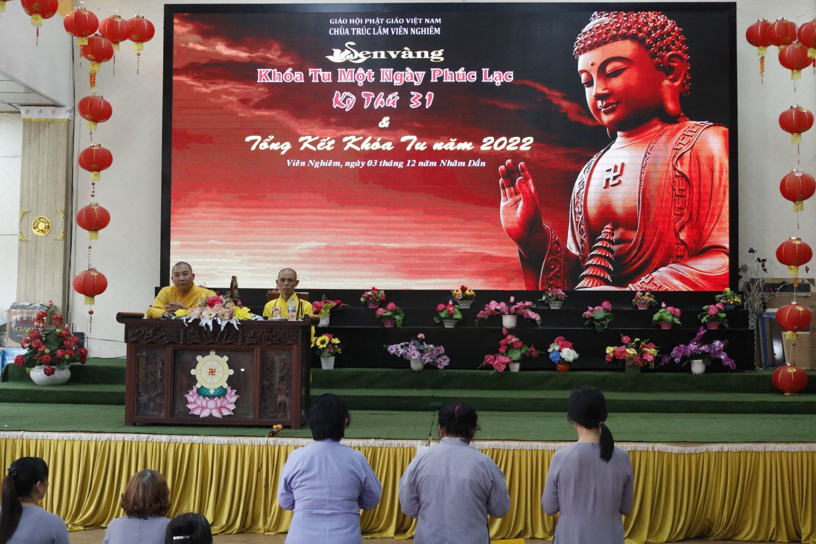Phát biểu trong buổi lễ, Đại Đức Thích Minh Hiếu – Phó trụ trì chùa Trúc Lâm Viên Nghiêm đánh giá cao về sự nỗ lực chuyên tu của các quý Phật tử và sự cống hiến phục vụ của các Ban ngành trực thuộc chùa để các chương trình Phật sự của chùa nói chung và khóa tu Một Ngày Phúc Lạc nói riêng được thành công tốt đẹp. Thầy cũng khuyên nhủ mọi người nên trân trọng nhân duyên tu học và phụng sự cùng nhau dưới mái chùa này, luôn tinh tấn và sách tấn lẫn nhau. Tại buổi lễ tổng kết, Thầy cũng đã chia sẻ về phương pháp niệm Phật, sách tấn đại chúng nỗ lực hành trì tại gia. Những câu hỏi của Phật tử cũng đã được Đại Đức giải thích cặn kẽ. Đây sẽ là hành trang cho mỗi người trong con đường tu học chánh Pháp.