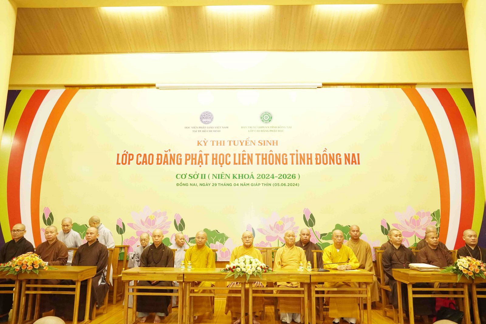 Chứng minh buổi lễ có HT. Thích Nhật Quang - Ủy viên Thường trực HĐCM, Chứng minh Ban Trị sự GHPGVN tỉnh Đồng Nai, Trưởng ban Quản Trị Thiền phái Trúc Lâm Việt Nam; HT. Thích Phước Tú – Phó ban Giáo dục Phật giáo TƯ GHPGVN, Chứng minh Ban Trị sự GHPGVN tỉnh Đồng Nai, Phó Hiệu trưởng Thường trực kiêm Chánh Thư ký trường Trung cấp Phật học tỉnh Đồng Nai; TT. Ts. Thích Huệ Khai - Ủy viên Thường trực HĐTS, Trưởng ban Ban Trị sự GHPGVN tỉnh Đồng Nai, Chủ nhiệm Lớp Cao đẳng Phật học tỉnh Đồng Nai; TT. Ts. Thích Nhật Từ - Ủy viên HĐTS, Phó Viện trưởng Thường trực Học viện Phật giáo Việt Nam tại Tp. Hồ Chí Minh; TT. Ts. Thích Quang Thạnh – Phó Viện trưởng, Tổng Thư ký Học viện Phật giáo Việt Nam tại Tp. Hồ Chí Minh; ĐĐ. Ts. Thích Lệ Ngôn – Thành viên Hội đồng Điều hành, Trưởng phòng Đào tạo Học viện Phật giáo Việt Nam tại Tp. Hồ Chí Minh; ĐĐ. Thạc sĩ. Thích Giác Thọ - Thành viên Hội đồng Điều hành, Trưởng phòng Hành chính Học viện Phật giáo Việt Nam tại Tp. Hồ Chí Minh; NS. Thích nữ Tánh Tuệ - Phó Trưởng phòng Hành chính Học viện Phật giáo Việt Nam tại Tp. Hồ Chí Minh; Đ Đ. Thích Đạt ma Quang Tuệ - Ủy viên HĐTS, Phó Chủ nhiệm Thường trực Lớp Cao đẳng Phật học Đồng Nai; TT. Ts. Thích Quảng Trí – Phó Chủ nhiệm lớp Cao đẳng Phật học Đồng Nai; Đ Đ. Thích Thiện Trí – Phó Chủ nhiệm, Chánh Thư ký lớp Cao đẳng Phật học Đồng Nai; TT. Ts. Thích Quảng Ảnh – Phó Chủ nhiệm lớp Cao đẳng Phật học Đồng Nai; cùng chư Tôn đức ban Giám Thị kỳ thi tuyển lớp Cao đẳng Phật học Đồng Nai đồng tham dự.