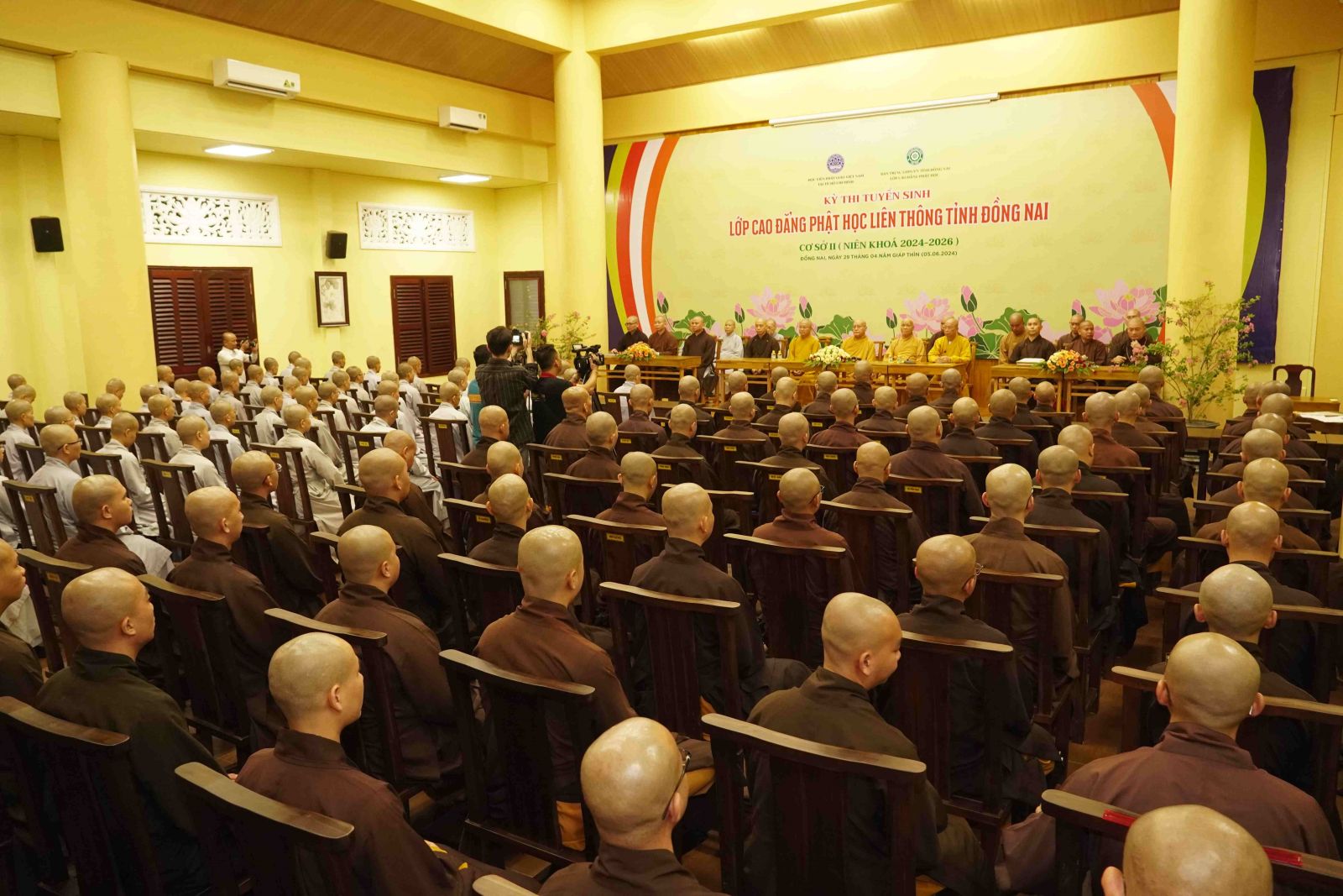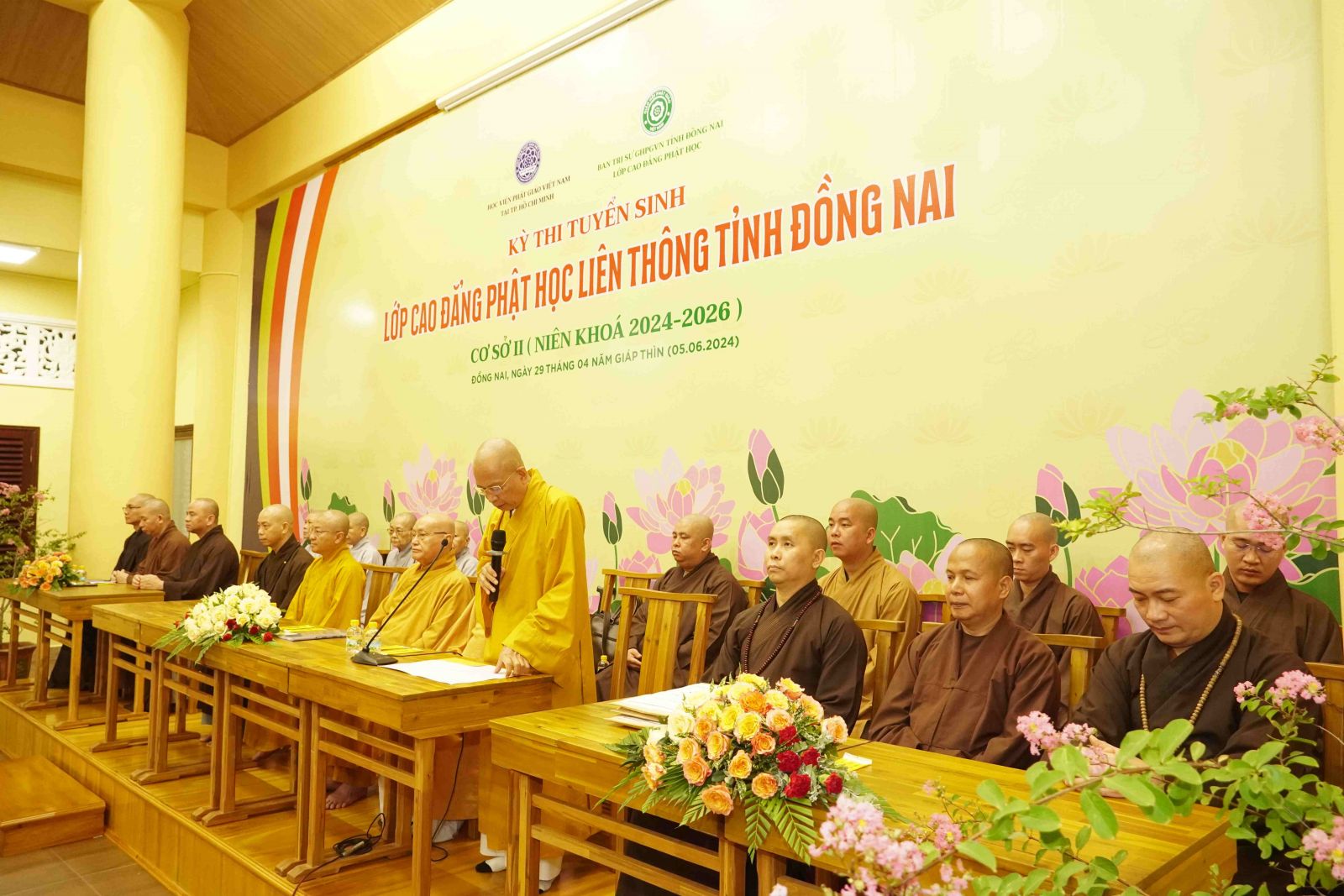 Tại buổi lễ khai mạc kỳ thi tuyển sinh, Tăng Ni sinh đã được lắng nghe những lời sách tấn quý giá của HT. Thích Nhật Quang - Ủy viên Thường trực HĐCM, Chứng minh Ban Trị sự GHPGVN tỉnh Đồng Nai, Trưởng ban Quản Trị Thiền phái Trúc Lâm Việt Nam. Ngài mong rằng, Lớp Cao đẳng Phật học mở ra giúp Tăng Ni vừa tu vừa học, tạo điều kiện thuận lợi cho Tăng Ni hệ phái, đầy là điều đáng chúc mừng cho Tăng Ni Thiền phái Trúc Lâm. Cho nên, Tăng Ni sinh cần phải nỗ lực hết mình học tập, chư Tổ chèo non lội suối, không quản gian lao khó nhọc, để tìm các bậc minh sư cầu học đạo. Mong phần nào khai mở trí tuệ, hiểu rõ đường tu và tìm về chân tâm Phật tính của chính mình, tự giác, giác tha. Đồng thời, cầu mong giải thoát, xa lìa khỏi mọi hệ lụy ràng buộc của ngũ dục, không màng danh lợi... ngày nay, Tăng Ni đã được Ban Trị sự các cấp tạo điều kiện thuận lợi cho chúng ta học tu, thì chúng ta cần phải tinh tấn học tập và tu tập.
