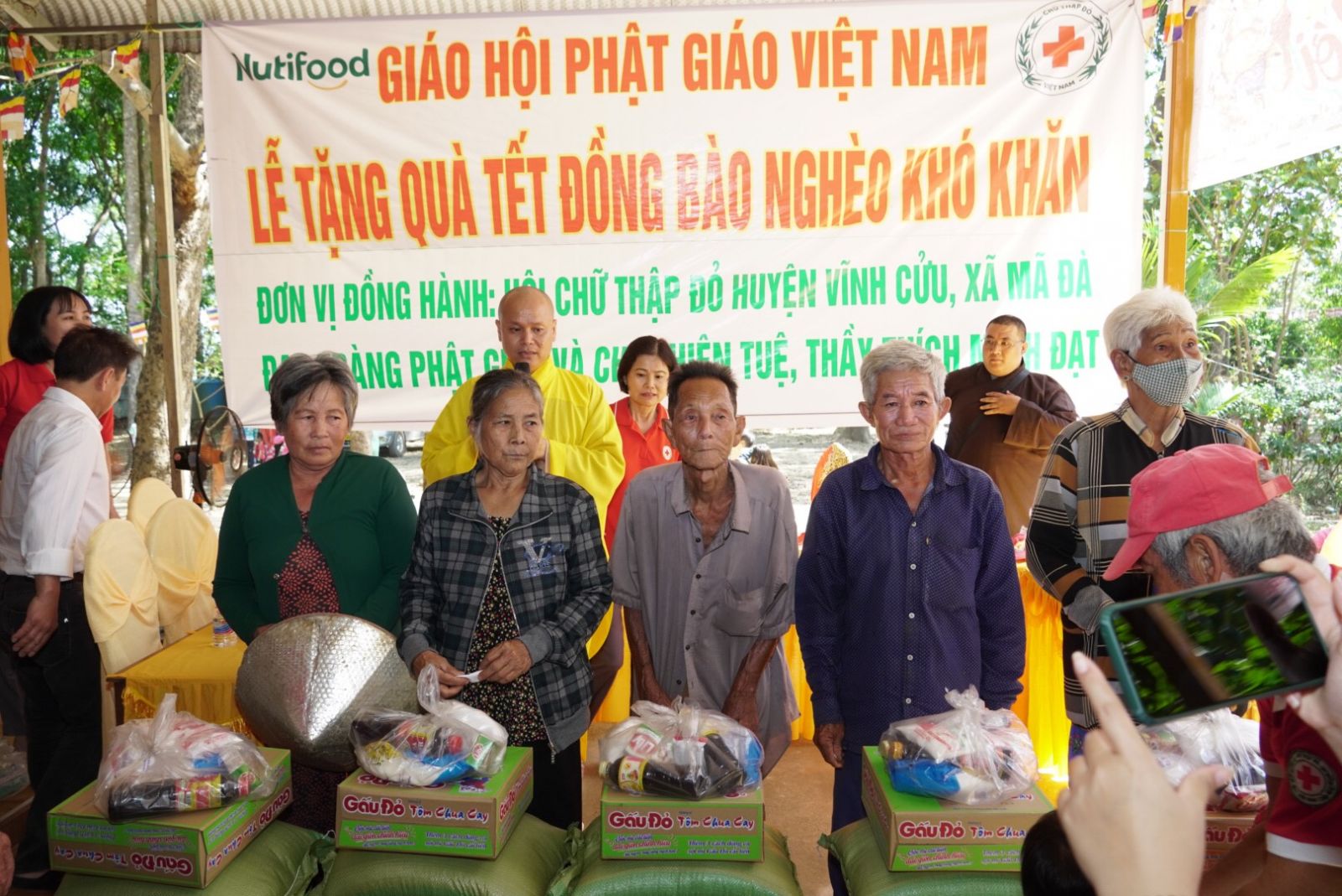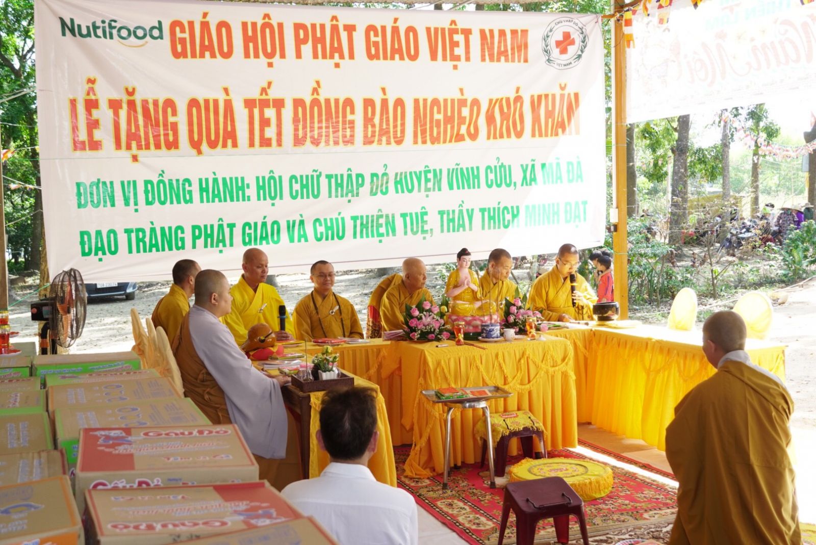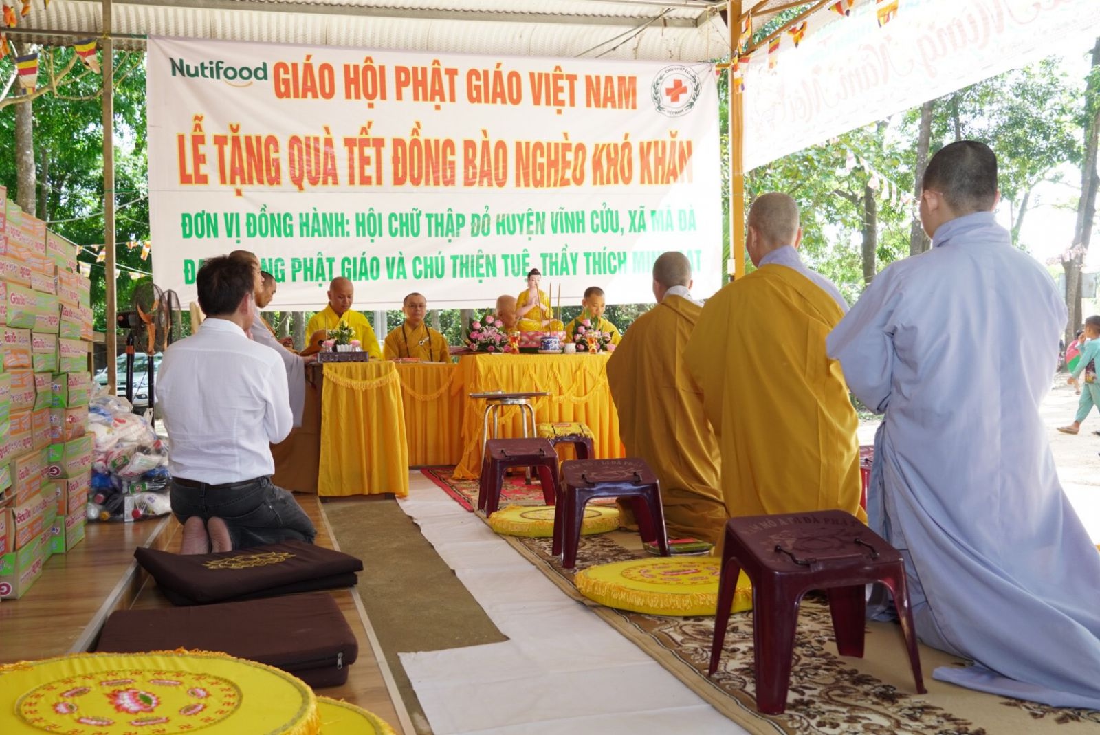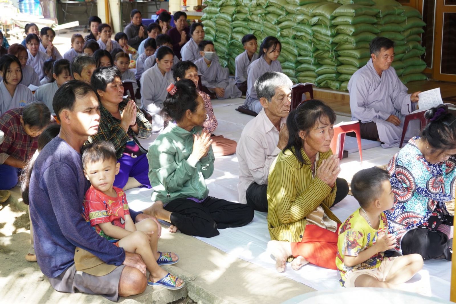 Sau nghi thức cầu nguyện, Hoà thượng chứng minh cùng chư tôn đức Tăng Ni, hội chữ thập đỏ, quý Ân nhân, quý Mạnh thường quân đã trực tiếp trao tay đến bà con những phần quà quý giá, bày tỏ sự quan tâm của đạo tràng Phật tử, của chư tôn đức đối với bà con nơi vùng đất xa xôi này.