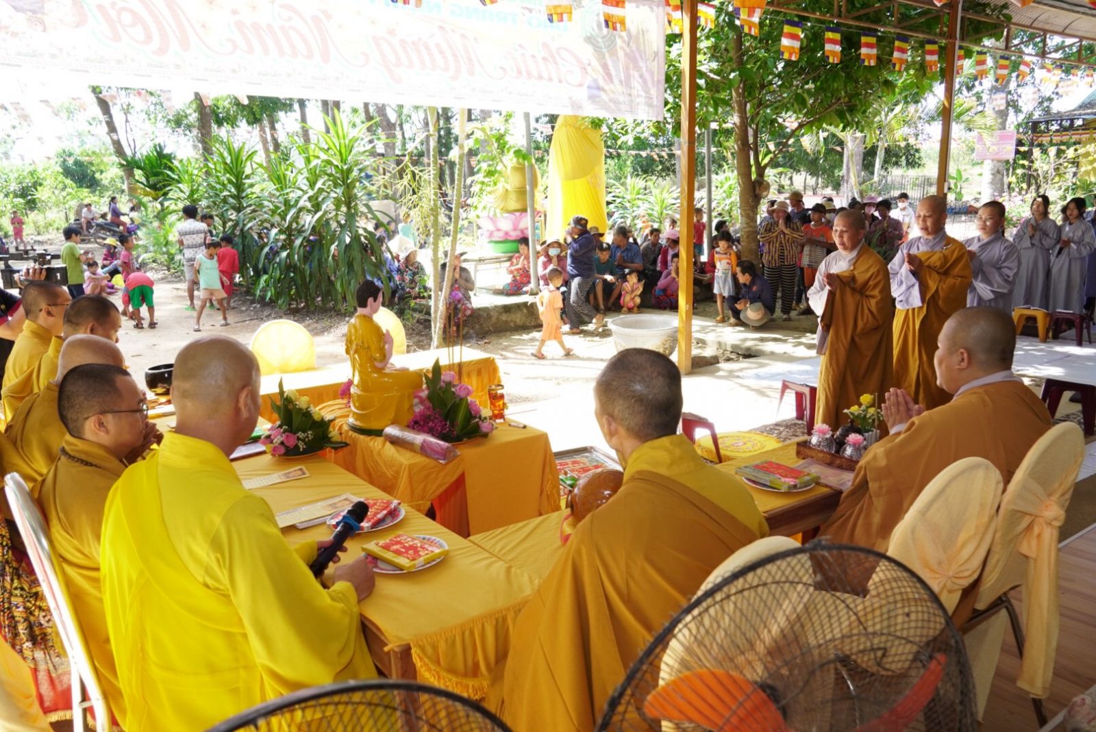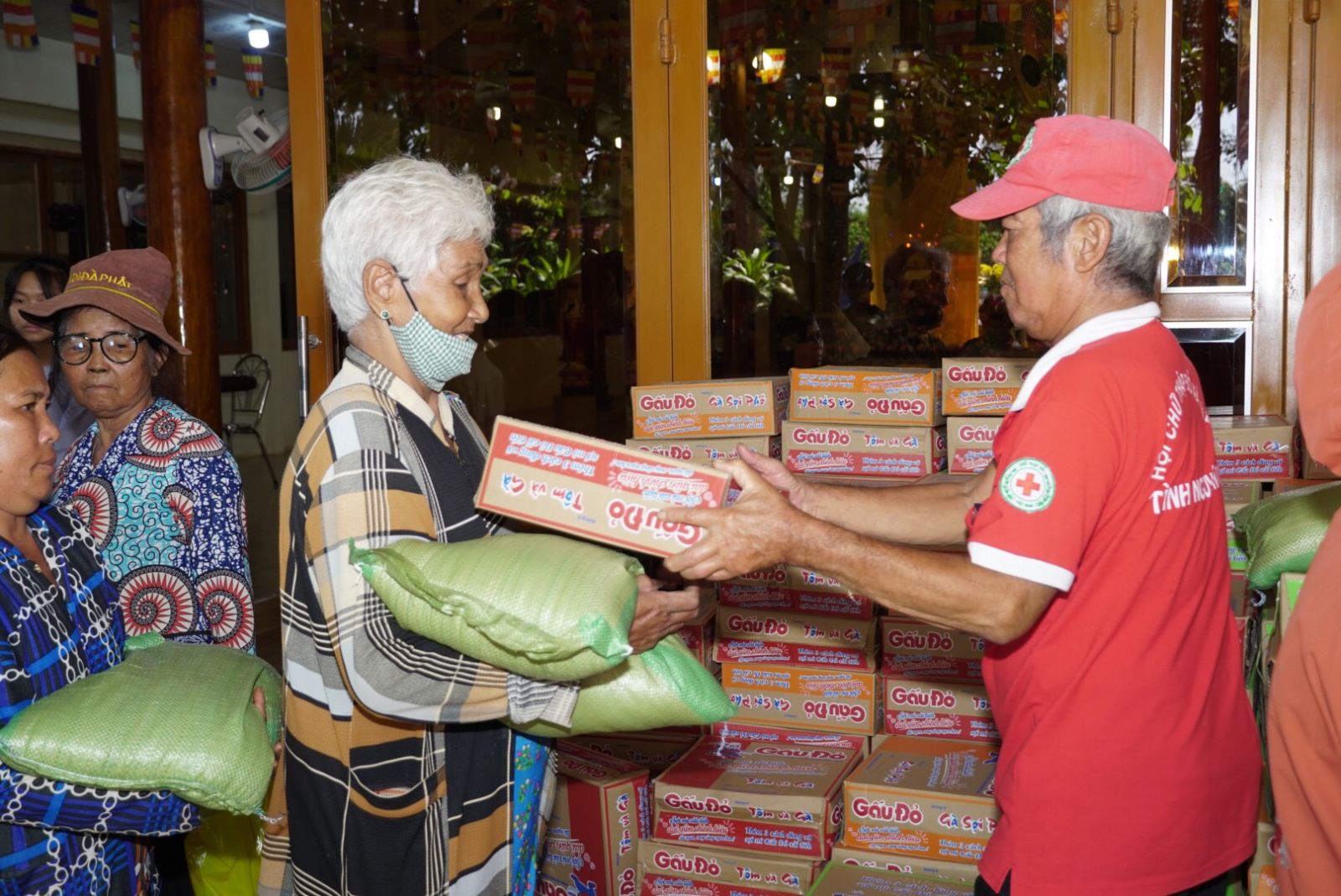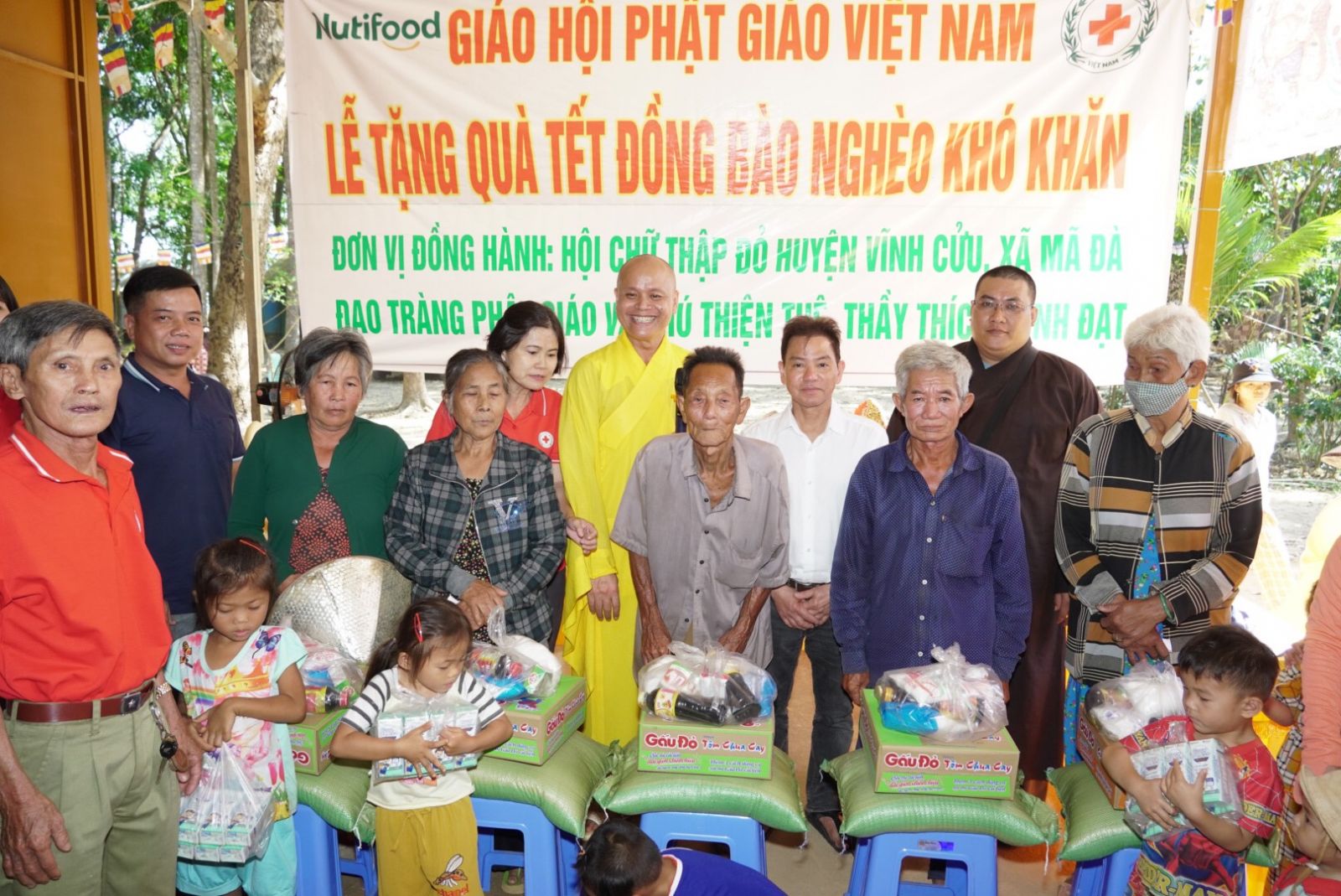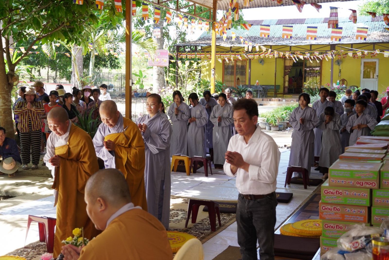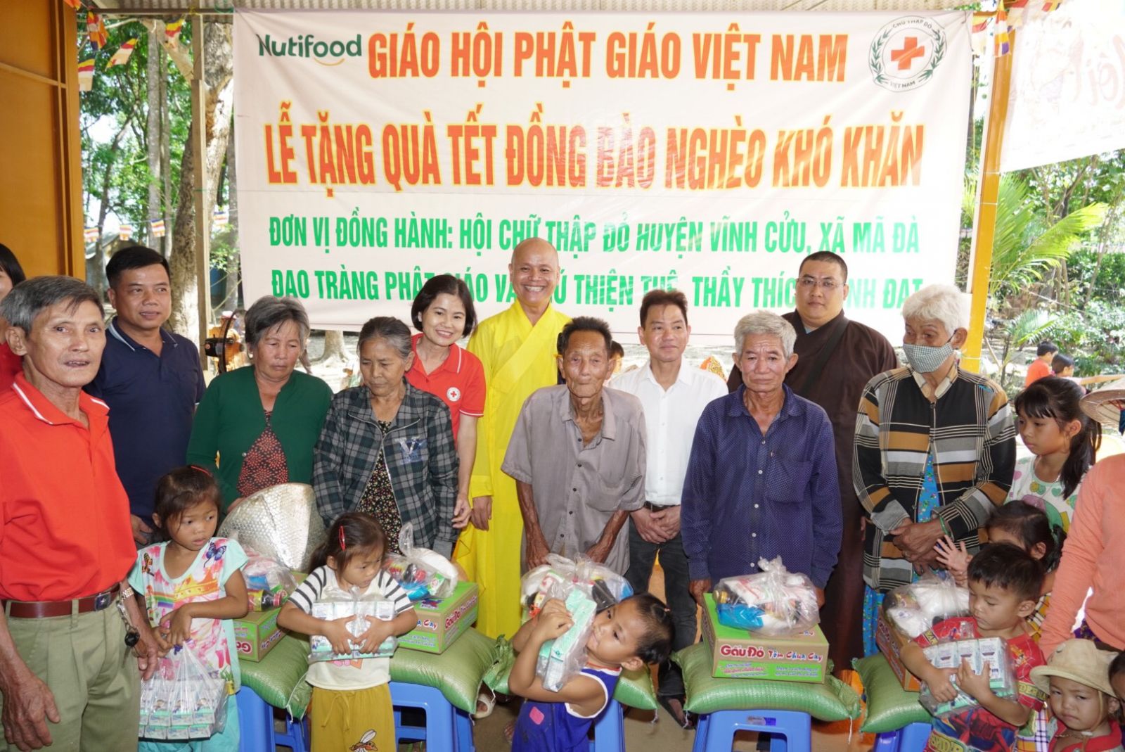 Sau nghi thức cầu nguyện, Hoà thượng chứng minh cùng chư tôn đức Tăng Ni, hội chữ thập đỏ, quý Ân nhân, quý Mạnh thường quân đã trực tiếp trao tay đến bà con những phần quà quý giá, bày tỏ sự quan tâm của đạo tràng Phật tử, của chư tôn đức đối với bà con nơi vùng đất xa xôi này.
