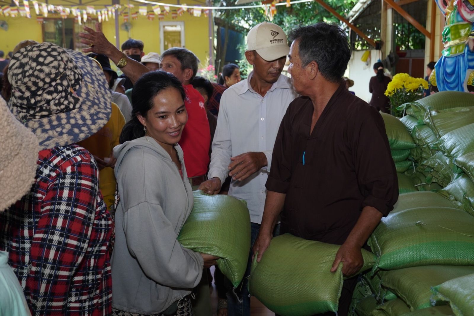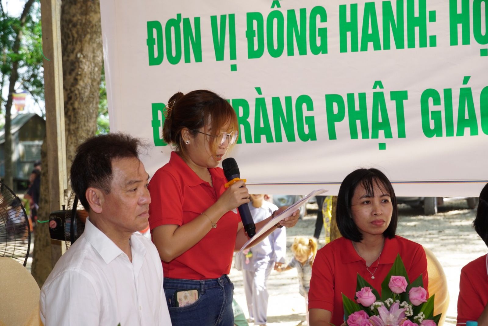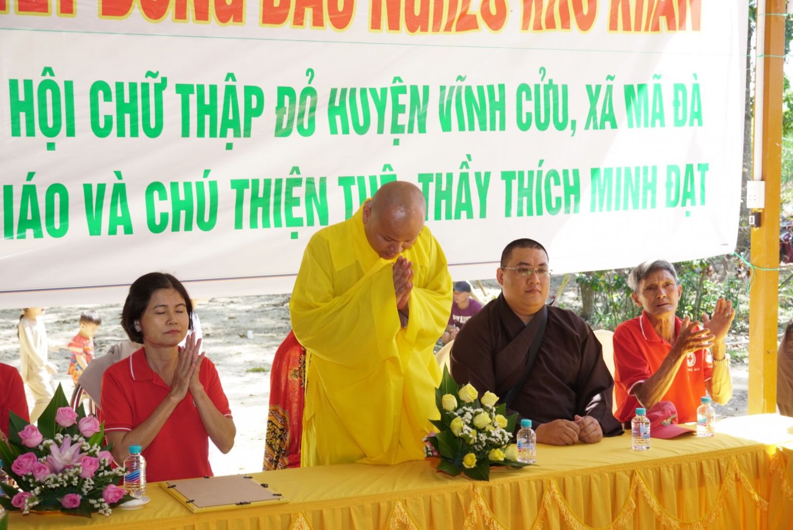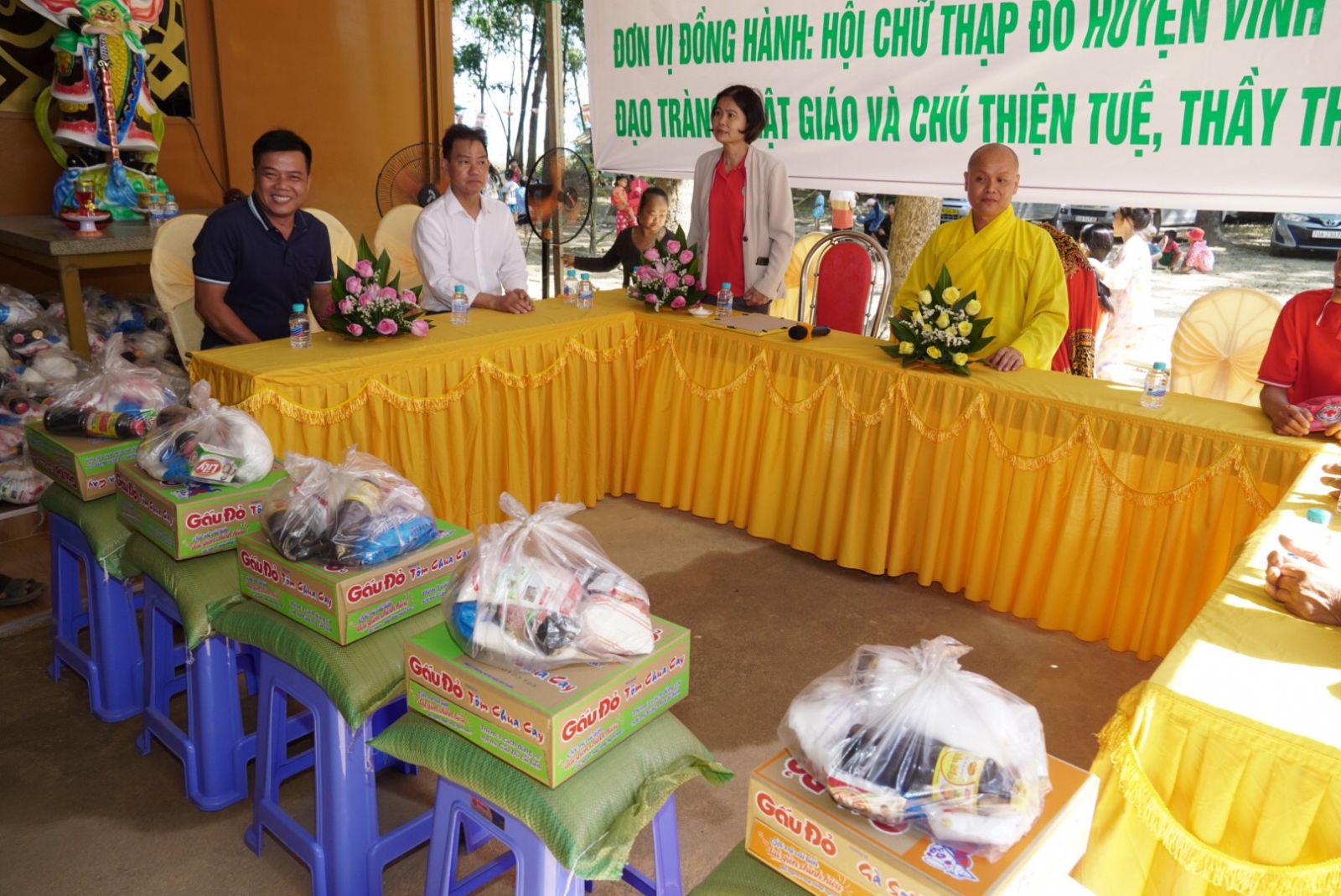 Phát tâm và trao tặng quà cho bà con tại địa phương có bà Đỗ Thị Tuyết Hồng - chủ tịch hội chữ thập đỏ huyện, ông Đặng Văn Tuấn, đạo tràng Phật giáo, Phật tử Thiện Tuệ.