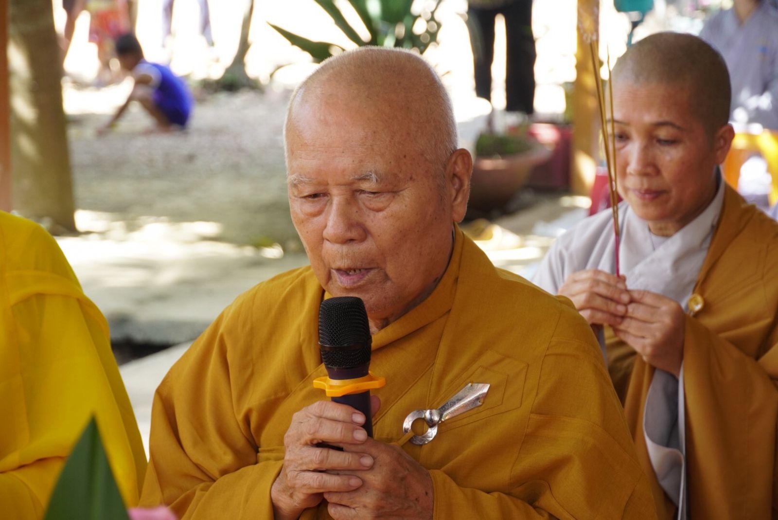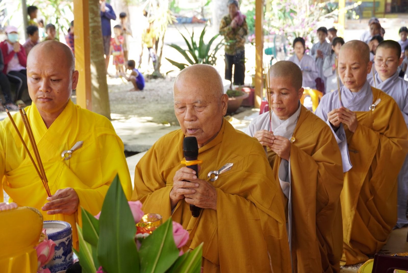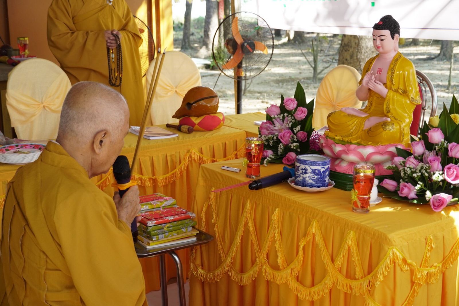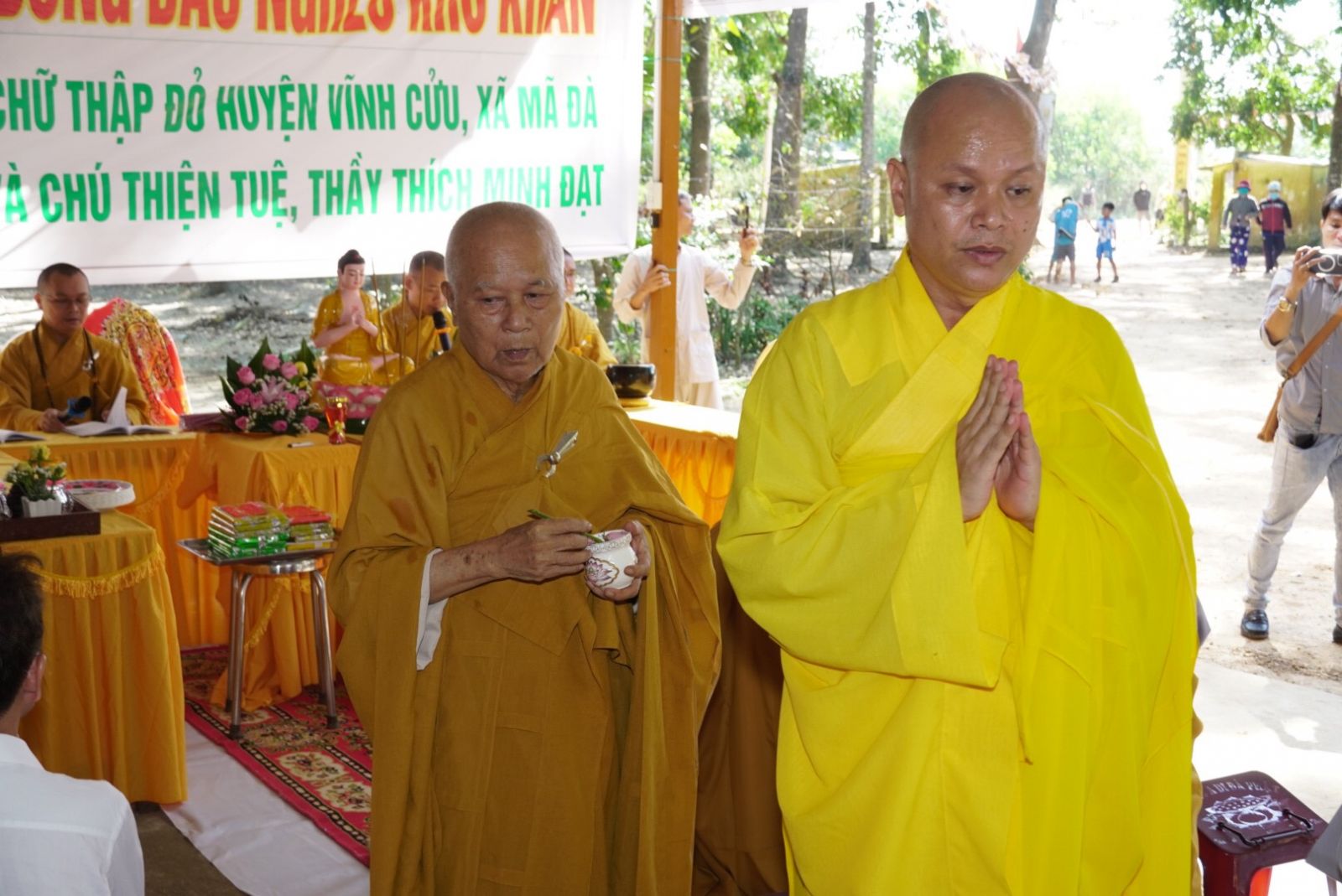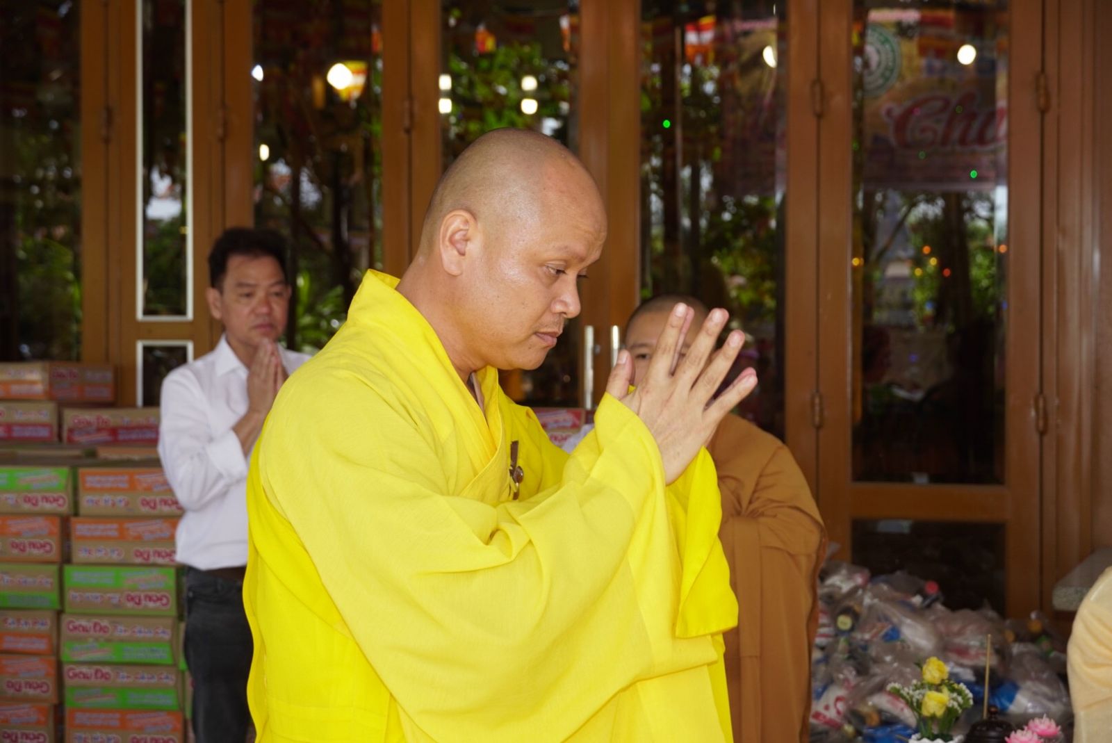 Trang nghiêm trước buổi phát quà, Hoà thượng chứng minh cùng chư tôn đức đã thực hiện nghi thức phật giáo sái tịnh và cầu nguyện cầu an cho chư tín chủ phát tâm và bà con tại địa phương.