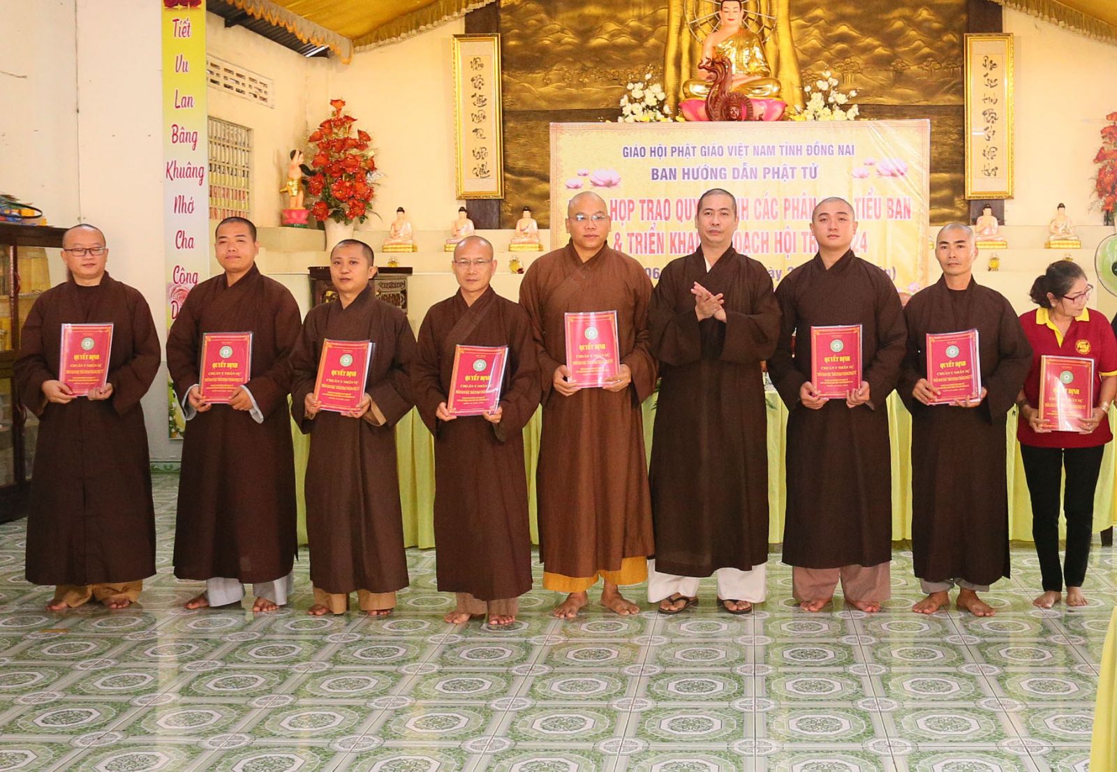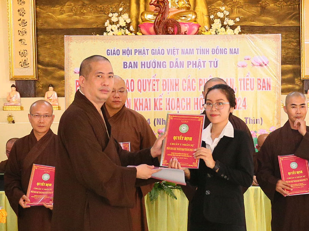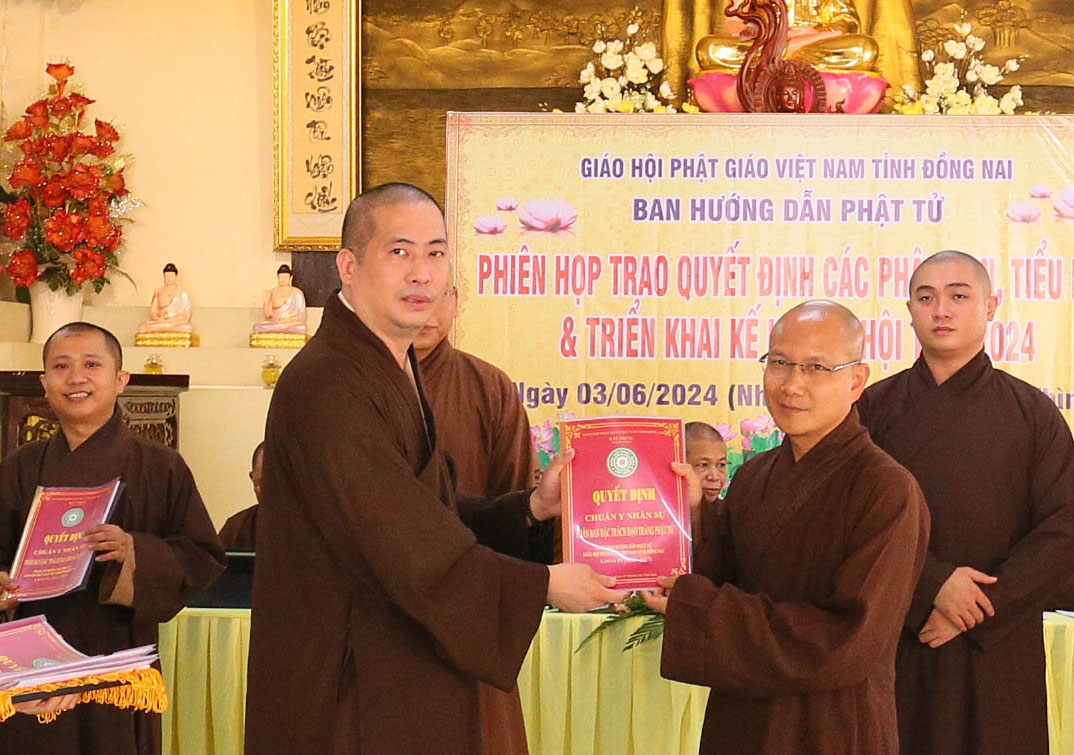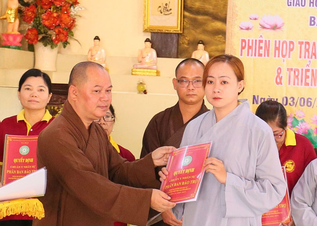 Cũng trong sáng nay, Ban HDPT tỉnh đã trao quyết định chuẩn y nhân sự cho 4 Phân ban và 3 Tiểu ban, gồm: Phân ban Tổ chức Sự kiện – Khóa tu; Phân ban Đặc trách Đạo tràng Phật tử, do đại đức Thích Thiện Pháp làm trưởng Phân ban; Phân ban Bảo trợ do Đại đức Thích Thiện Đạo làm trưởng Phân ban; Phân ban Chuyên nghiệp Phật tử do Đại đức Thích Quảng Minh là Trưởng Phân ban; Tiểu ban Đạo tràng Khất sĩ do Sư cô Thích nữ Liên Nhu làm Trưởng Tiểu ban; Tiểu ban Phật tử Nam tông Khmer do Đại đức Thích Chơn Trí làm Trưởng Tiểu ban; Tiểu ban Phật tử Nam tông Kinh do Đại đức Thích Tịnh Hạnh làm Trưởng Tiểu ban.