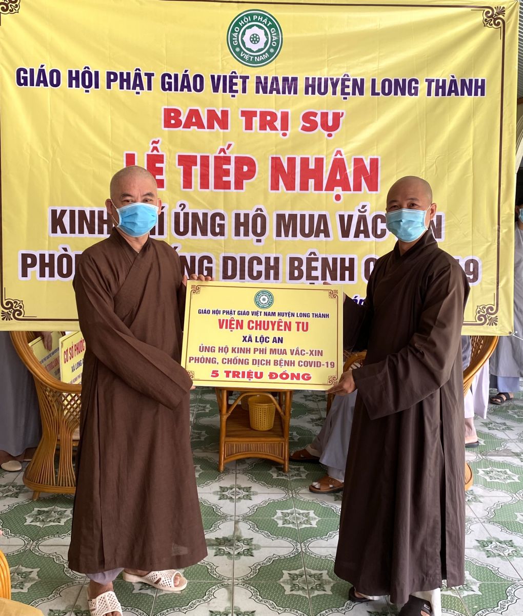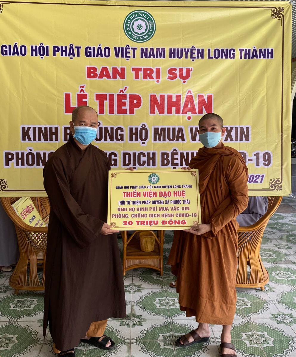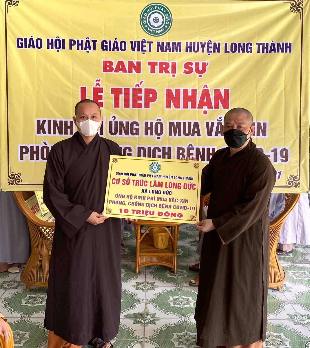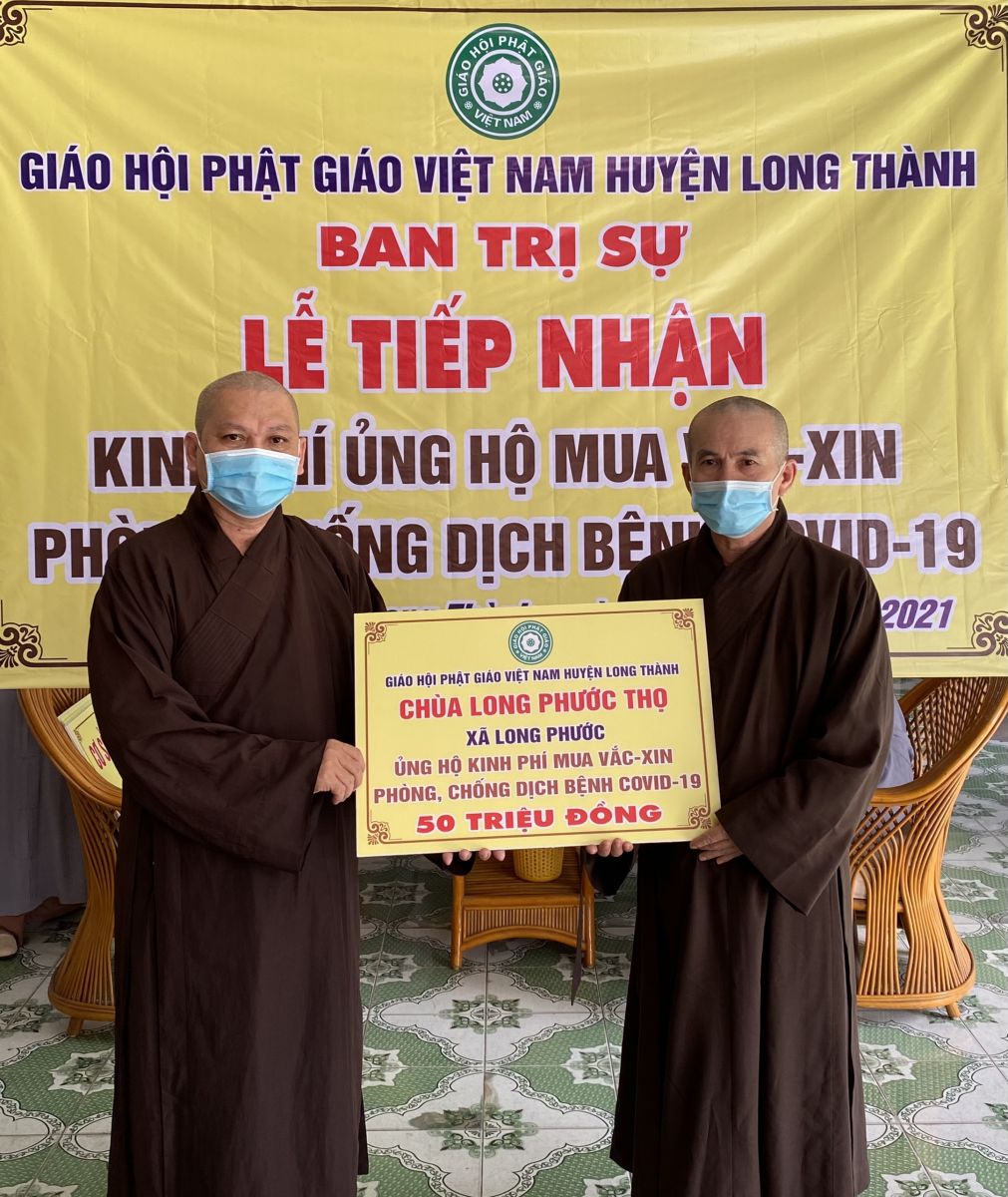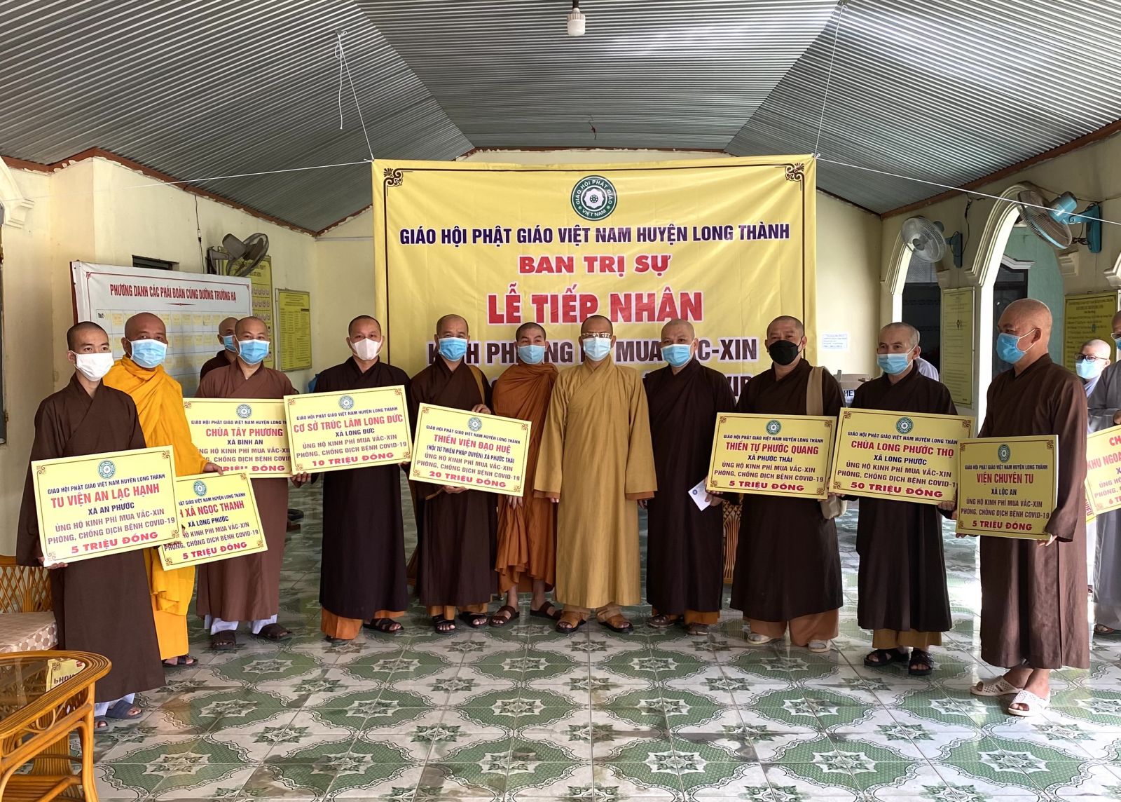 Tại buổi lễ, số tiền đóng góp nhận được các đơn vị, cơ sở Phật giáo trong huyện 350.000.000 đồng. Trước đó, viện chuyên tu xã Lộc An (Long Thành) đã ủng hộ 150.000.000 đồng; chùa Long Phước Thọ (xã Long Phước) ủng hộ 50.000.000 đồng (đã chuyển cho Ủy ban Mặt trận Tổ quốc Việt Nam tỉnh Đồng Nai); Thiền tự Phước Quang (xã Phước Thái) ủng hộ 30.000.000 đồng; Tu viện Hạnh Chiếu ủng hộ 30.000.000 đồng cho Ủy ban Mặt trận Tổ quốc Việt Nam huyện Long Thành.